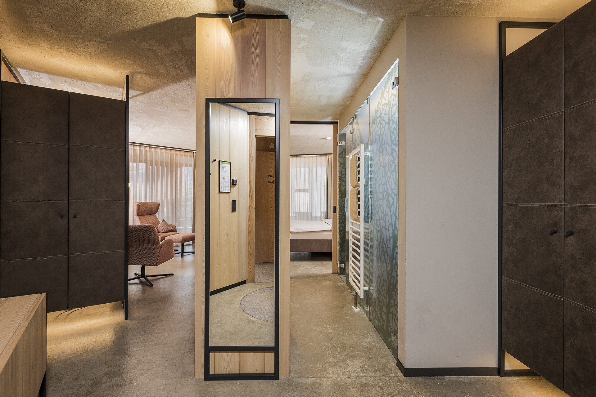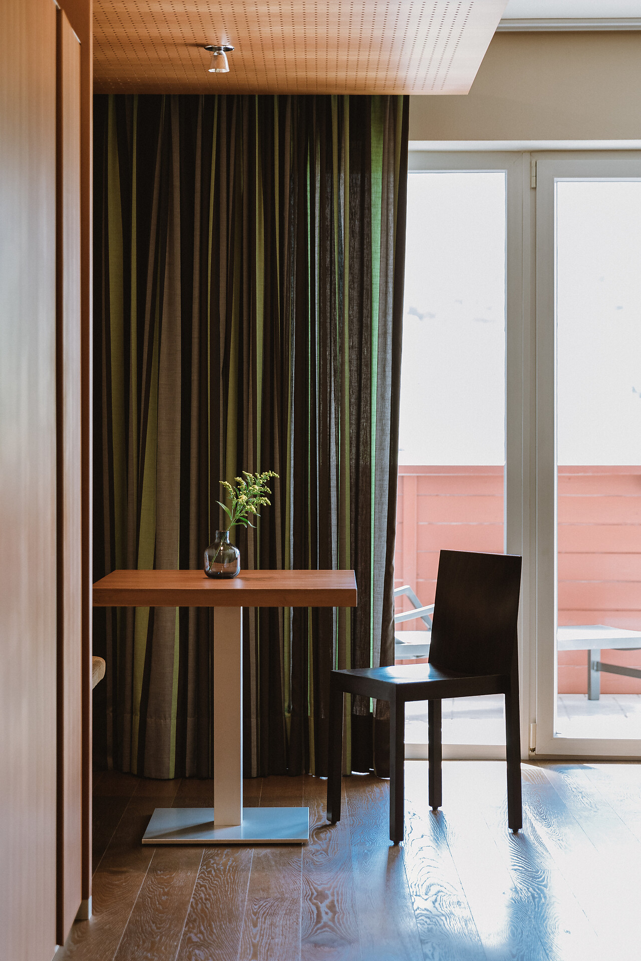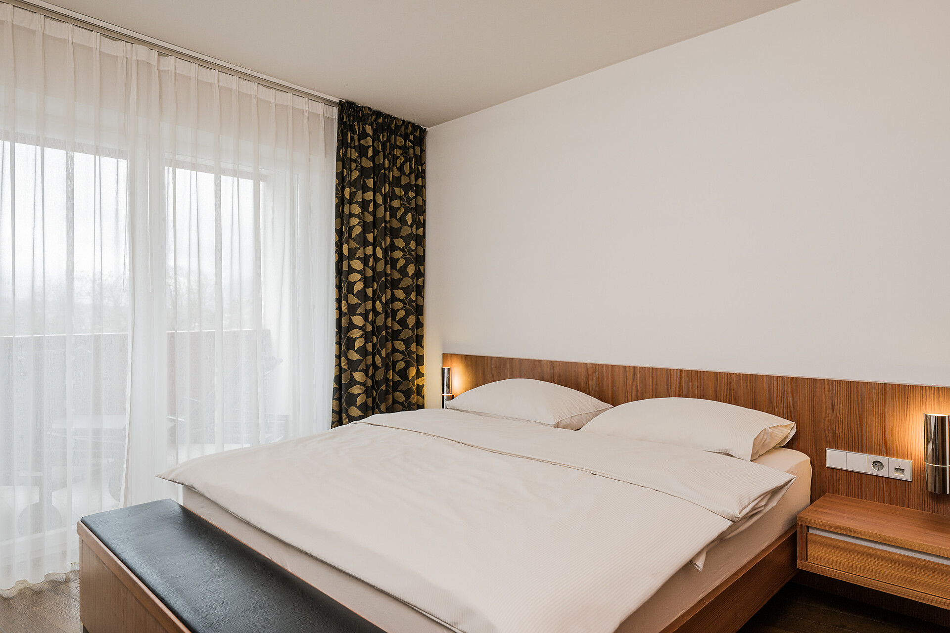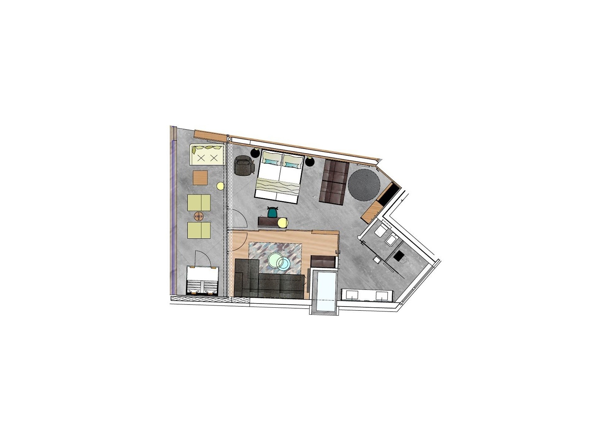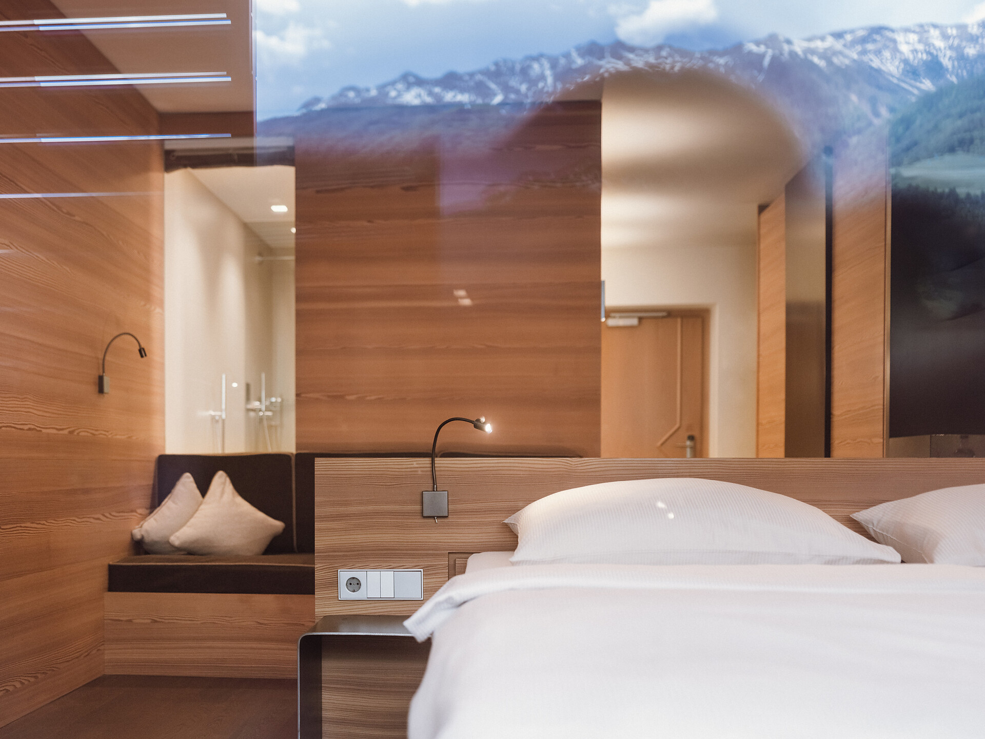 Black & White Suite (70 m², 2-4 Personen): Luxussuite im 5. Stock, geräumiger Wohn-Schlafraum, luxuriöse Couch, Sitzecke, Massagestuhl, abgetrenntes Kinderschlafzimmer mit Stockbetten, Marmorboden, Bad mit Dusche und Badewanne, separates-WC, Flat-TV, gratis W-Lan, Minibar, Safe, offener Kamin, Süd-Ost Terrasse von 40m² mit Panorama-Bio-& Finnische Sauna, Tauchbecken, Kuschelliege, Garage