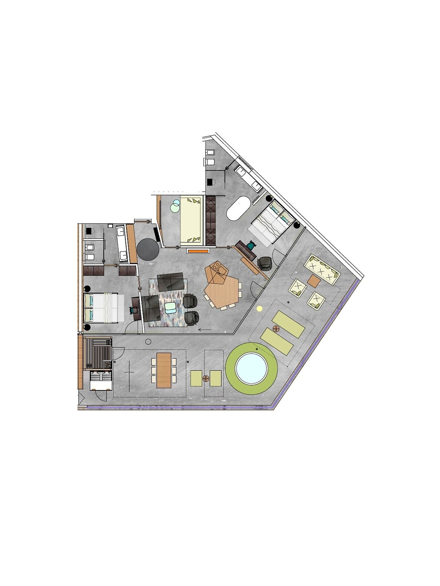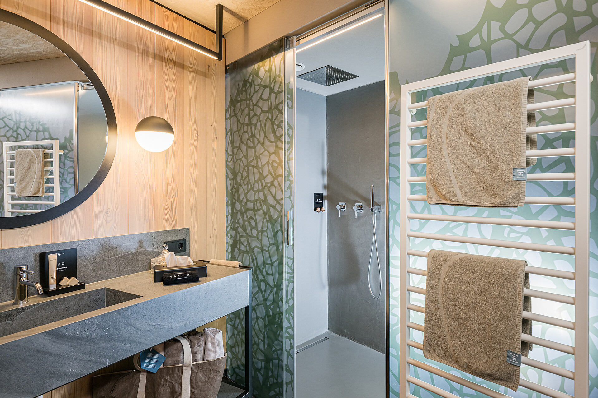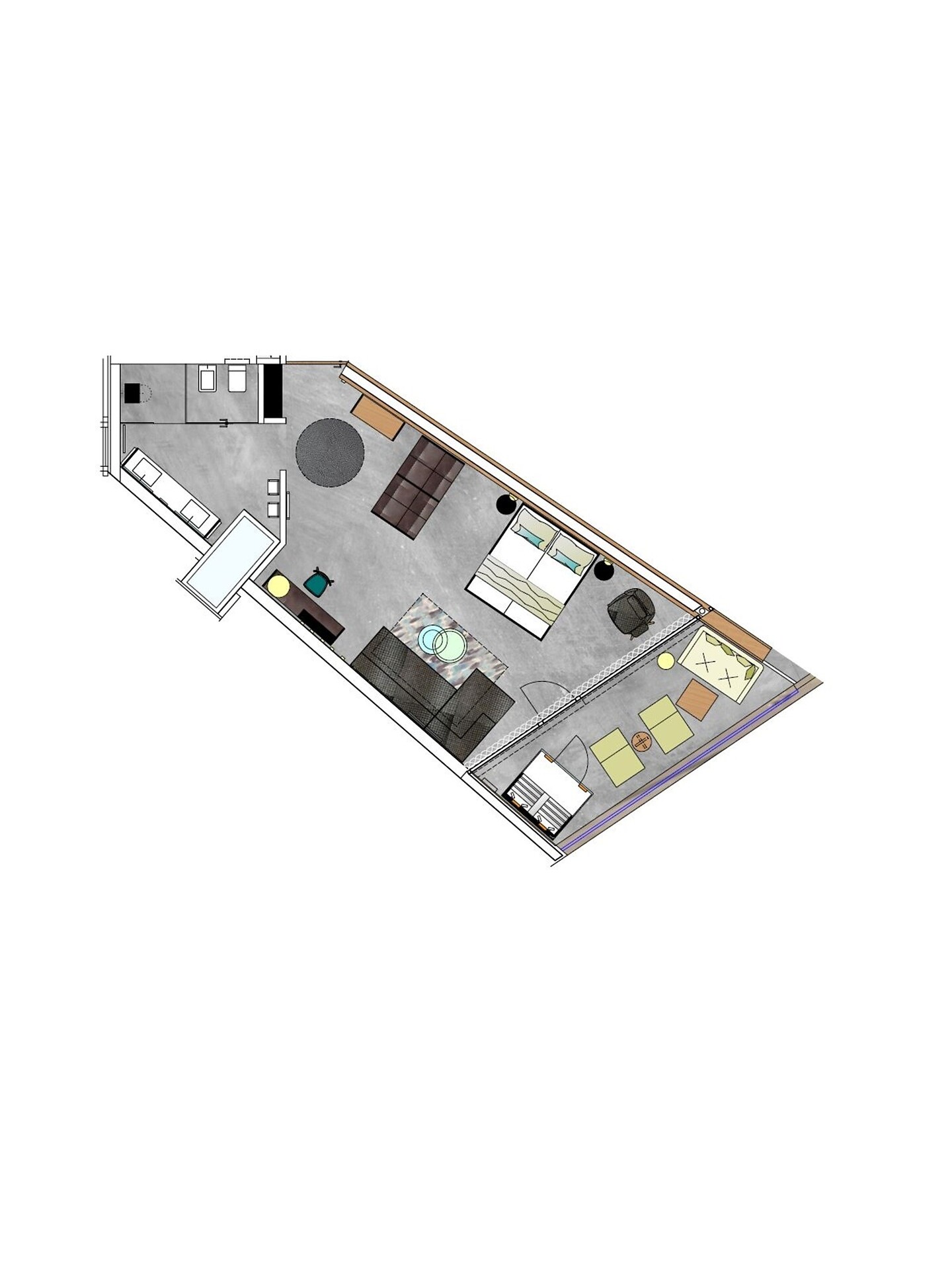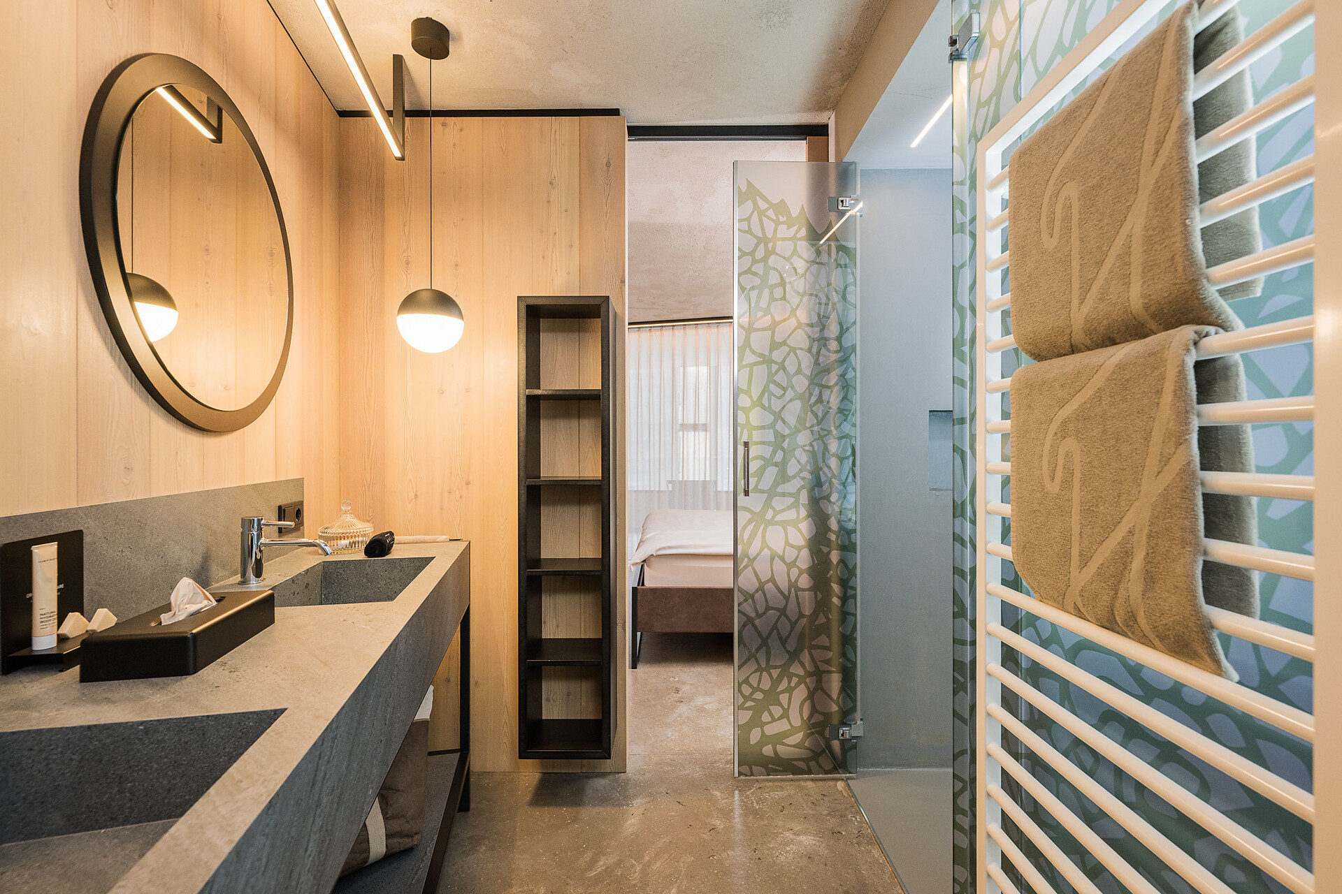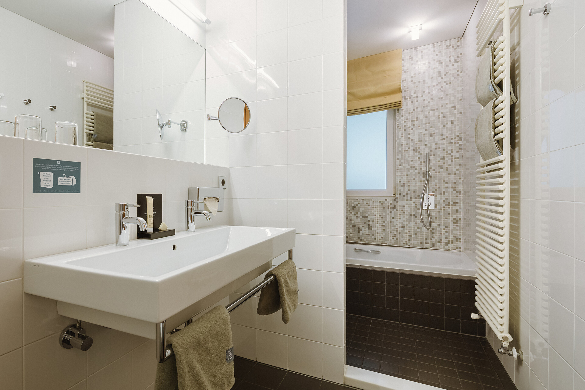 Black & White Suite (70 m², 2-4 Personen): Luxussuite im 5. Stock, geräumiger Wohn-Schlafraum, luxuriöse Couch, Sitzecke, Massagestuhl, abgetrenntes Kinderschlafzimmer mit Stockbetten, Marmorboden, Bad mit Dusche und Badewanne, separates-WC, Flat-TV, gratis W-Lan, Minibar, Safe, offener Kamin, Süd-Ost Terrasse von 40m² mit Panorama-Bio-& Finnische Sauna, Tauchbecken, Kuschelliege, Garage
