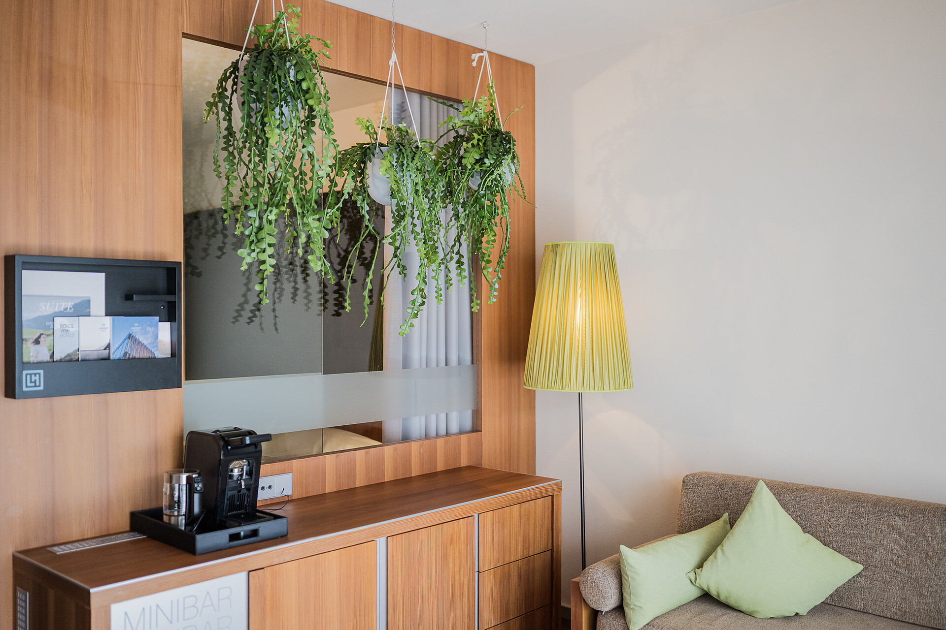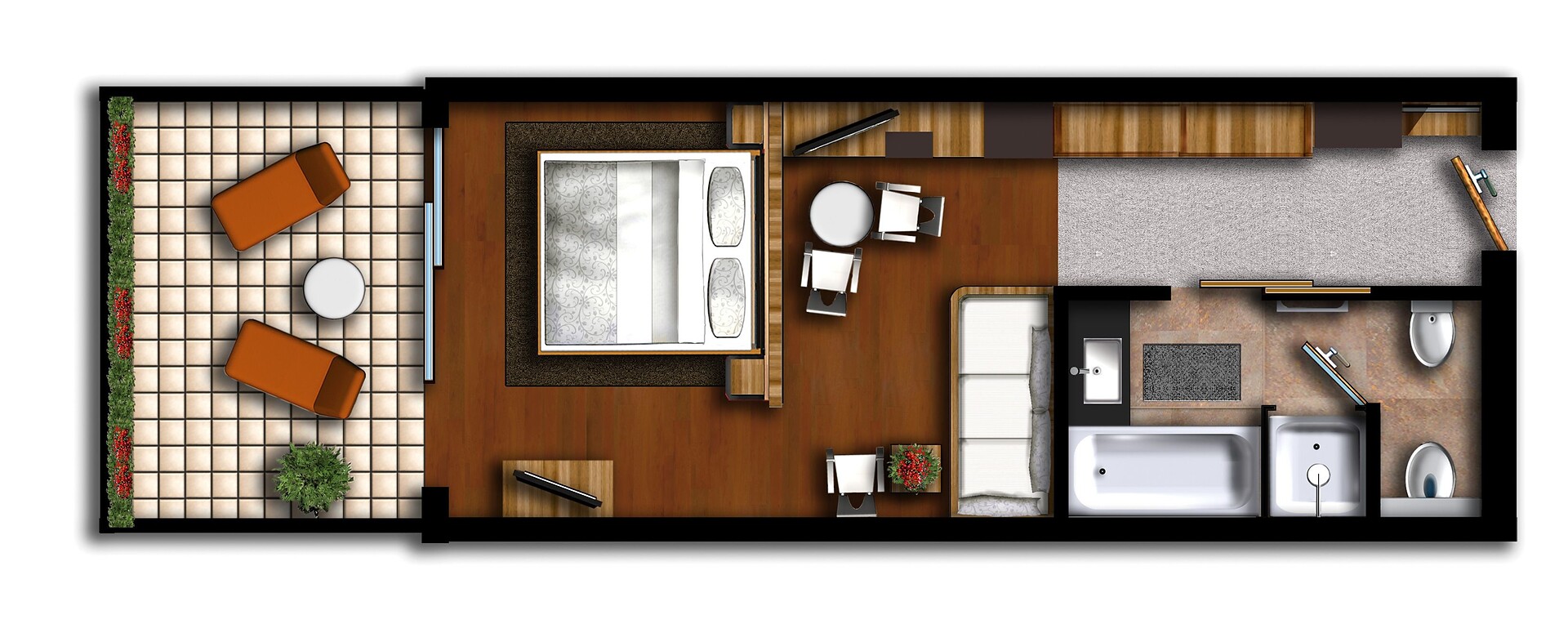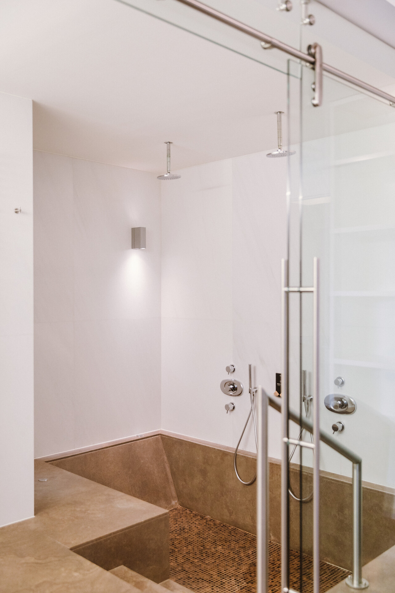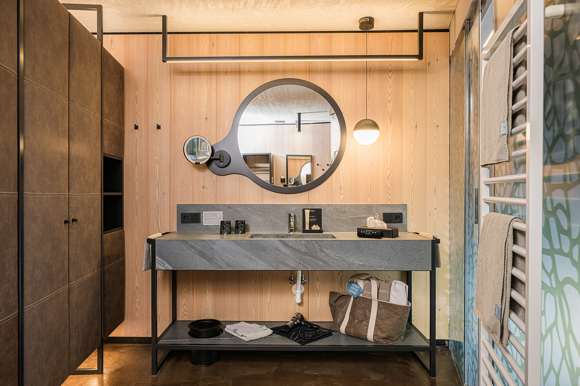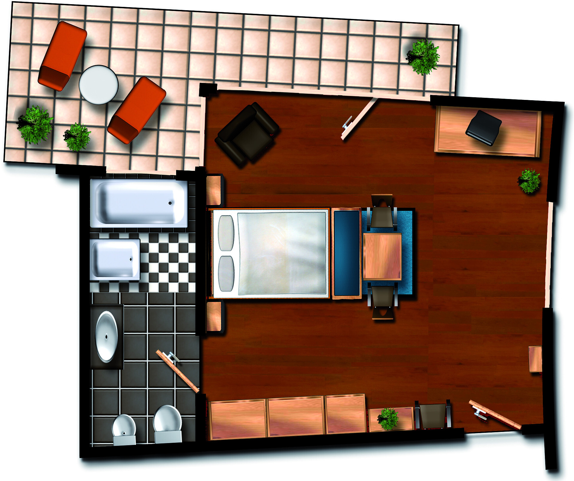 Black & White Suite (70 m², 2-4 Personen): Luxussuite im 5. Stock, geräumiger Wohn-Schlafraum, luxuriöse Couch, Sitzecke, Massagestuhl, abgetrenntes Kinderschlafzimmer mit Stockbetten, Marmorboden, Bad mit Dusche und Badewanne, separates-WC, Flat-TV, gratis W-Lan, Minibar, Safe, offener Kamin, Süd-Ost Terrasse von 40m² mit Panorama-Bio-& Finnische Sauna, Tauchbecken, Kuschelliege, Garage