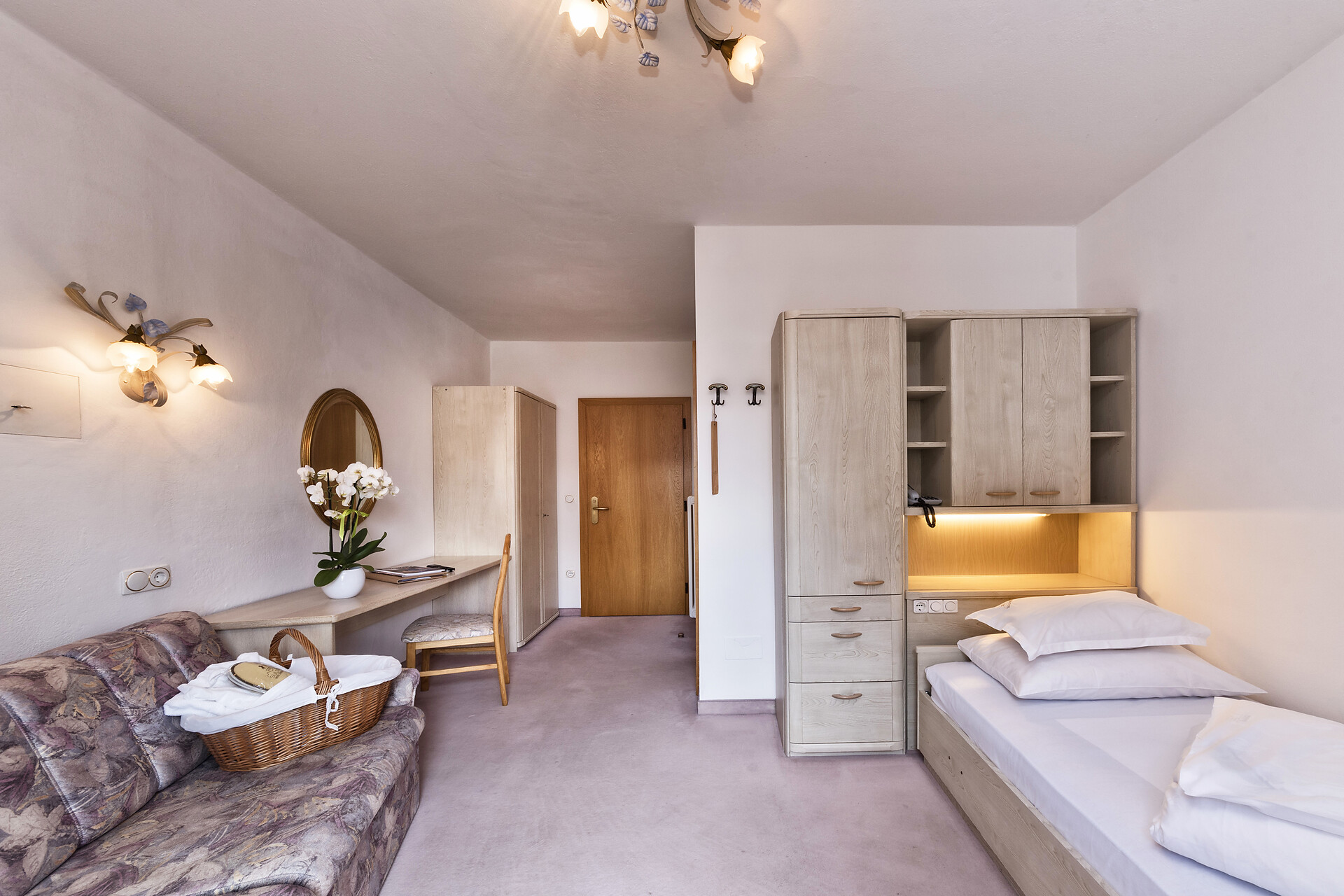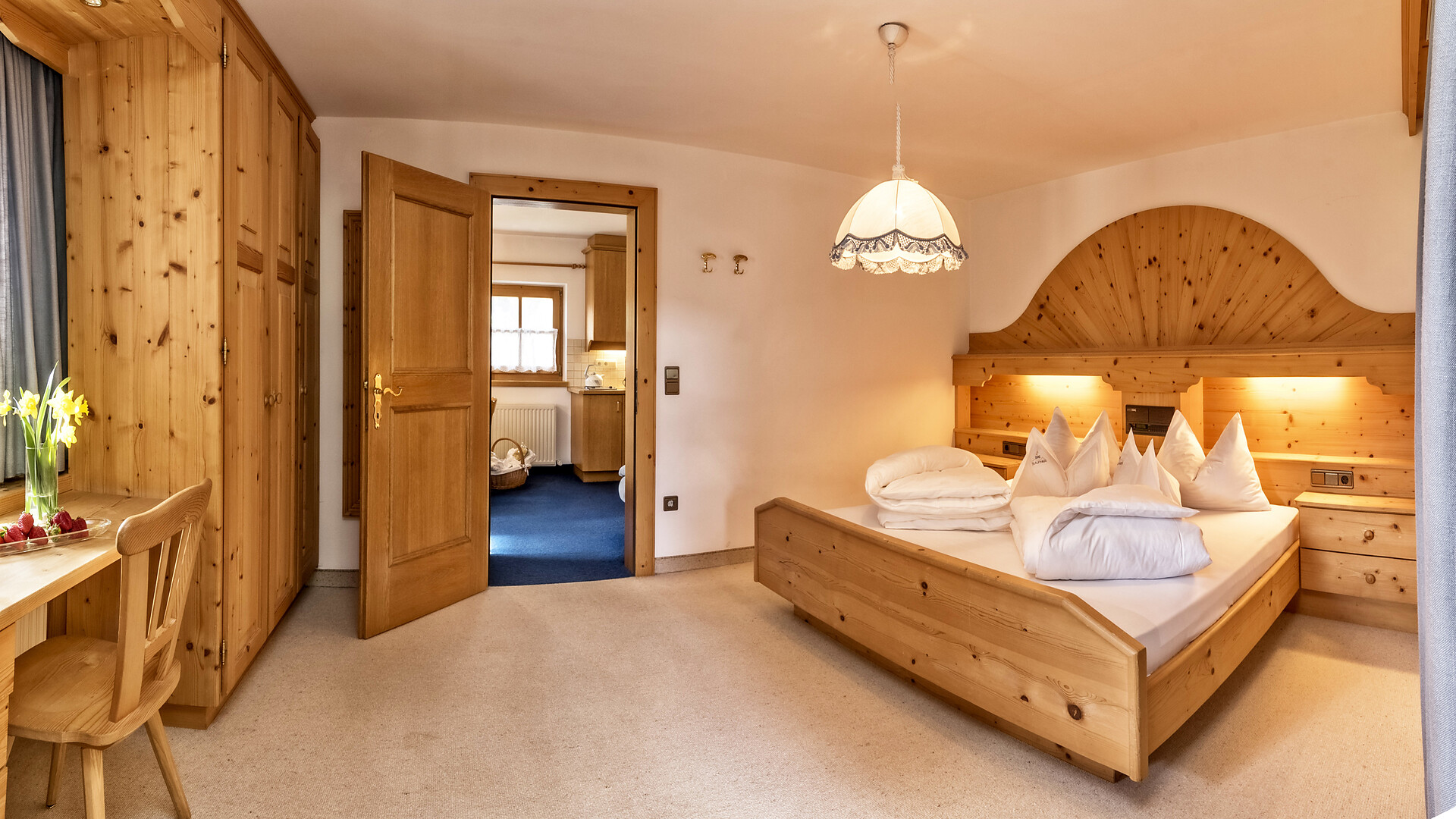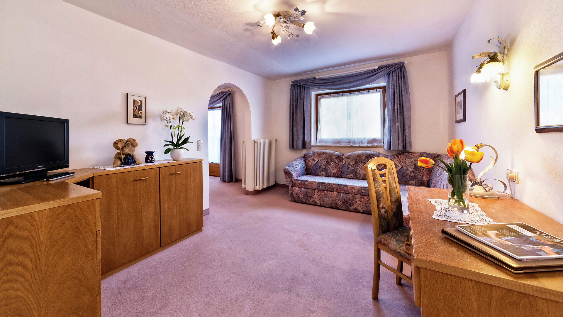 Für 2 - 3 Personen mit gemütlichem Wohnraum mit Kochnische (2 Elektroplatten), Kühlschrank, Kaffeemaschine, Geschirr und Wäsche komplett, Doppelbettzimmer und Doppelbettcouch, großzügiges Badezimmer, Radio, Telefon und Sat-TV, Ostbalkon, Westterrasse, (tägliche Reinigung).