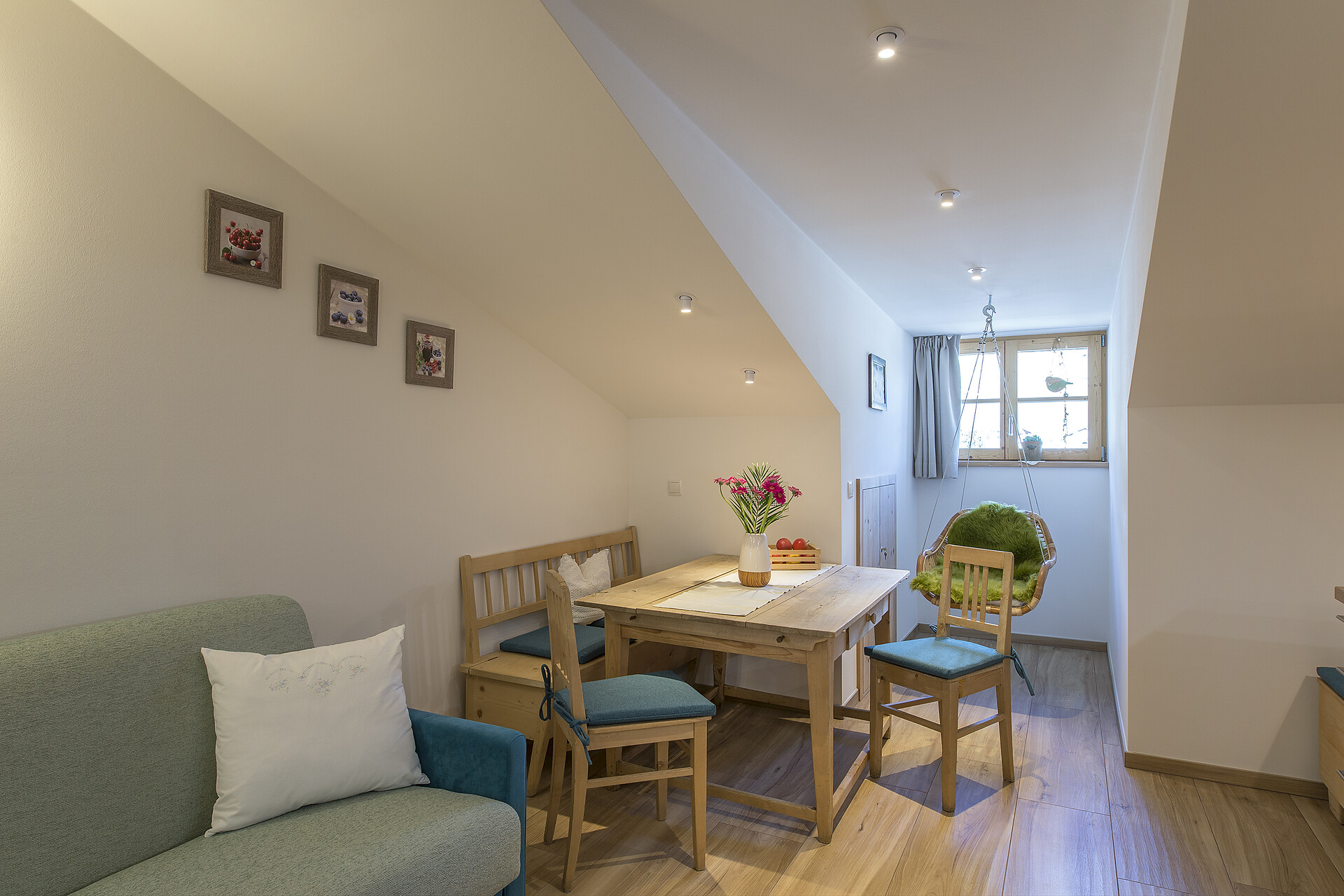 Der Flair und die Spuren des alten Dachstuhlholzes verleihen eine kuschelige und warme wohlige Atmosphäre.