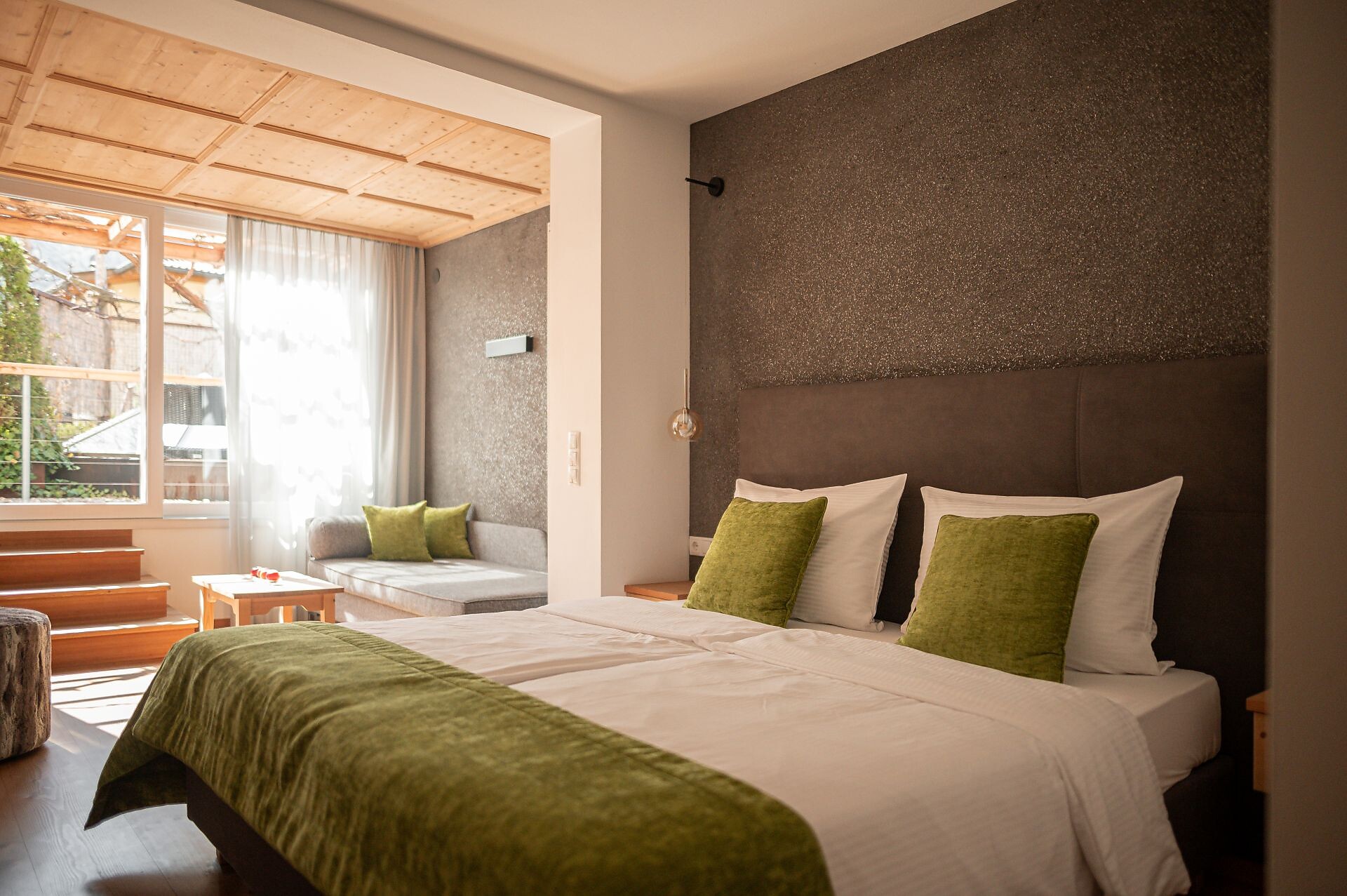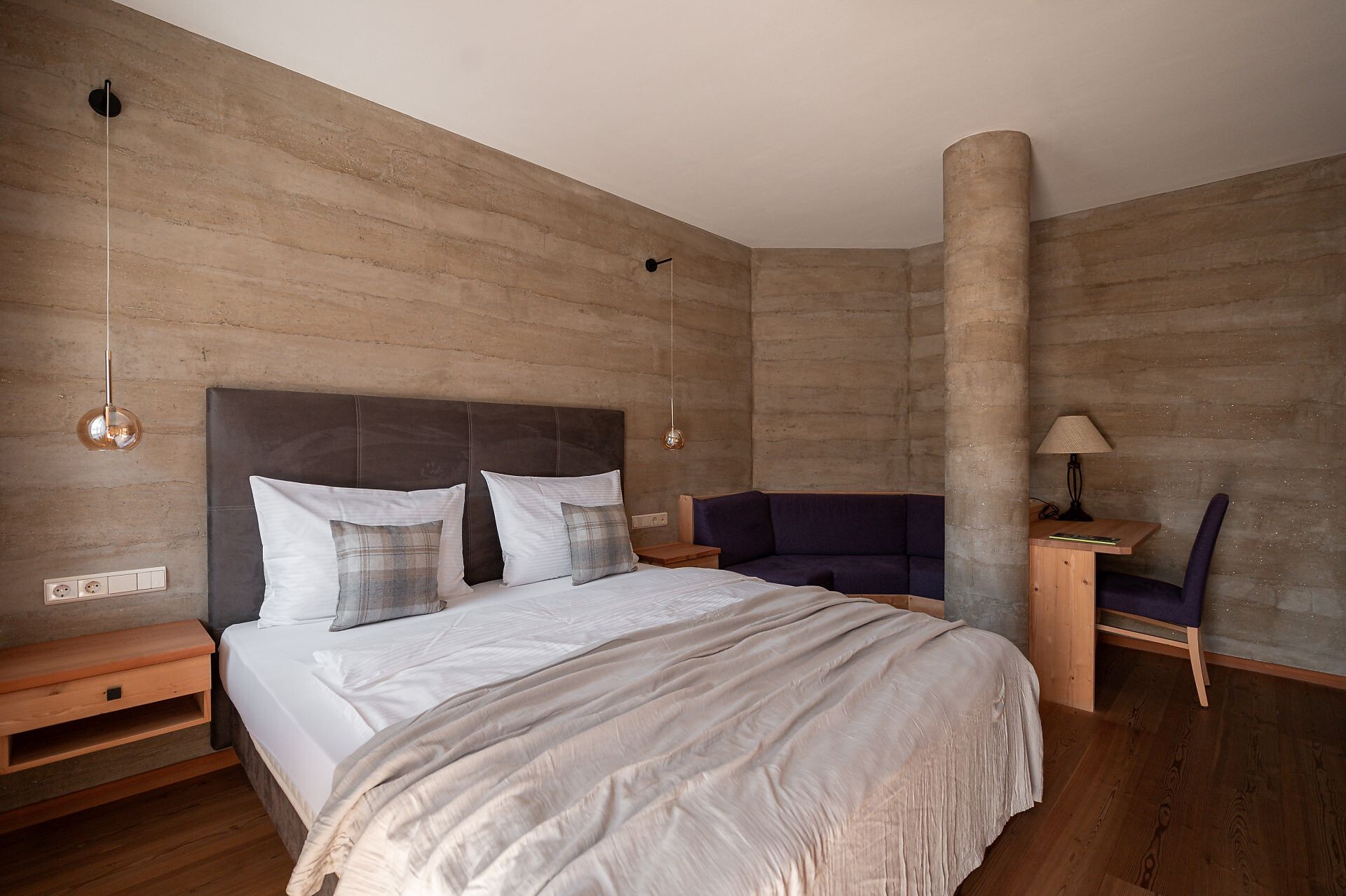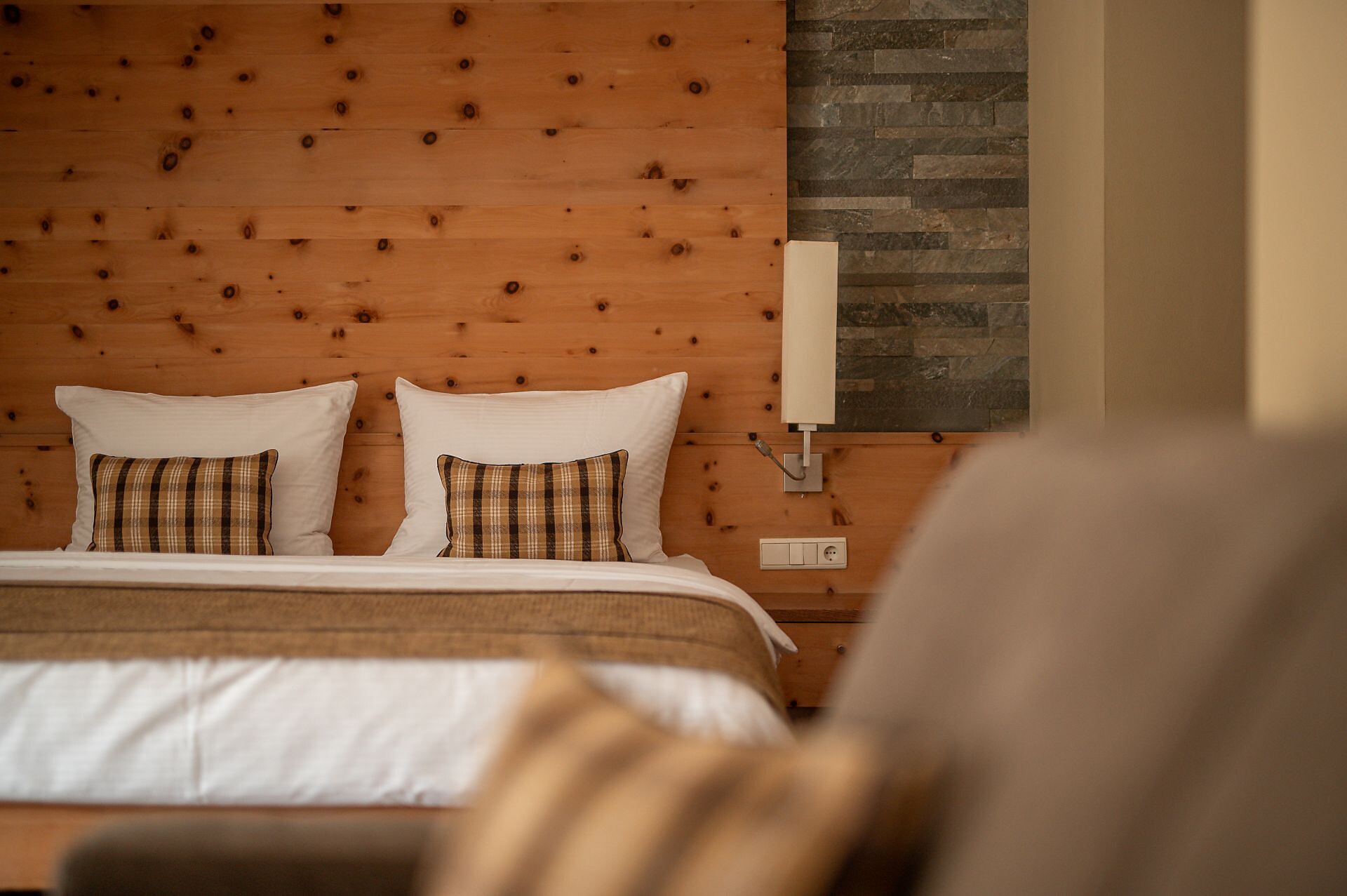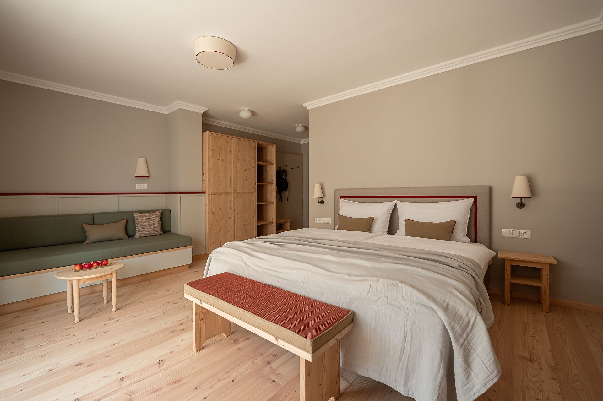Alpines Doppelzimmer mit Holzboden in einheimischer Lärche. Das Zimmer ist mit Blick zum Naturpark Texelgruppe, eingerichtet mit verschiedensten Naturmaterialien und einer bequemen Sitzecke. Das Badezimmer bietet eine Dusche, WC, Föhn und einen Kosmetikspiegel. Alle unsere Zimmer verfügen über kostenloses WLAN und Flat-TV, Balkon, Telefon, Safe, Minibar, Rucksack, Wellnesstasche mit Saunatuch und Bademantel.