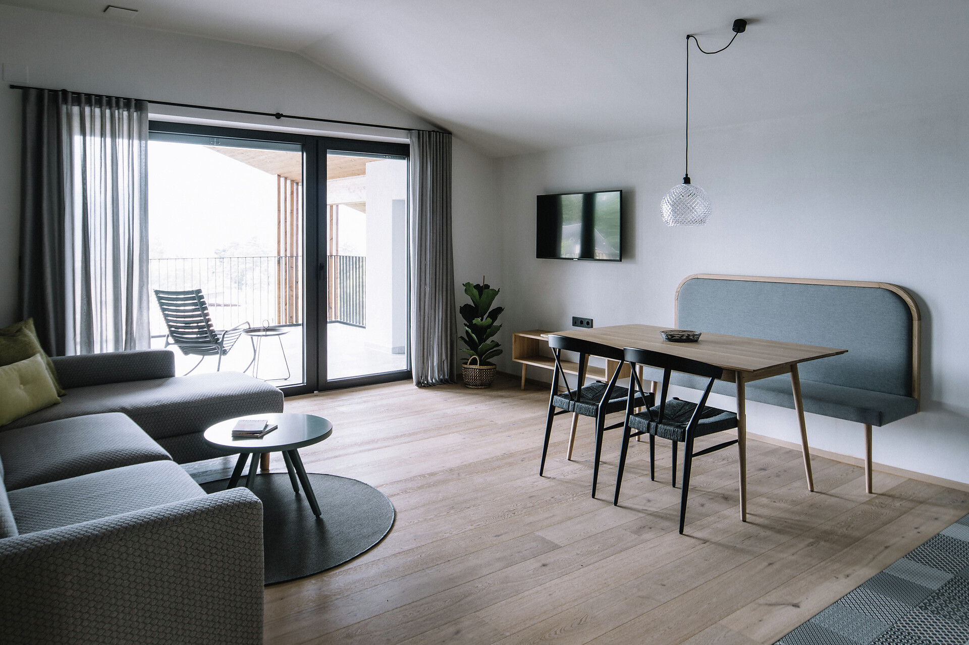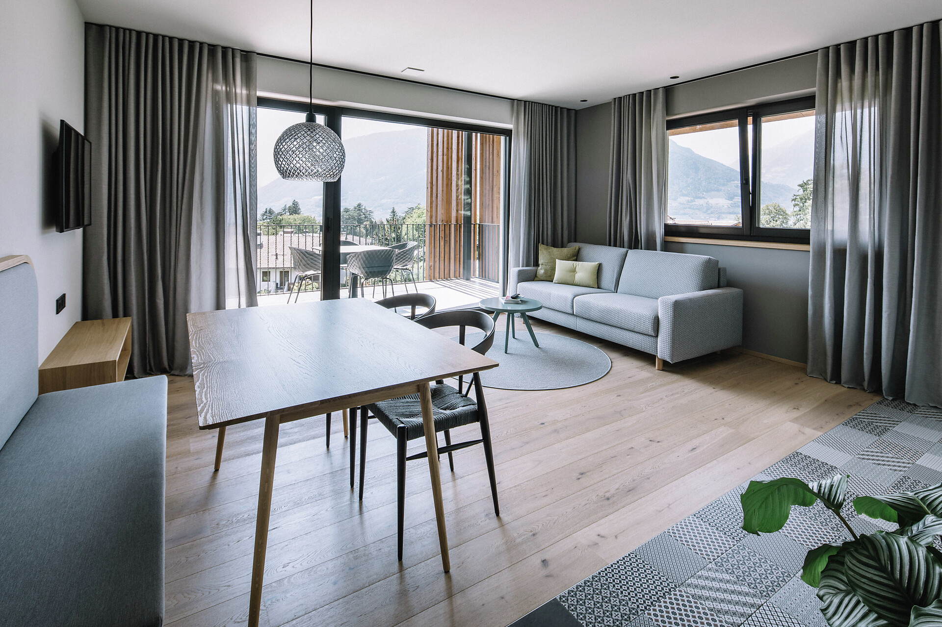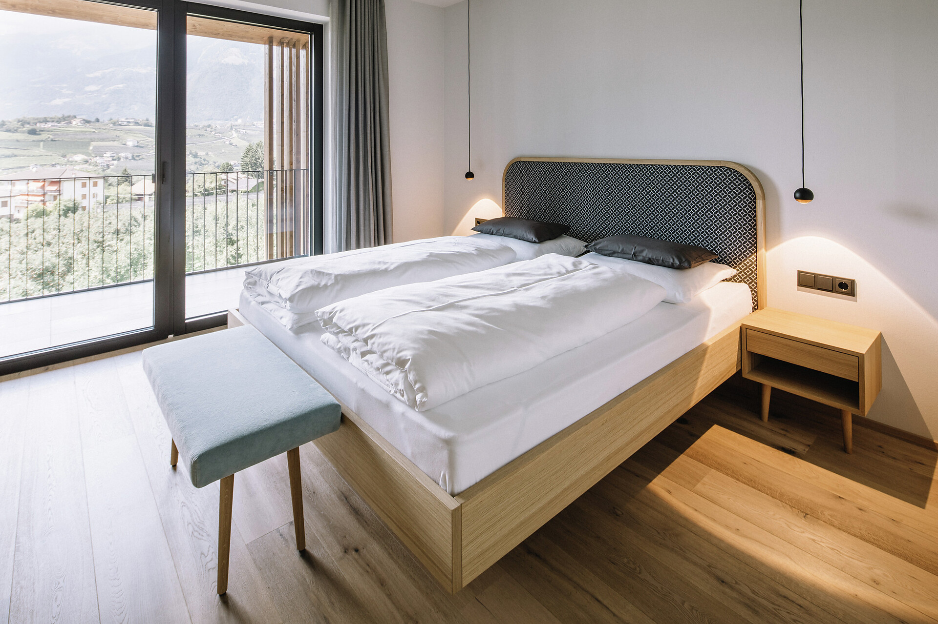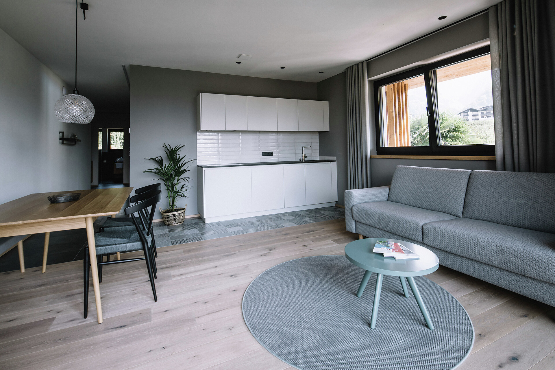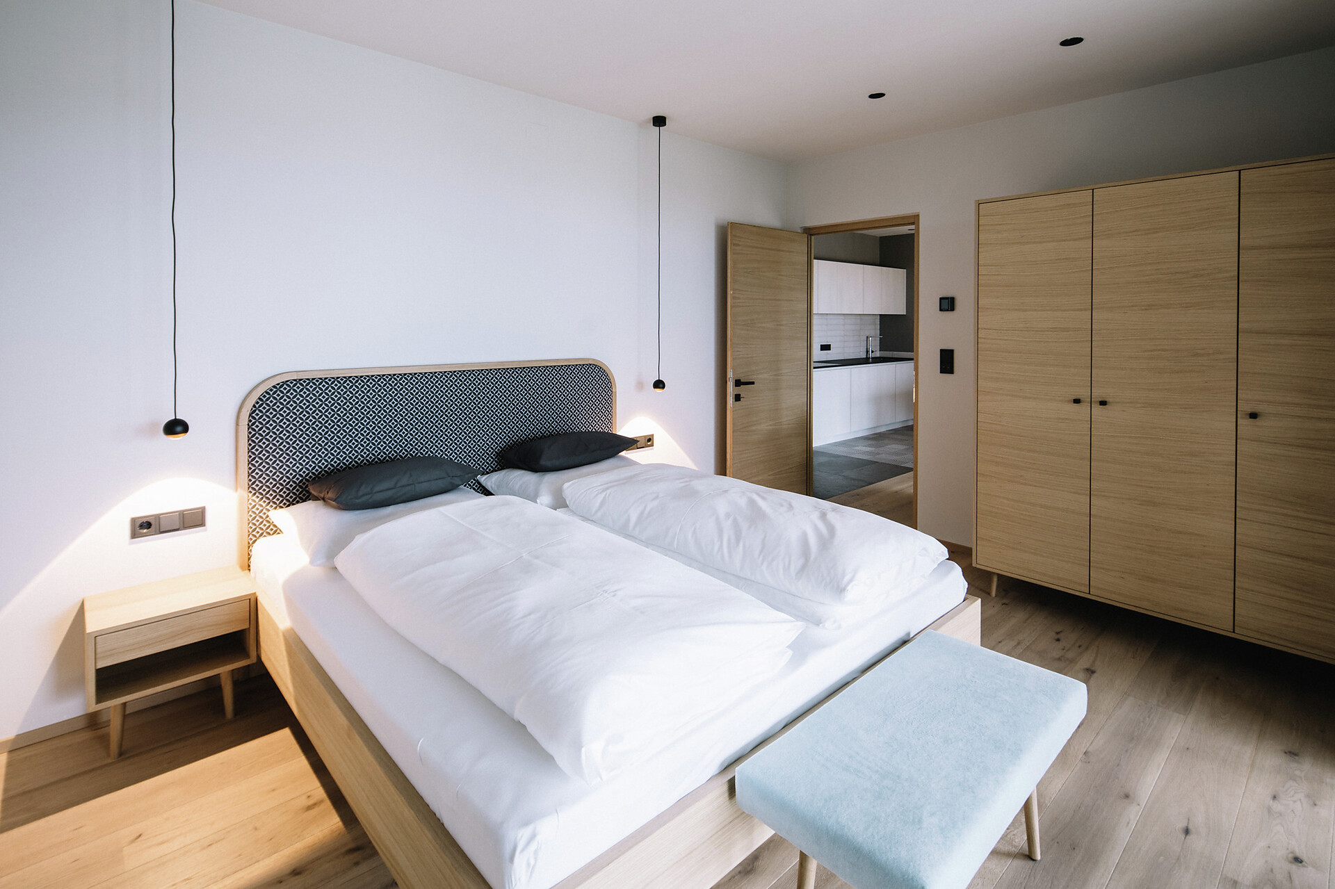 Schlafzimmer mit Doppelbett und hochwertigem Holzfußboden | Wohnraum mit ausziehbarer Schlafcouch und Sitzecke zum Essen und Verweilen | Fußbodenheizung | vollausgestattete Kochnische mit Cerankochfeld, Spüle, Kühlschrank mit Gefrierfach, Spülmaschine, Wasserkocher, Filterkaffeemaschine, Ess– und Kochgeschirr| Badezimmer mit begehbarer Dusche, WC, hochwertigen Pflegeprodukten, Föhn | TV | Safe | kostenloses WIFI | Südbalkon mit Essecke und Liegestühle
