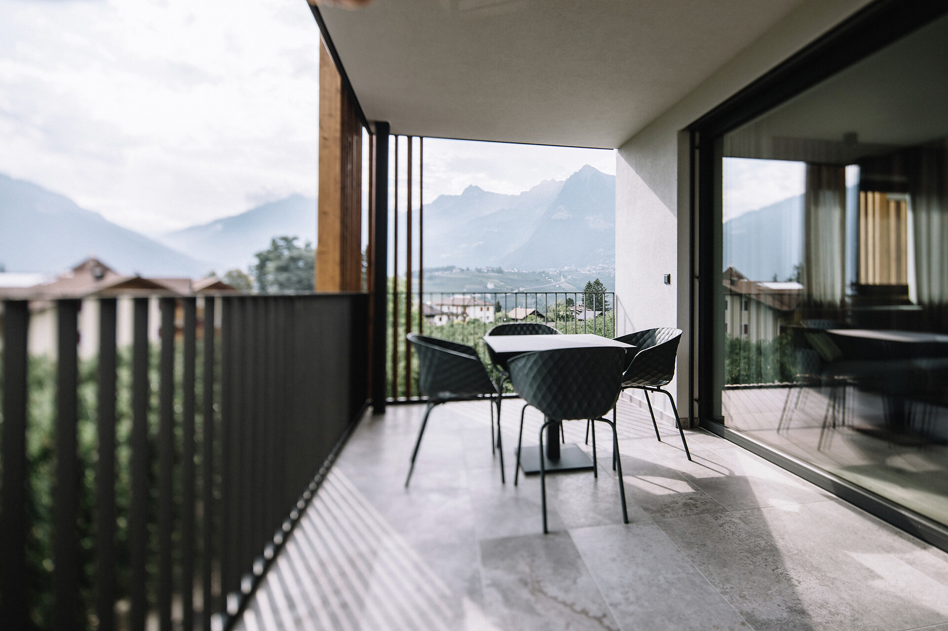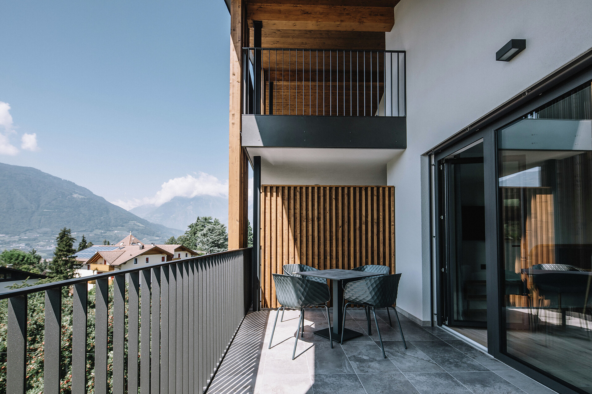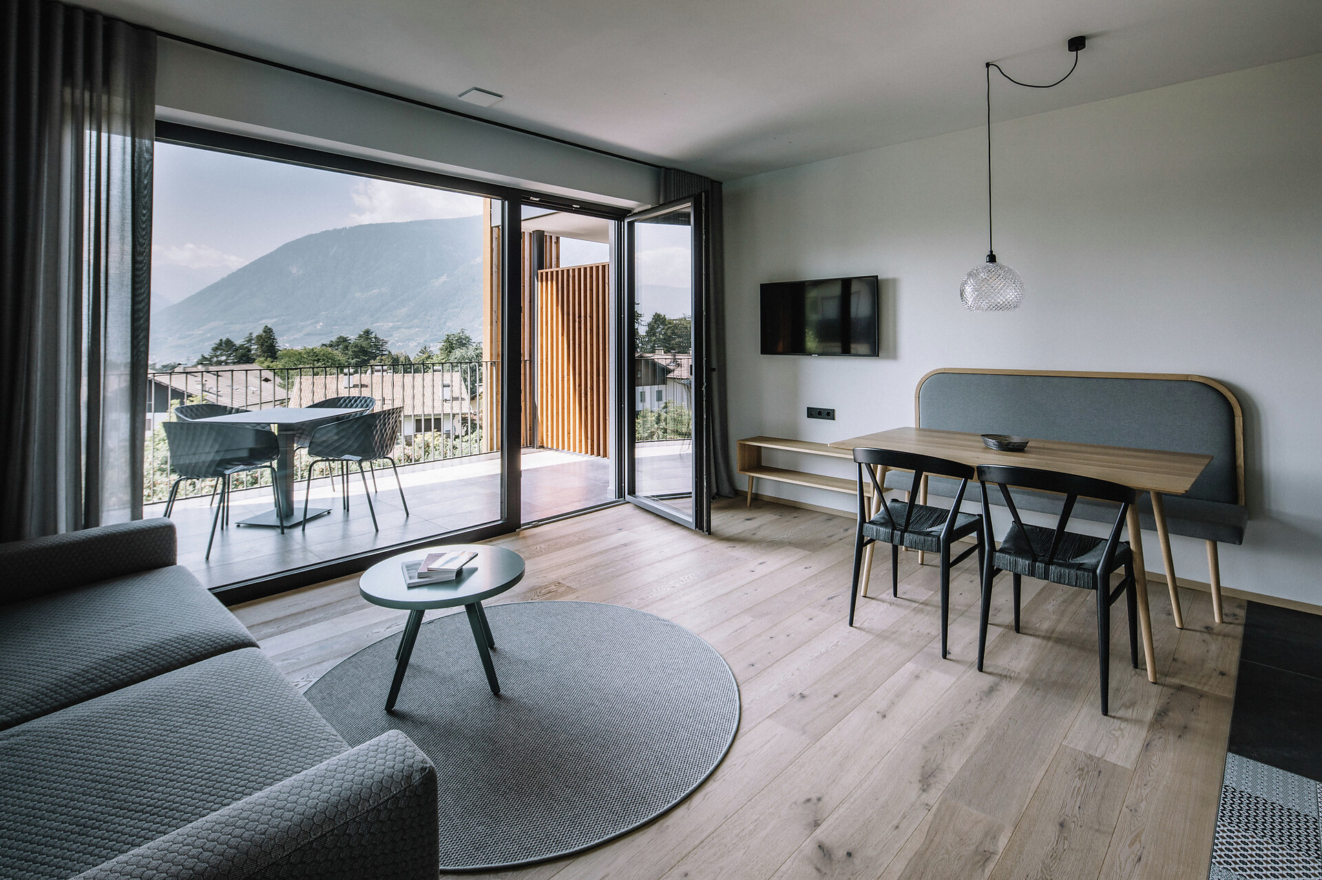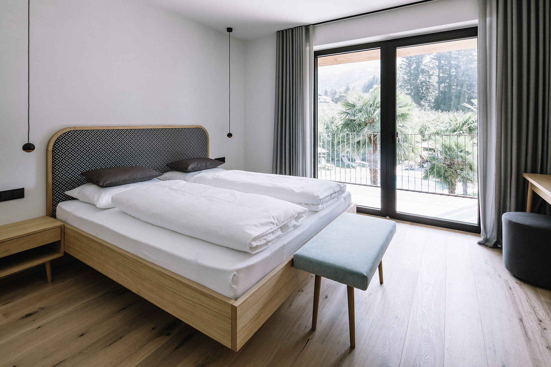 Schlafzimmer mit Doppelbett und hochwertigem Holzfußboden | Wohnraum mit ausziehbarer Schlafcouch und Sitzecke zum Essen und Verweilen | Fußbodenheizung | vollausgestattete Kochnische mit Cerankochfeld, Spüle, Kühlschrank mit Gefrierfach, Spülmaschine, Wasserkocher, Filterkaffeemaschine, Ess– und Kochgeschirr| Badezimmer mit begehbarer Dusche, WC, hochwertigen Pflegeprodukten, Föhn | TV | Safe | kostenloses WIFI | Südbalkon mit Essecke und Liegestühle