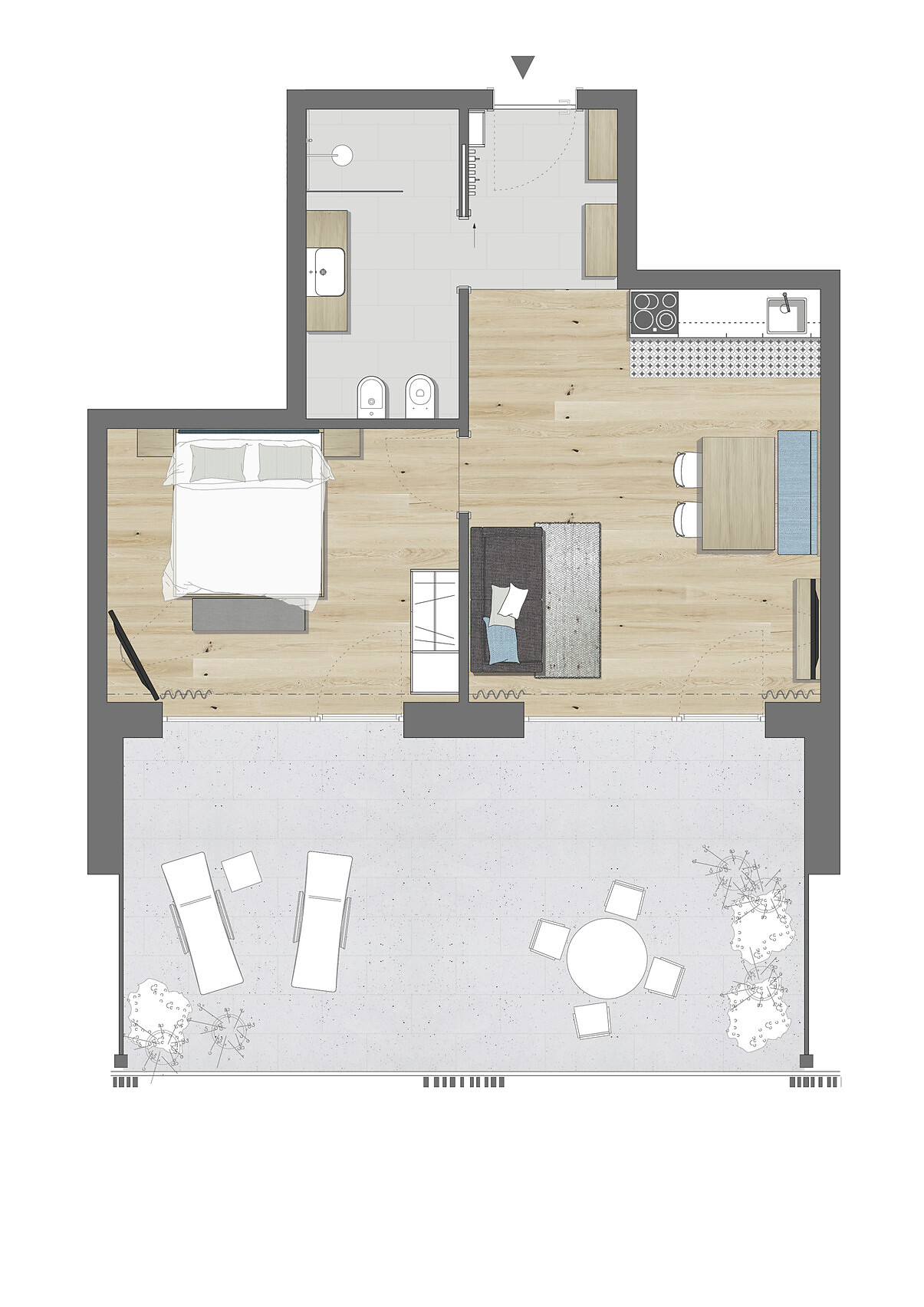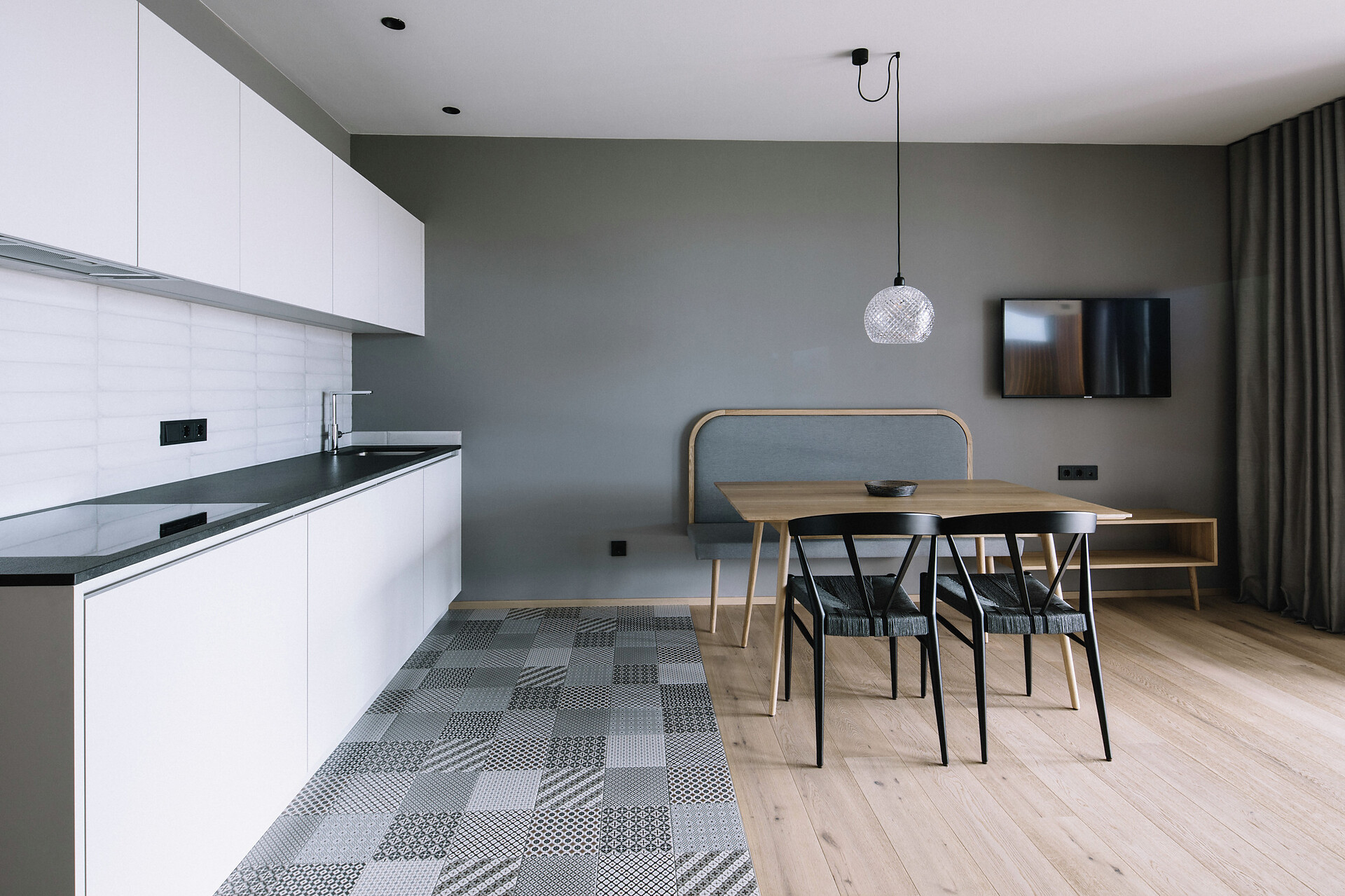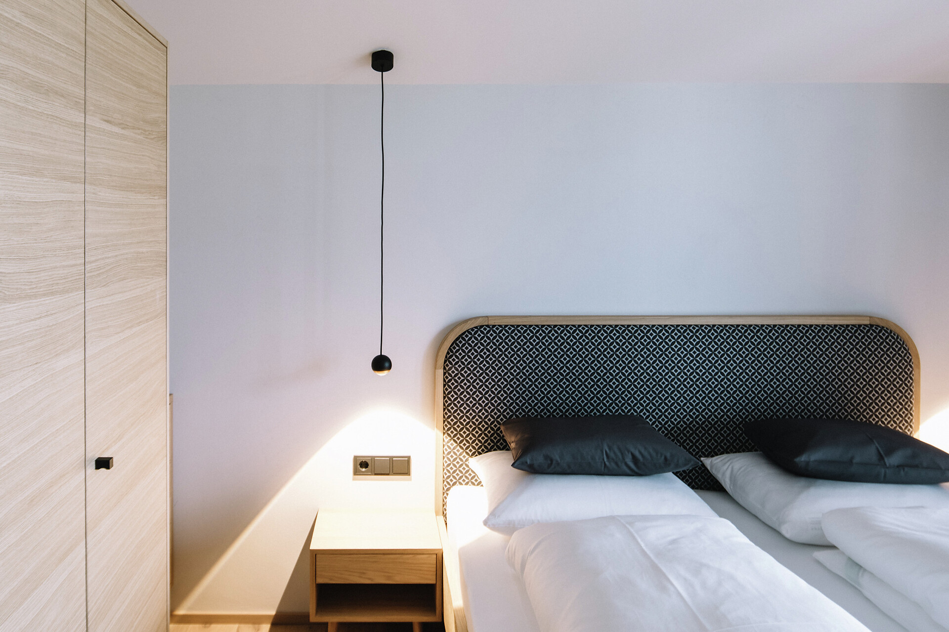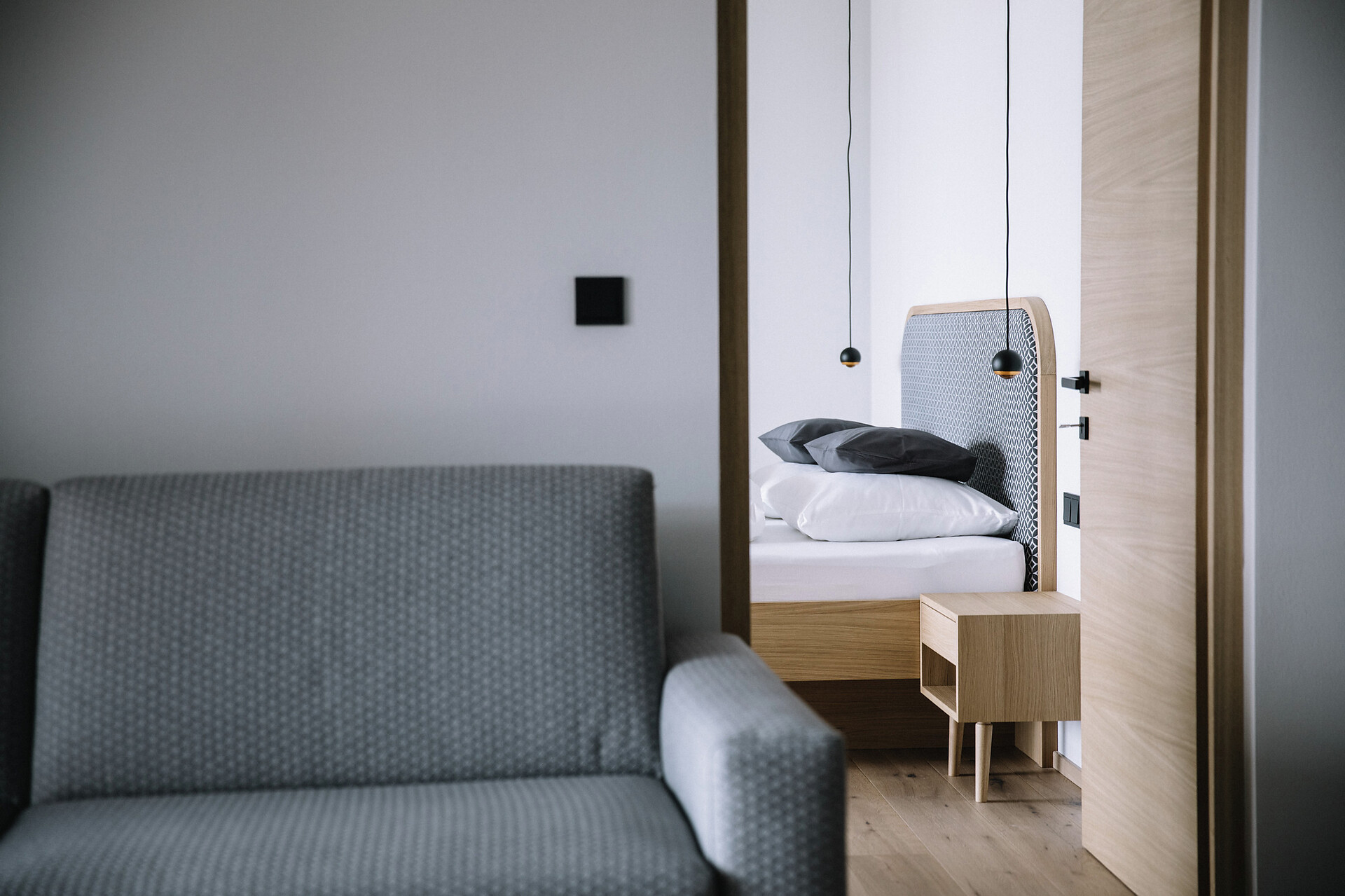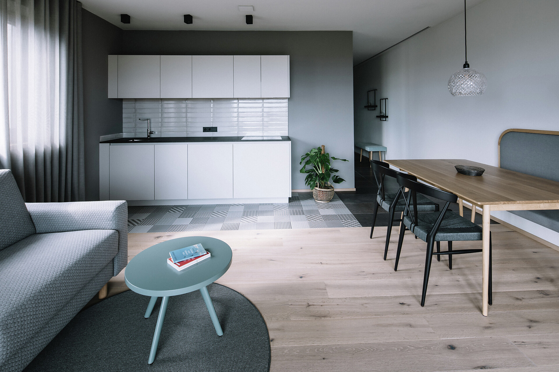 Schlafzimmer mit Doppelbett und hochwertigem Holzfußboden | Wohnraum mit ausziehbarer Schlafcouch und Sitzecke zum Essen und Verweilen | Fußbodenheizung | vollausgestattete Kochnische mit Cerankochfeld, Spüle, Kühlschrank mit Gefrierfach, Spülmaschine, Wasserkocher, Filterkaffeemaschine, Ess– und Kochgeschirr| Badezimmer mit begehbarer Dusche, WC, hochwertigen Pflegeprodukten, Föhn | TV | Safe | kostenloses WIFI | Südbalkon mit Essecke und Liegestühle