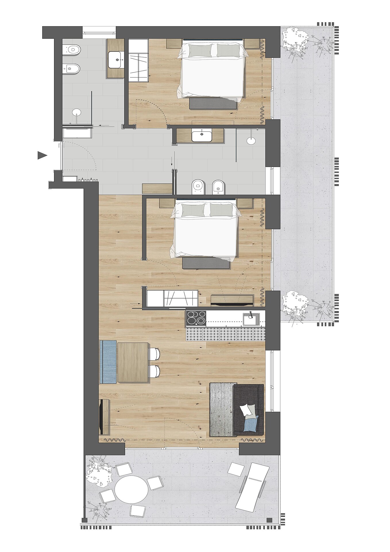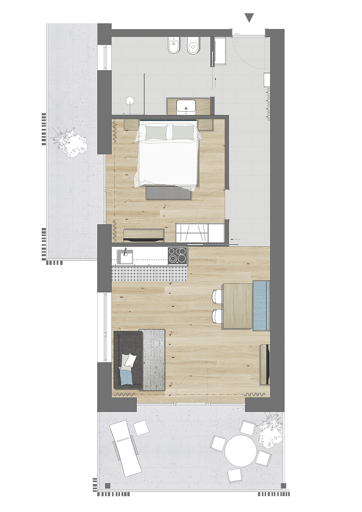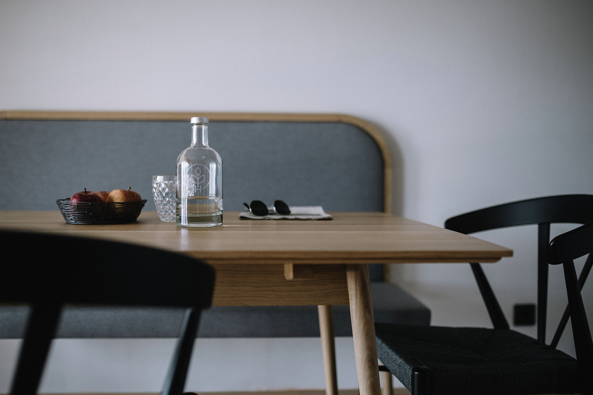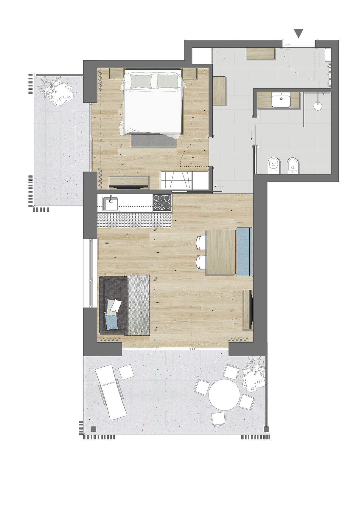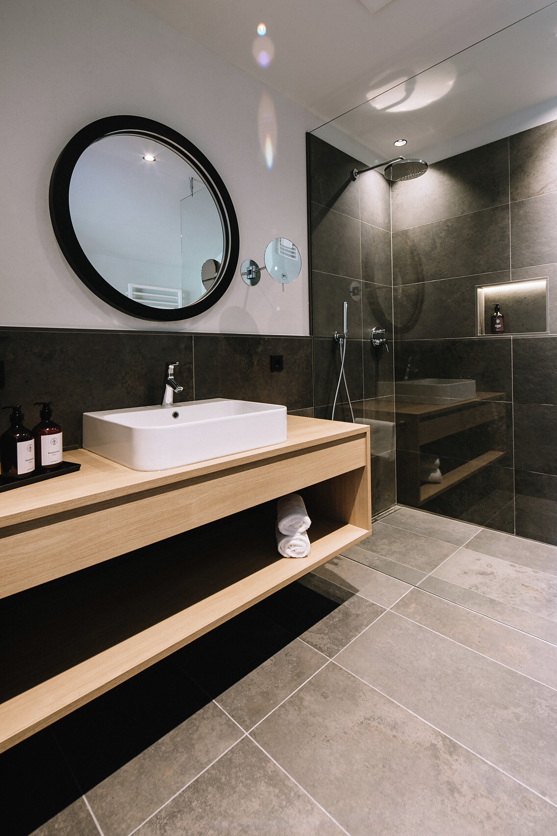 Schlafzimmer mit Doppelbett und hochwertigem Holzfußboden | Wohnraum mit ausziehbarer Schlafcouch und Sitzecke zum Essen und Verweilen | Fußbodenheizung | vollausgestattete Kochnische mit Cerankochfeld, Spüle, Kühlschrank mit Gefrierfach, Spülmaschine, Wasserkocher, Filterkaffeemaschine, Ess– und Kochgeschirr| Badezimmer mit begehbarer Dusche, WC, hochwertigen Pflegeprodukten, Föhn | TV | Safe | kostenloses WIFI | Südbalkon mit Essecke und Liegestühle