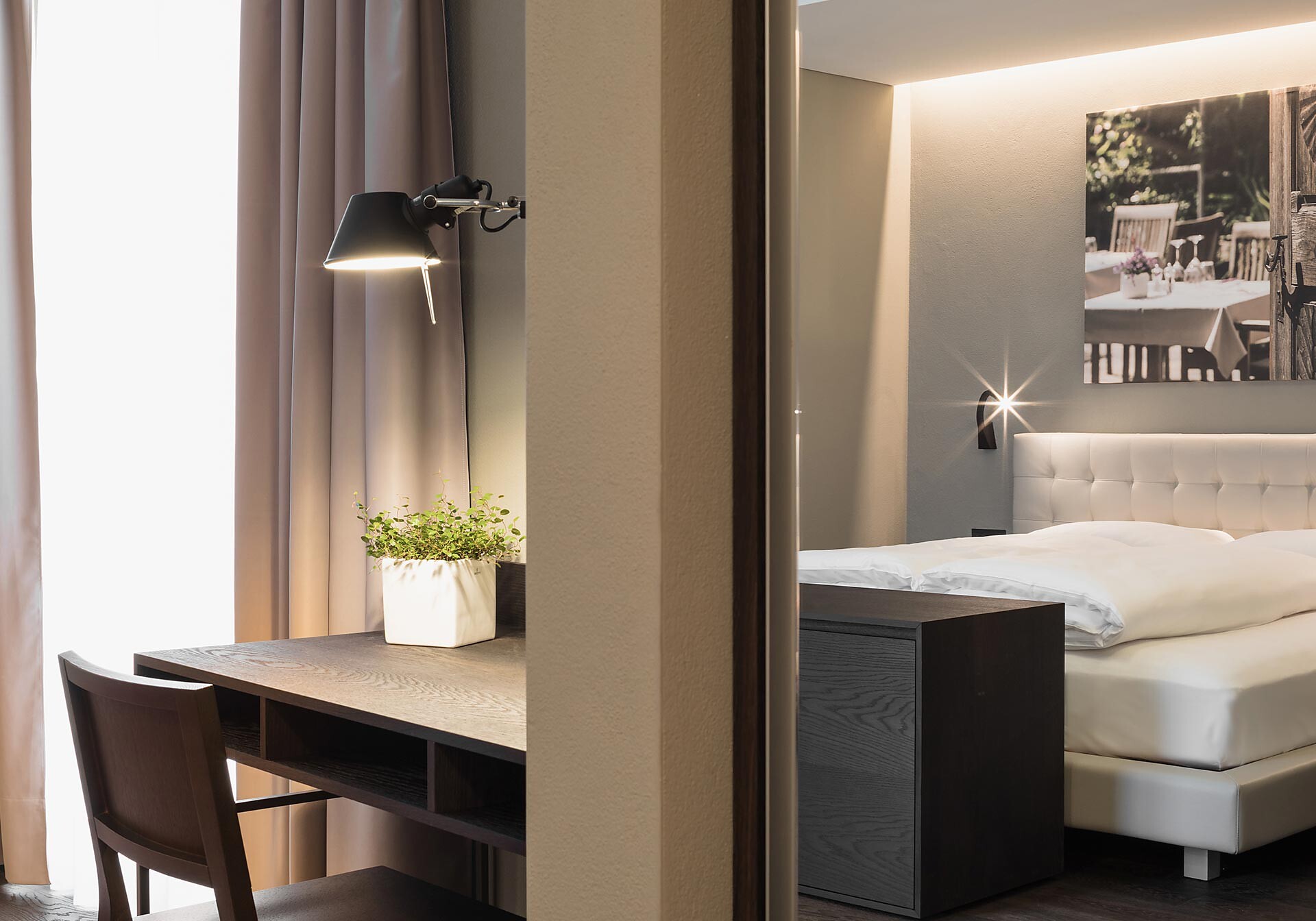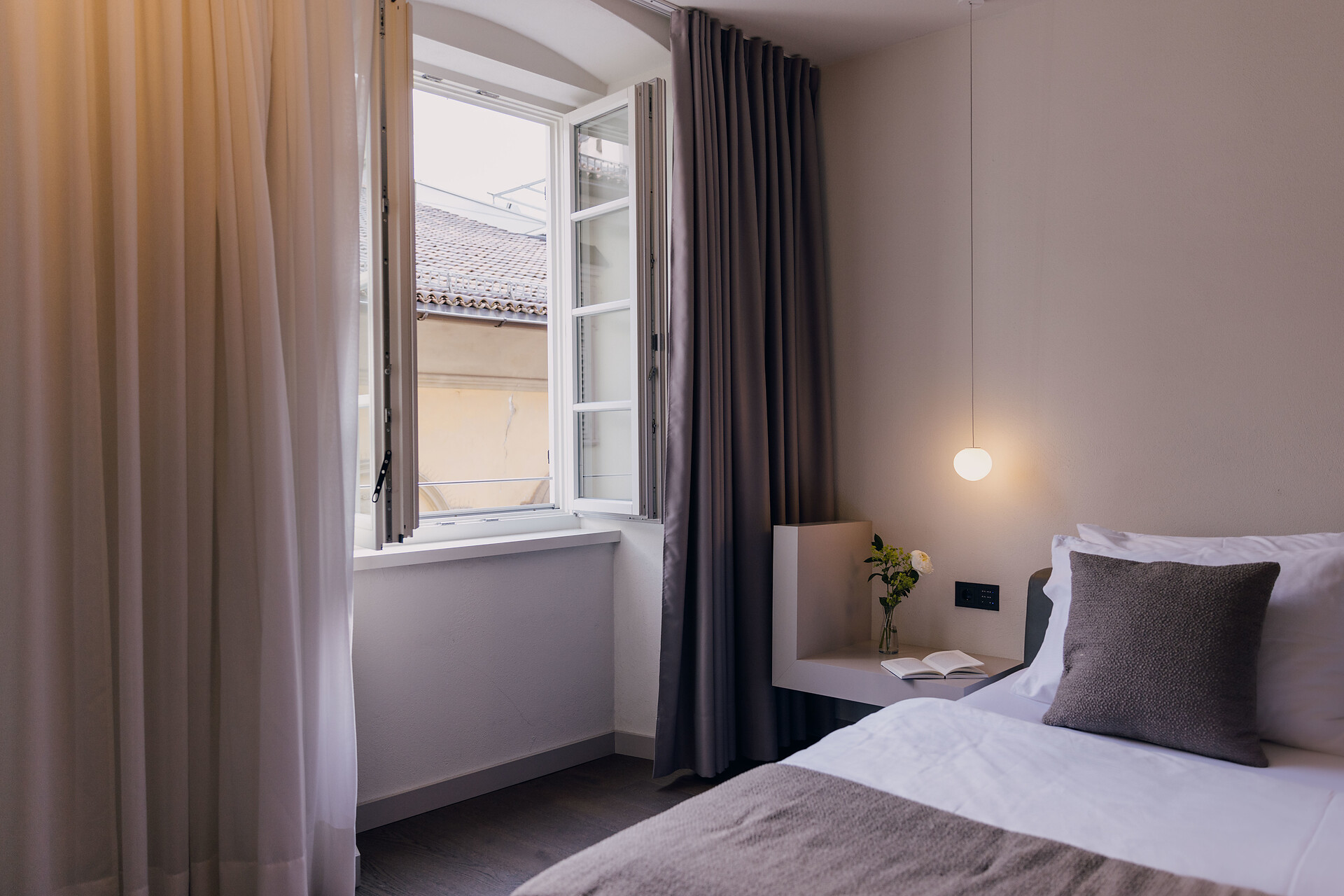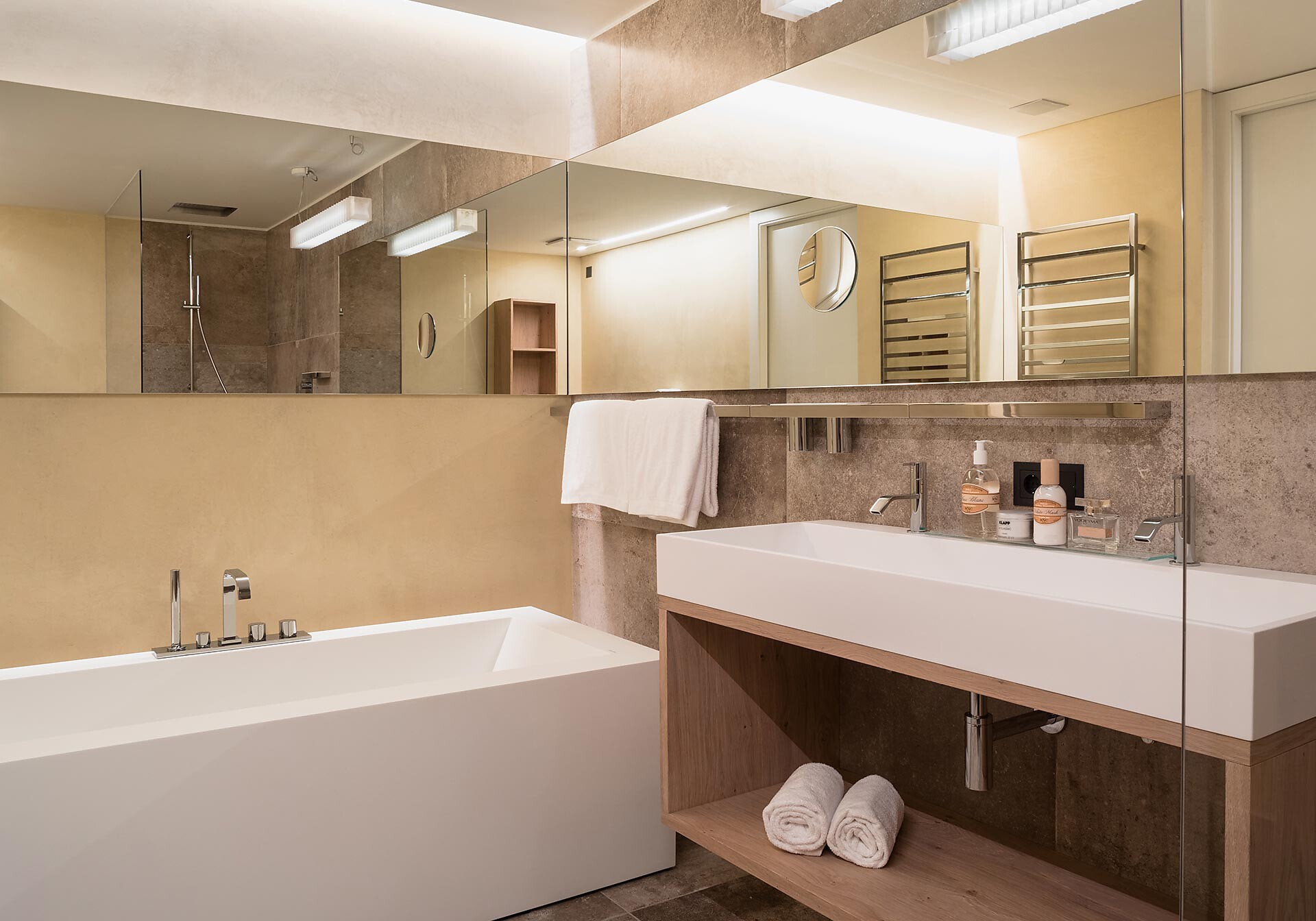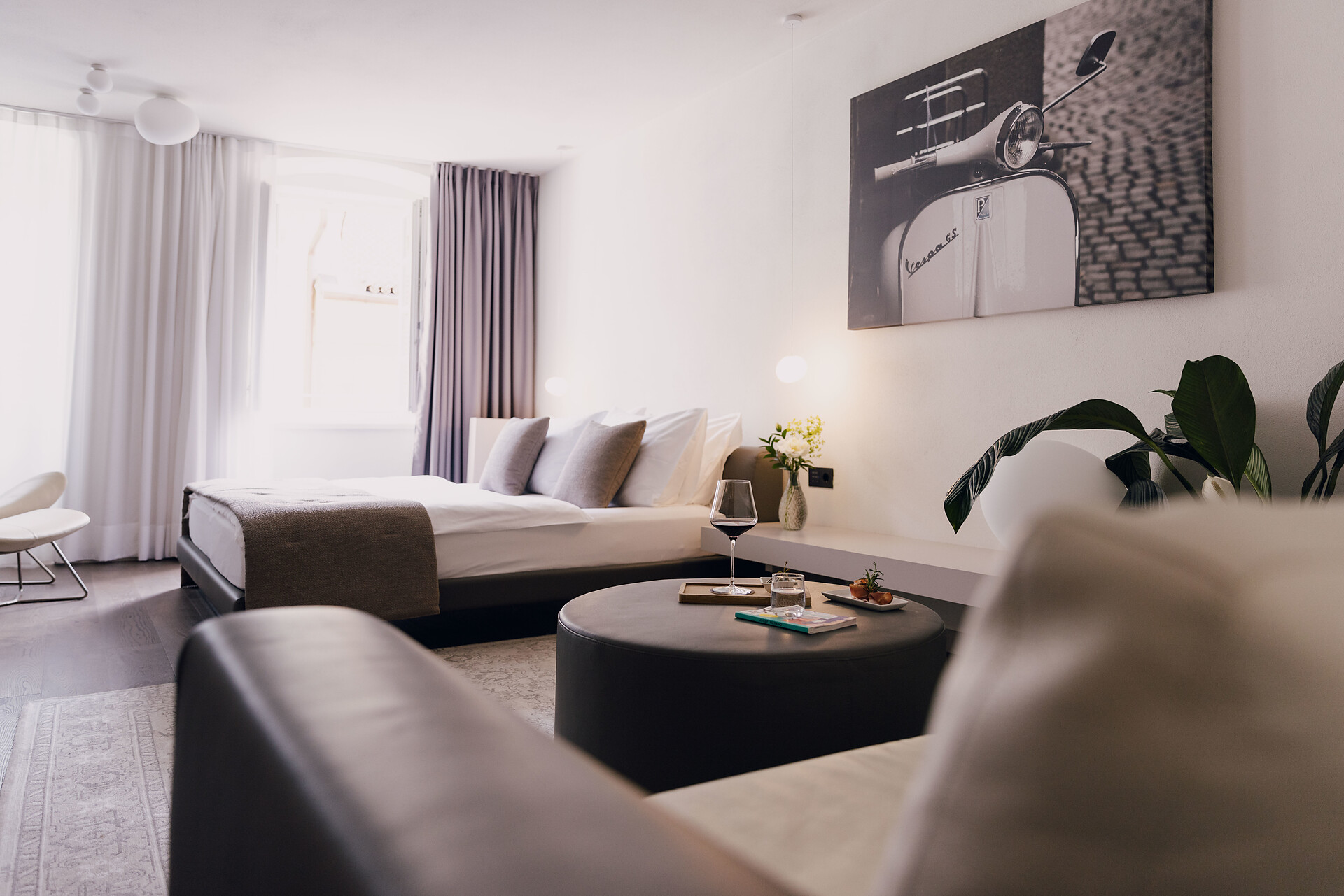 Die großzügige Familiensuite mit 70m² Wohnfläche befindet sich im 1. Obergeschoss, südseitig mit Blick auf die Laubengasse. Getrenntes Schlafzimmer mit King Size Bett, eigener Wohnraum mit Schlafcouch, großzügiges Badezimmer mit Dusche, Badewanne, WC und Bidet. Getrenntes Tages-WC. Cinema TV, Radio, Telefon, Safe, Kühlschrank, W-LAN und Klimaanlage. Neu 2019: Panorama-Dachterrasse mit Whirlpool.