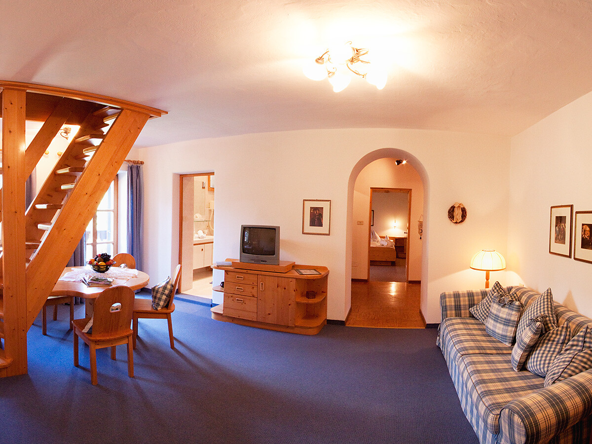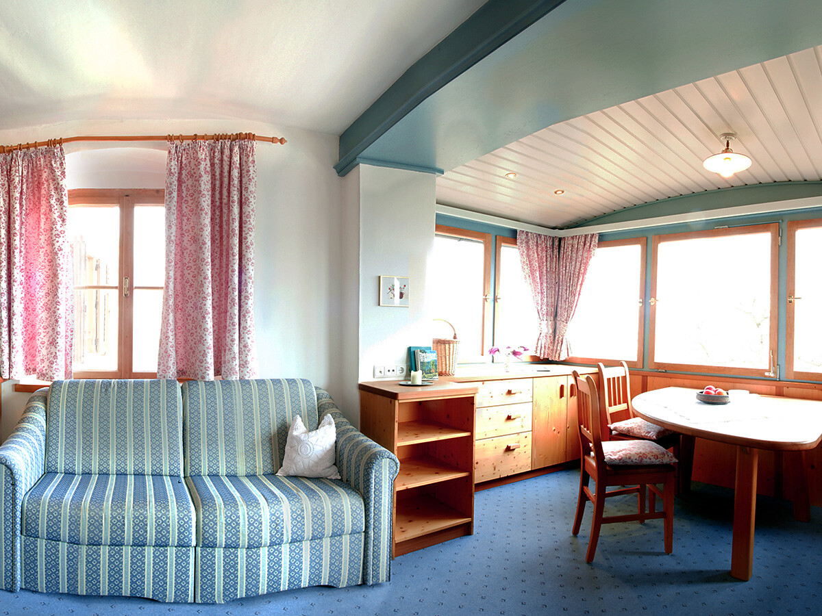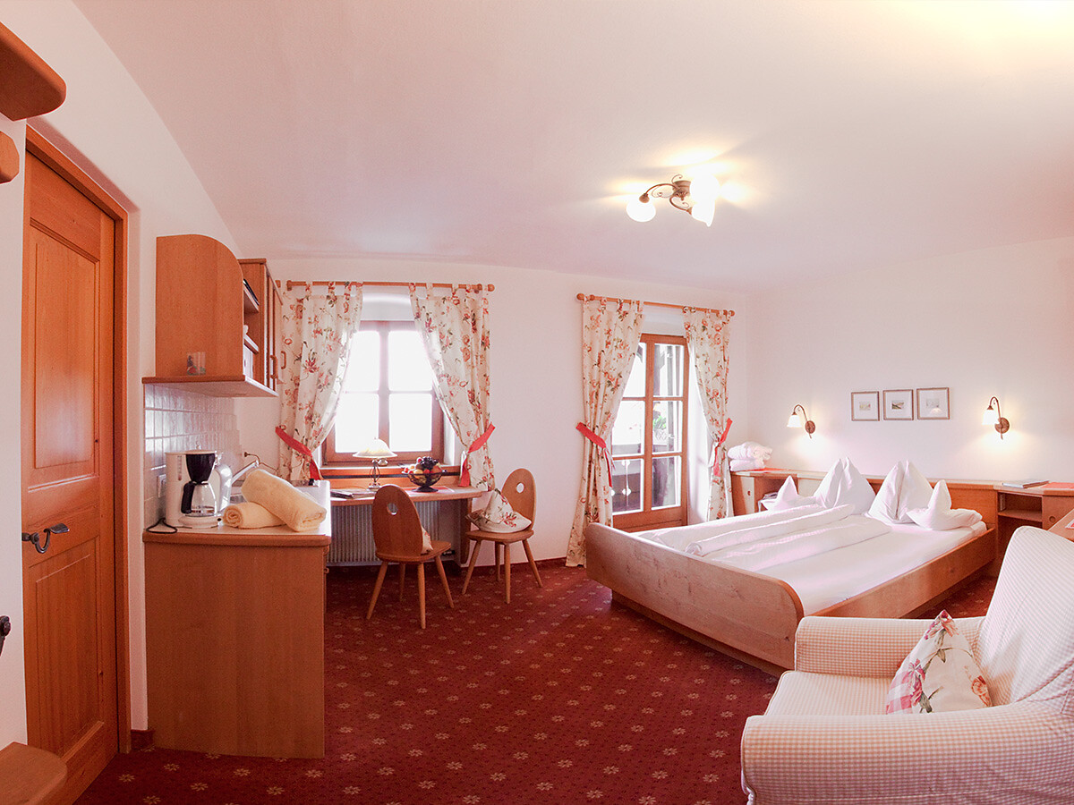 RÖTL I Große Ferienwohnung mit 50m² in hellem Fichtenholz mit getrenntem Wohn- und Schlafbereich, separatem kleinem Kinderzimmer mit Doppelbett, Wohnzimmer mit gemütlicher Couch, Essecke, Flachbildfernseher mit Sat, Telefon, Safe sowie schönem Westbalkon mit Liegestühlen und Liegematten. Zur Ausstattung gehört ein Badezimmer mit Doppelwaschbecken, Dusche/WC, Haarföhn, Kosmetikspiegel, Bademäntel und Badehandtücher. Eine perfekt ausgestattete Küchenzeile mit Spülmaschine, Kaffeemaschine, Wasserkocher, Kühlschrank, Mikrowelle und Toaster steht zur Verfügung.