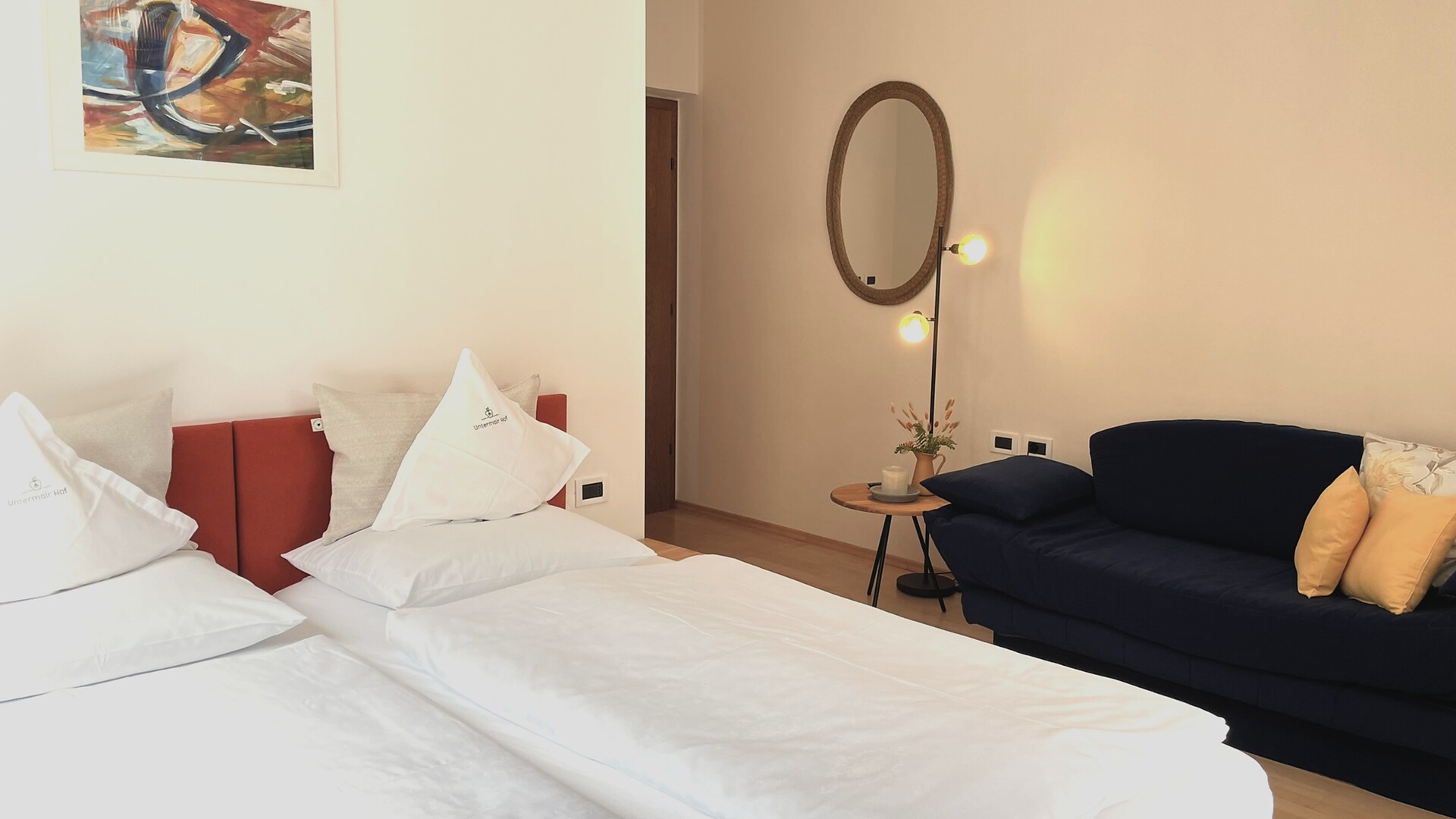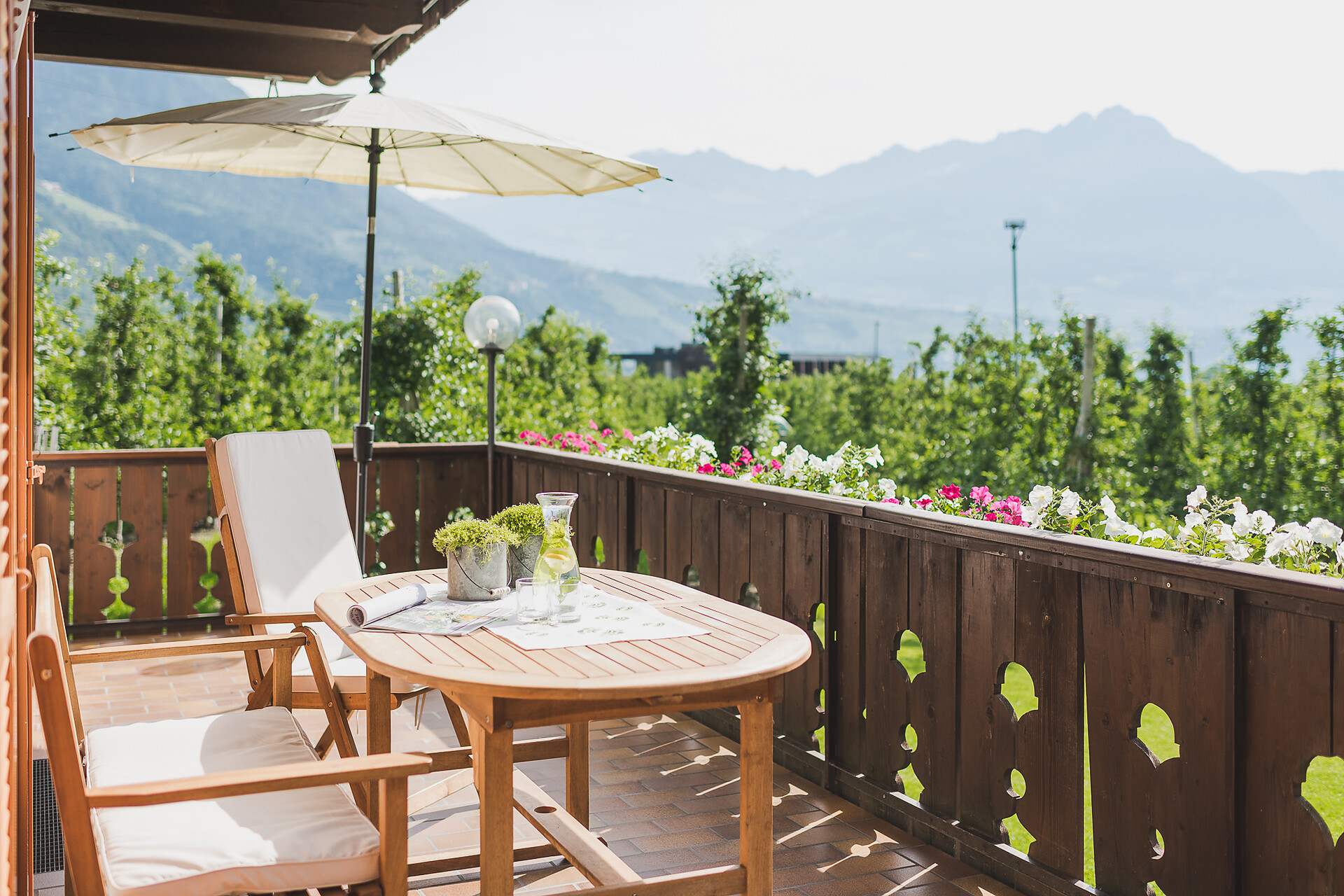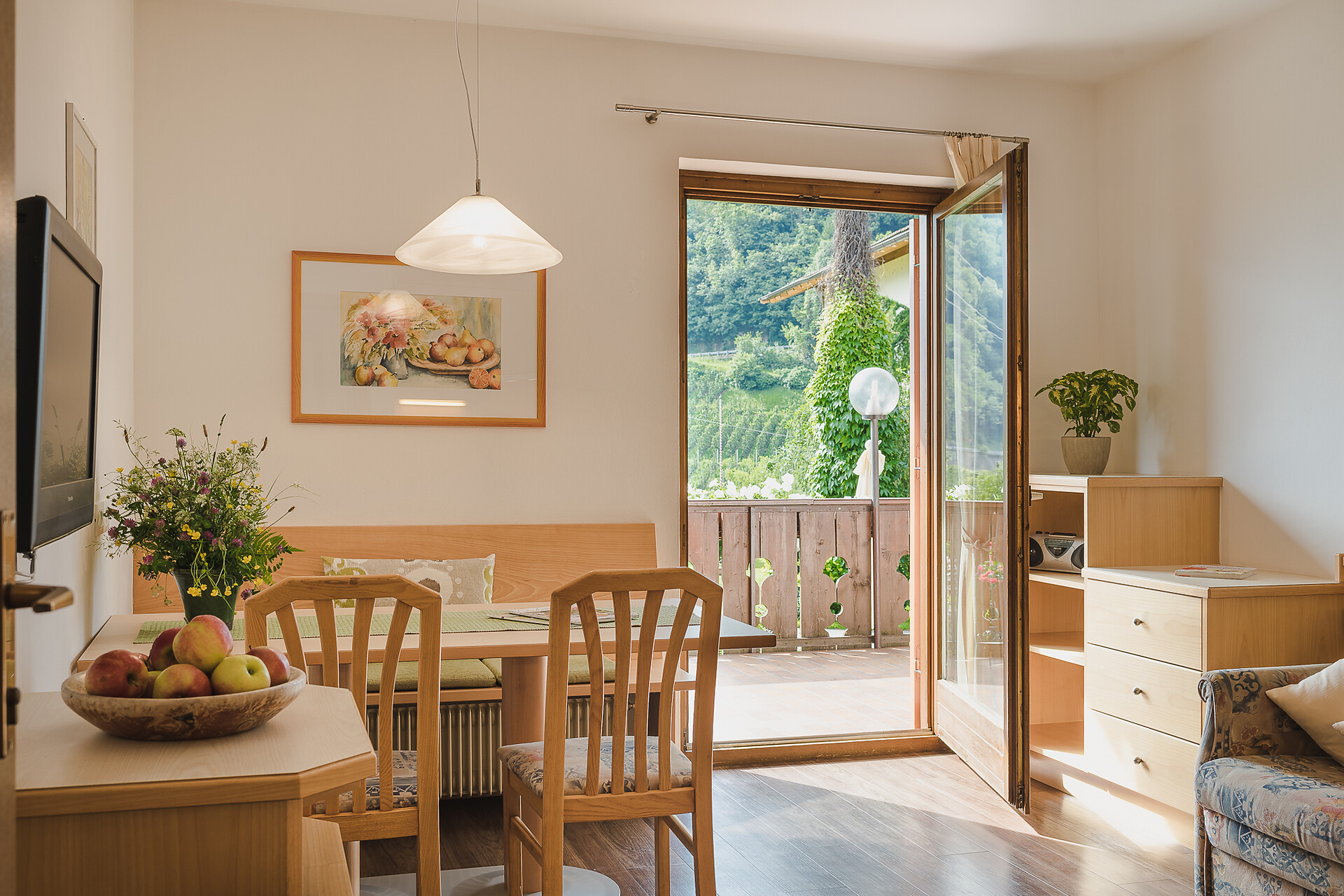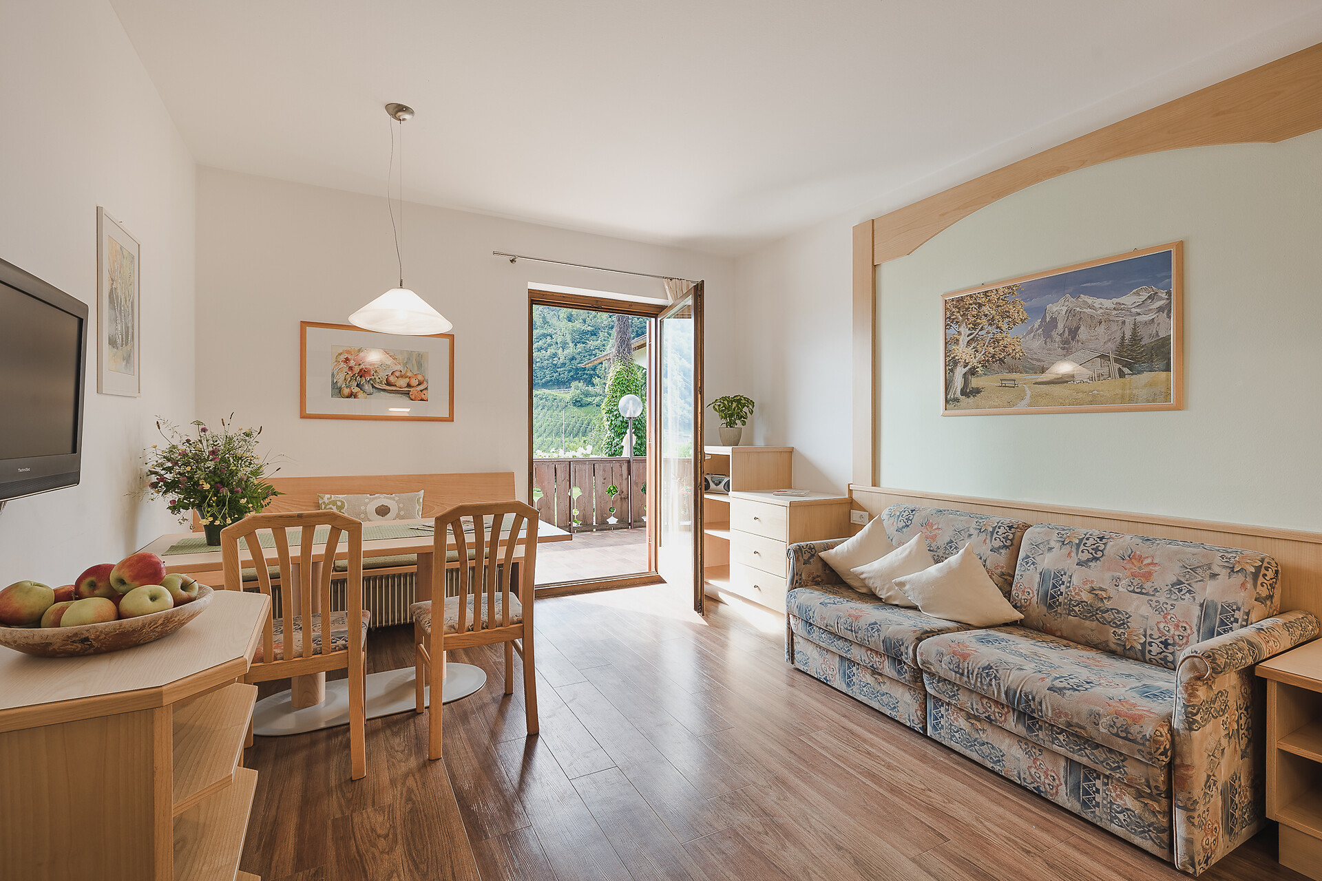 Ferienapartment Christine ca. 53 m² / 2 - 4 Personen / ebenerdig Ideal für Familien und für Paare oder Freundinnen, die getrennt schlafen möchten. Das Besondere an dieser Wohnung: Großes Badezimmer mit Dusche und Badewanne. Die Terrasse hat direkten Zugang zu unserer Apfelwiese "Gala" und einen schönen Blick auf die Apfelwiesen und auf die Berge Ifinger und Hirzer. Ausstattung • 2 Schlafzimmer, eines mit SAT TV (43 Zoll) • Großes Badezimmer mit Tageslicht, Doppelwaschbecken, Regendusche und Badewanne, Kosmetikspiegel und Föhn. • Wohnraum mit Doppelschlafcouch, SAT TV (43 Zoll), Küchenzeile und Essecke. Spülmaschine, Kühlschrank mit Gefrierfach, zwei Kochfelder, Kaffeemaschine (Filter), Wasserkocher und Geschirr. Spülmittel und Tabs sind vorhanden. • Großzügige Terrasse mit Holzmöbel, Sonnenschirm und direkten Zugang nach Draußen • Beschattung durch Jalousien, Safe im Apartment • Leihregenschirm und Holzschuhlöffel • Wlan • Bettwäsche und Handtücher sind vorhanden und werden jederzeit auf Wunsch gewechselt. Bitte Badetücher f&uu