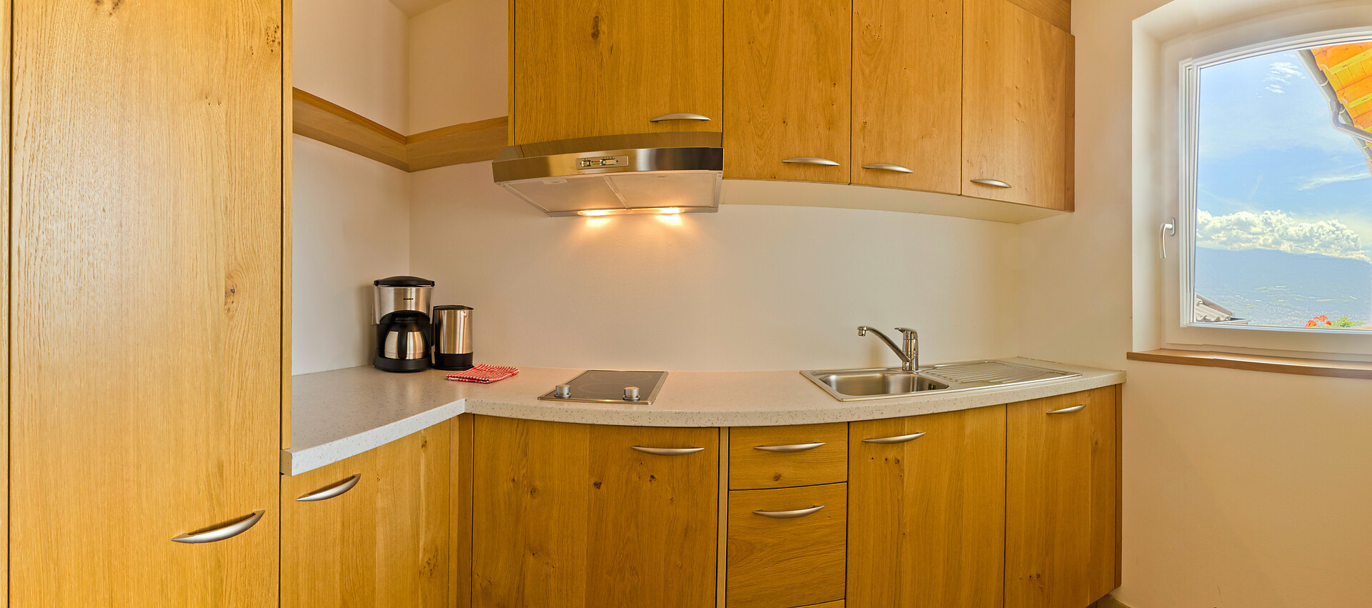 Diese Wohnung ist komfortabel und modern eingerichtet. Sie hat 44m², ein modernes Bad, eine voll eingerichtete Kücher, einen Südbalkon mit Blick auf Meran und auf die Talweite. Diese Wohnung ist einräumig, aber sehr geräumig. Im Schlafbereich steht ein gemütliches Doppelbett, im Wohnbereich ein Sofa mit Panoramablick, eine moderne Küche mit Spülmaschine, Induktionsherd, Toaster und Kaffeemaschine.