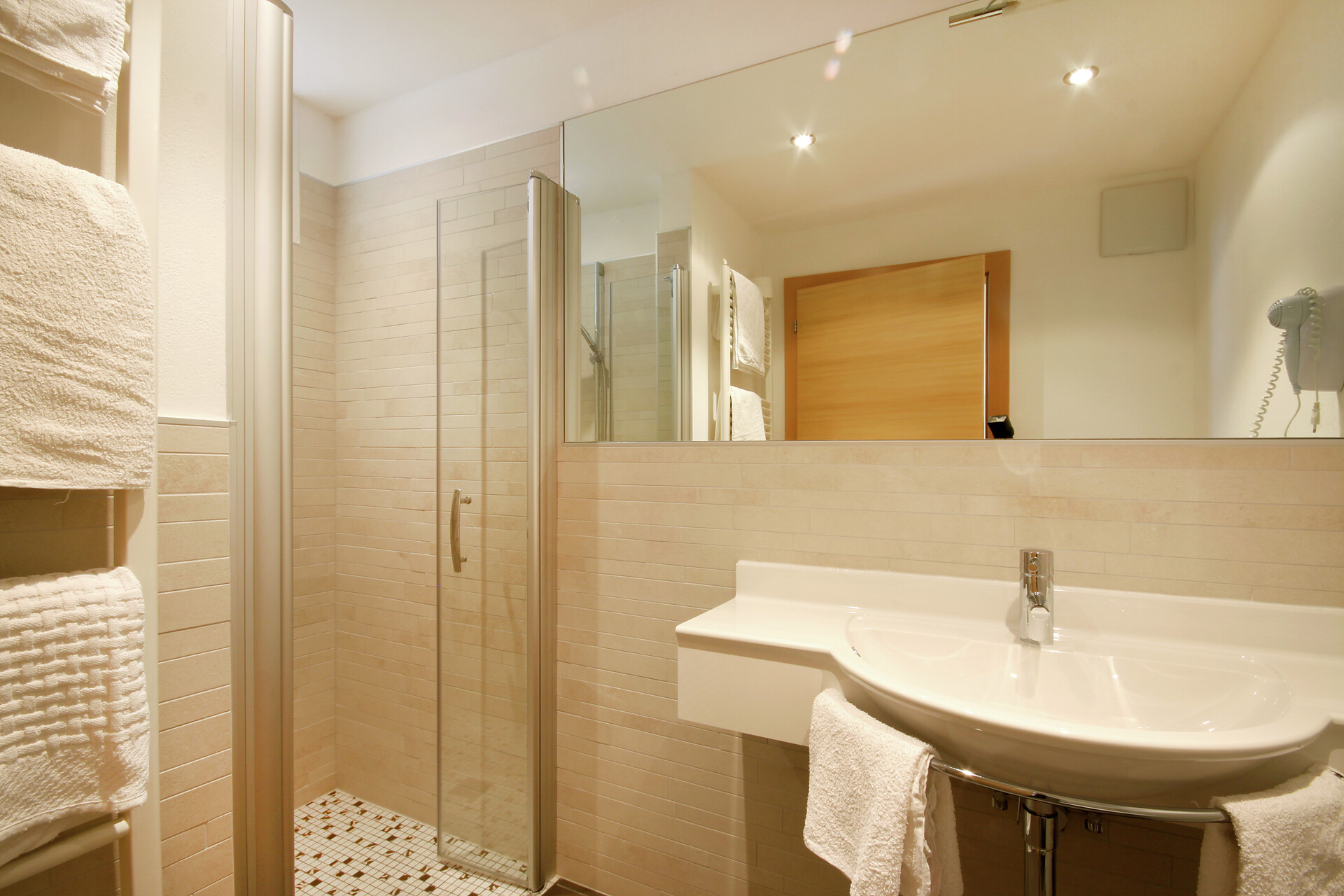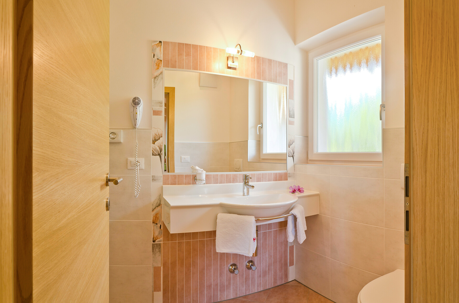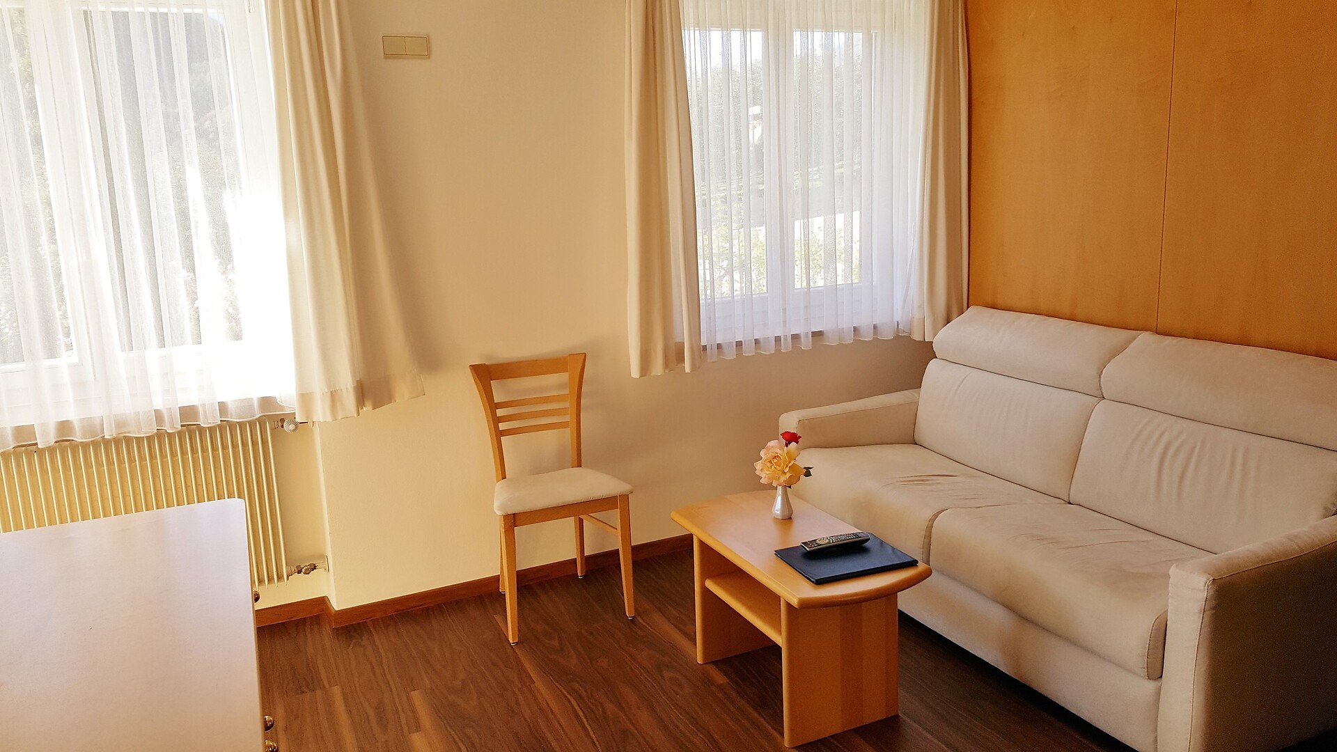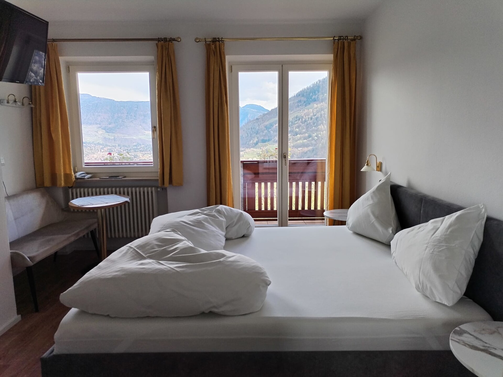 ein Doppelzimmer 26m² mit Südbalkon oder Süd-Ostbalkon und Meranblick im 3. Stock. Dieses Zimmer ist renoviert und es ist mit Sitzecke, Sofa, Kühlschrank, Telefon, HD- Flachbildschirm, Internetanschluss, Safe, Bad mit Dusche/WC, Fenster und Haarfön ausgestattet.