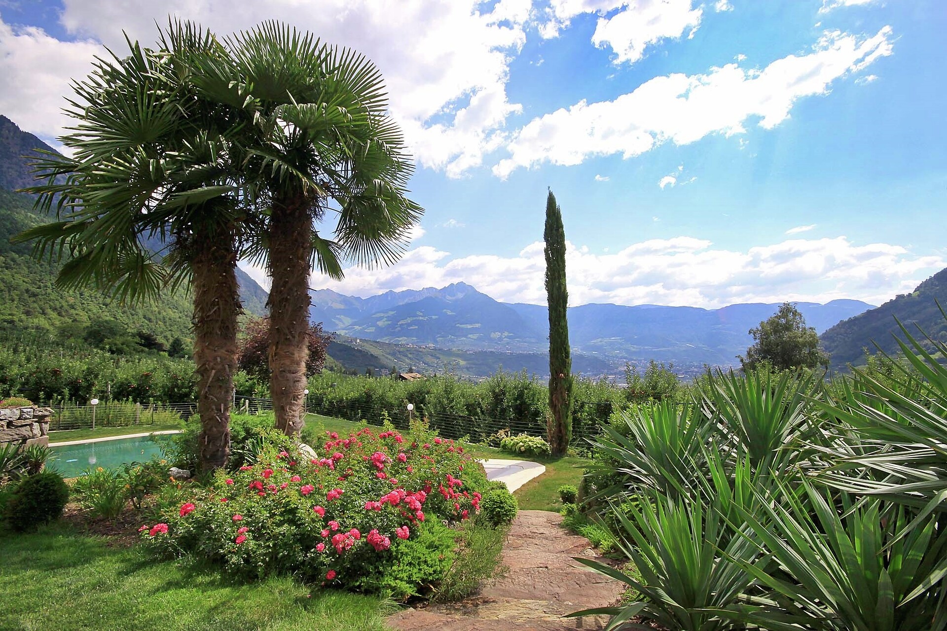 Eine liebevoll gepflegte Gartenanlage und eine ruhige, sonnige Liegewiese umrahmen unsere Pension. Die Zimmer, Suiten und Ferienwohnungen sind hell und freundlich eingerichtet, mit Dusche, WC, Telefon, Wifi, Safe, HD- Flachbildschirm 42 Zoll, Kühlschrank (zum Großteil) und Balkon mit Panoramablick. In unserer Dependance sind über diesen Winter 6 neue und moderne Ferienwohnungen entstanden. Ein bequemes Ambiente wo man abschalten und den Alltag vergessen kann. Ein bisschen relaxen, endlich wieder Zeit finden für sich selbst.... Sonnenliegen in unserer neu errichteten Sole-Poolanlage und im mediterranen Garten, umgeben von Obstgärten und schönen Blick auf Meran und auf unserer Bergwelt!