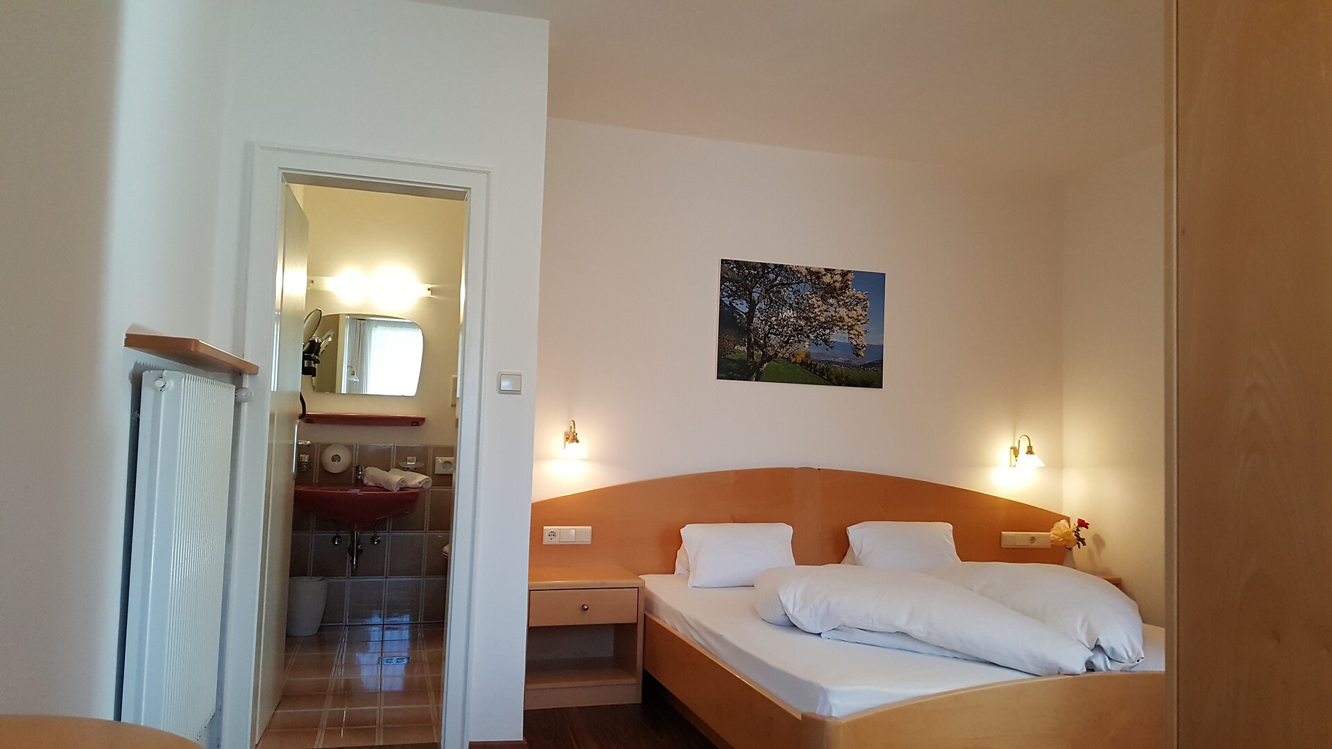 ein hell möbliertes Doppelzimmer 18m² mit Südbalkon und Blick auf Schloss Tirol und Meran in der 1. Balkonetage. Dieses Zimmer ist mit Telefon, HD- Flachbildschirm, Kühlschrank,Internetanschluss, Safe, kleinem Bad mit Dusche/WC und Haarfön und einer kl. Sitzecke ausgestattet.