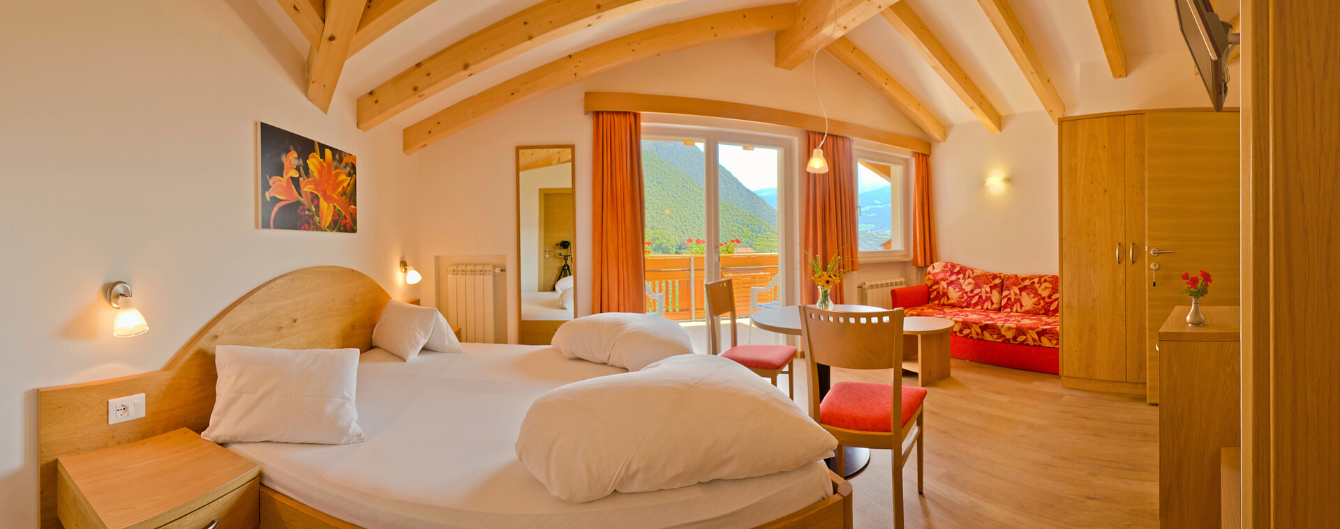 Doppelzimmer, Doppelbett, Bettsofa, Balkon, Terrasse, Wohnecke, Allergikerzimmer, Minibar, Safe, Nichtraucherzimmer, Dusche / Bad, Haarfön, TV, Satellit/Kabel, WLAN, Internetanschluss, Haupthaus, Panoramablick, Südseite