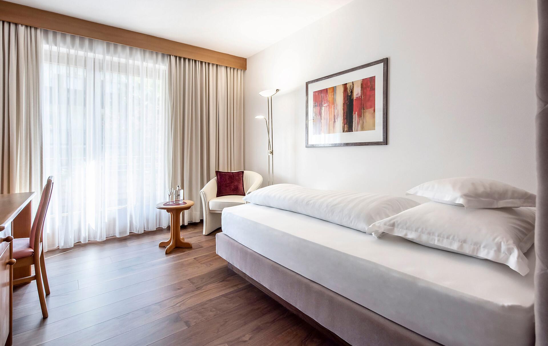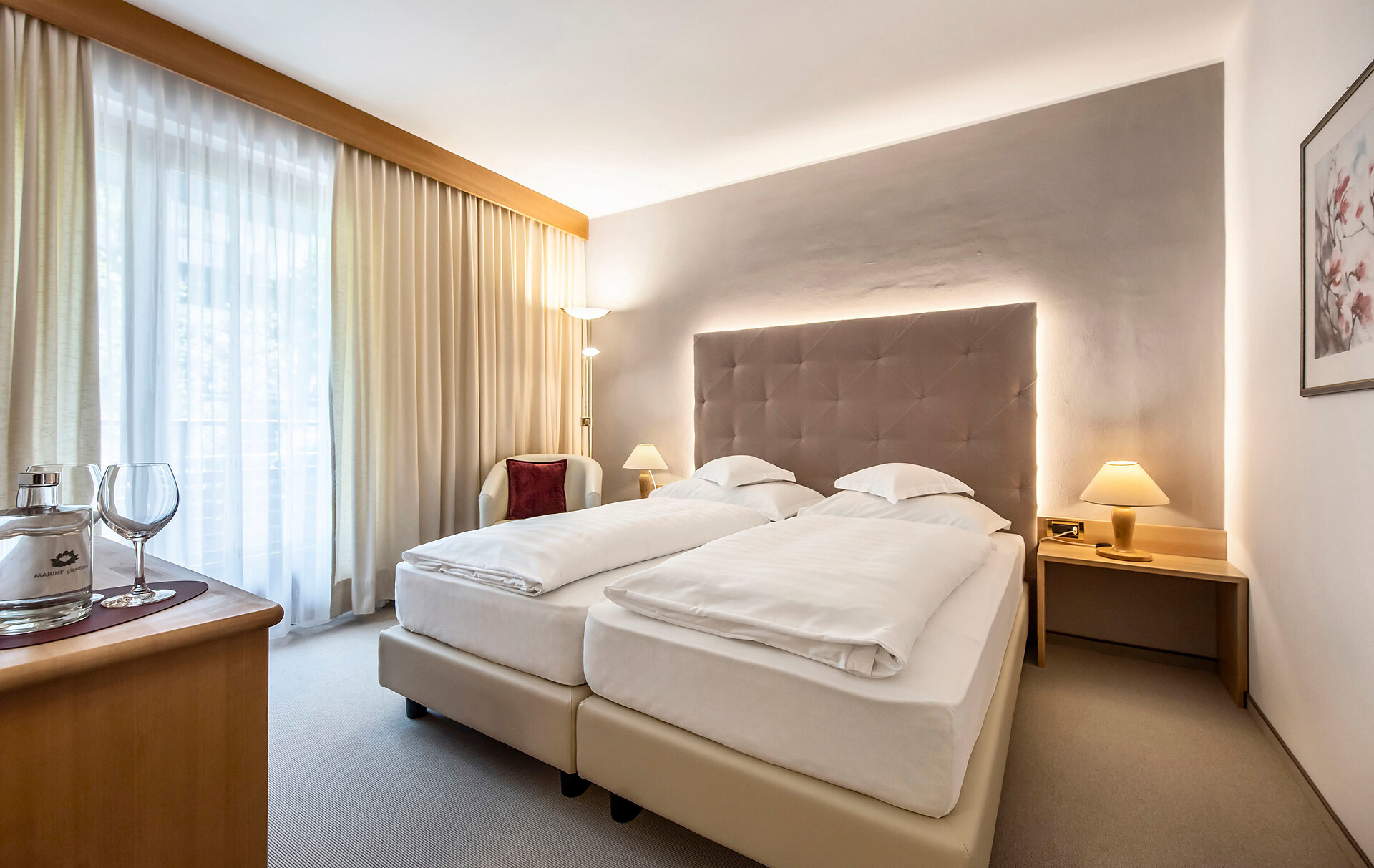 Geräumiges Superior Doppelzimmer im Landhausstil, mit Südbalkon und natürlich unserem unschlagbaren Marini- Panorama. Diese klassischen Zimmer mit Buche-Vollholzmöbeln und floralen Stoffen sind ausgesprochen hell und heimelig. Sie sind alle mit Teppichboden ausgestattet
