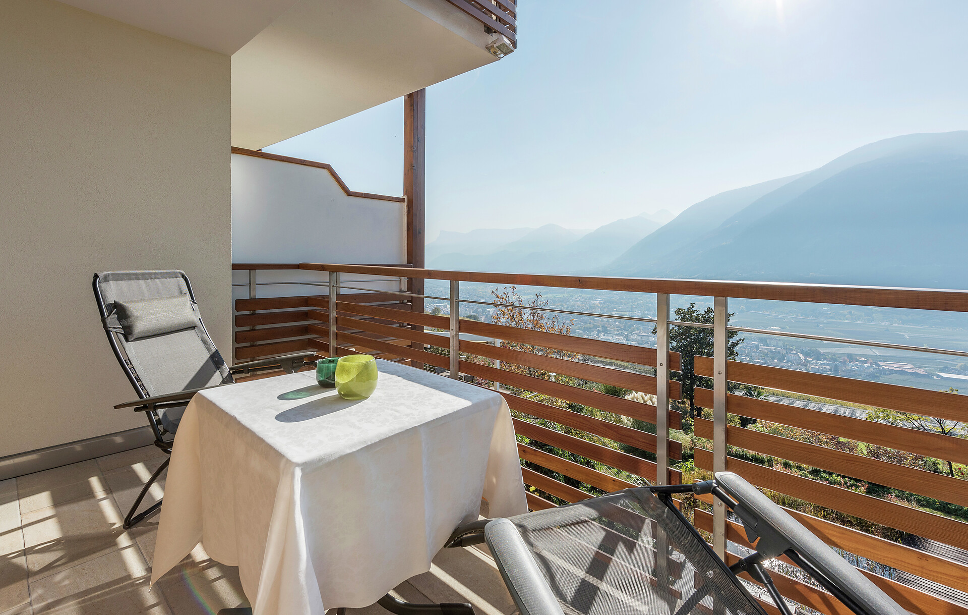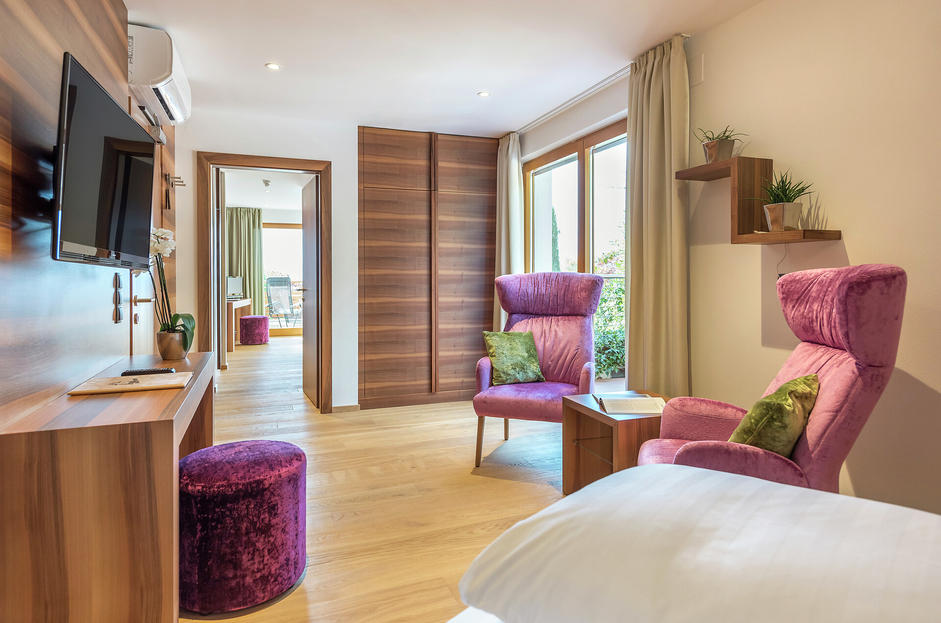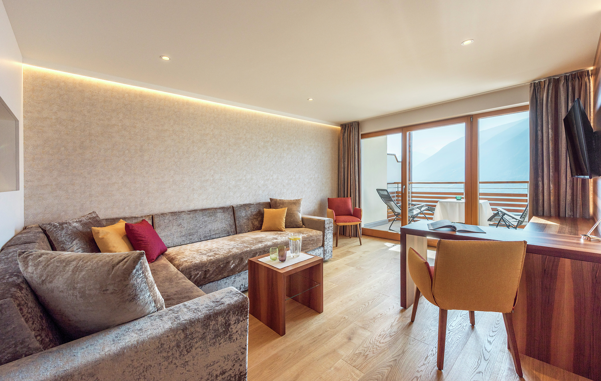 Wohnliche modern ausgestattete Komfortzimmer mit klaren Linien und frischen Farben. Reichlich Platz um auch mal mehr Zeit im Zimmer zu verbringen. Marinis Panorama vom Südbalkon und diese Ruhe natürlich nicht zu vergessen.
