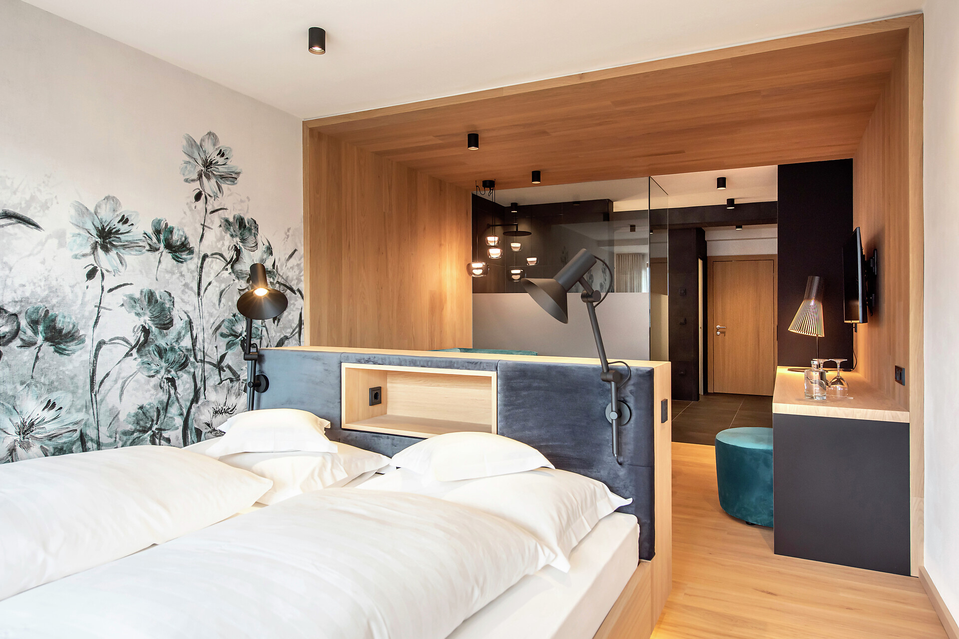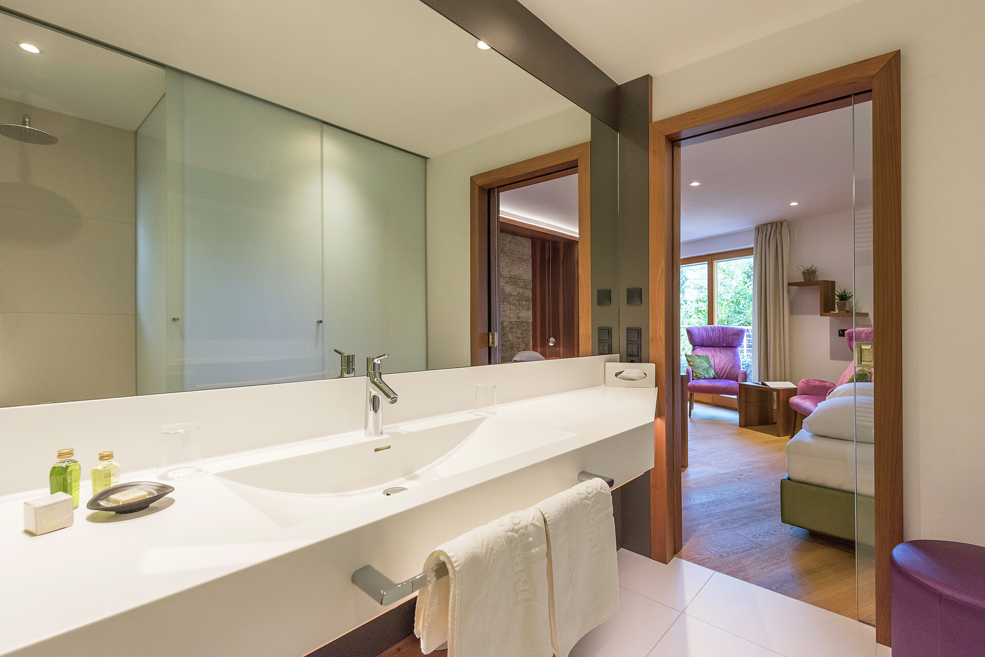 Großzügig, mit viel Platz in modernem Stil zeigen sich unsere Mohnsuiten. Zwei ganz besondere Suiten die sich farblich und im Grundriss völlig unterscheiden. Gemeinsam haben sie jedoch die getrennte Schlafmöglichkeit sowie das herrliche Panoramafenster mit Südbalkon. Ihr Urlaubsluxus ist das großzügige Badezimmer und die extra große Dusche.