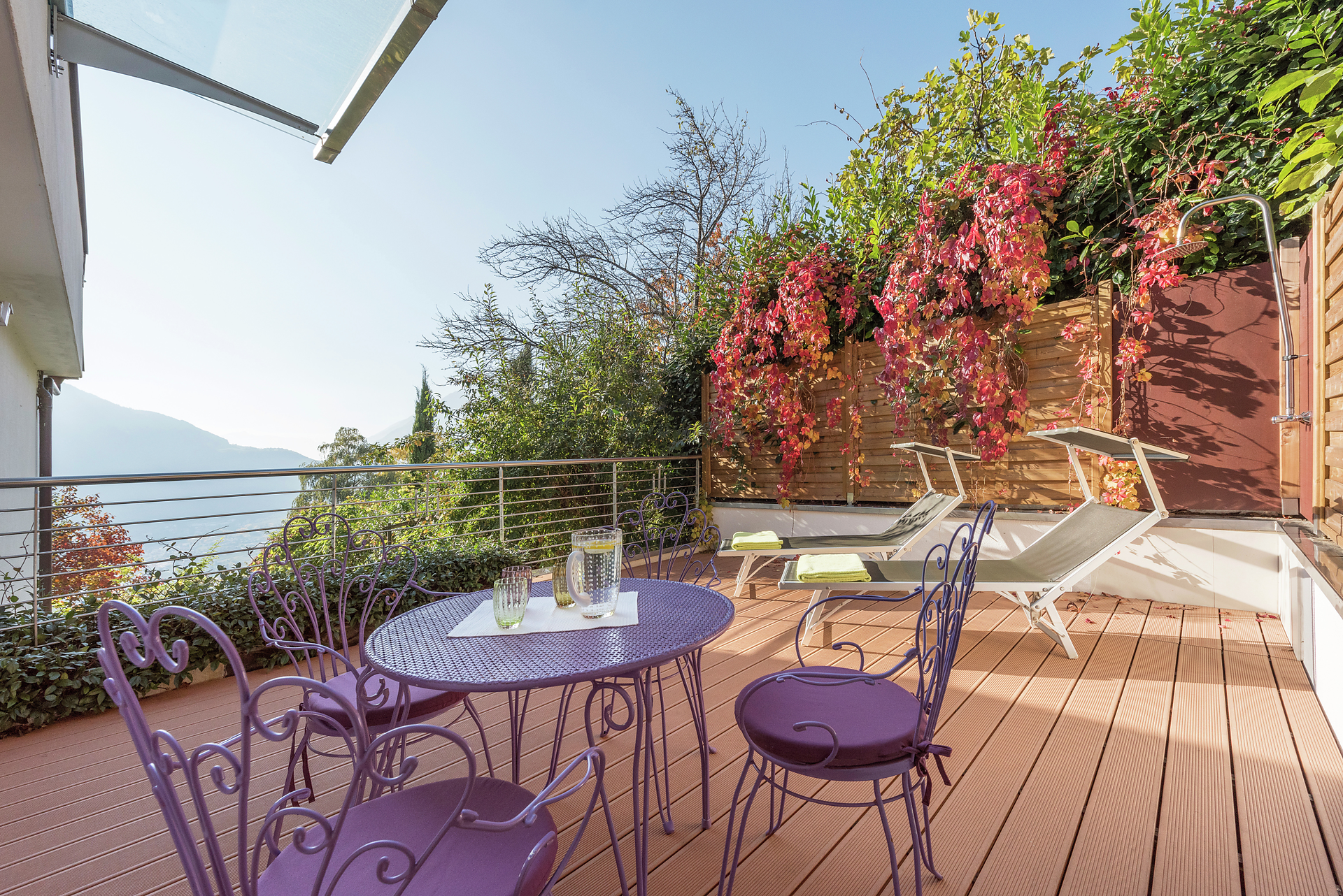 Großzügige uneinsichtige Terrasse mit Nachmittagssonne und einer Outdoor-Regendusche zugänglich nur vom Doppelzimmer