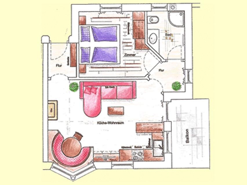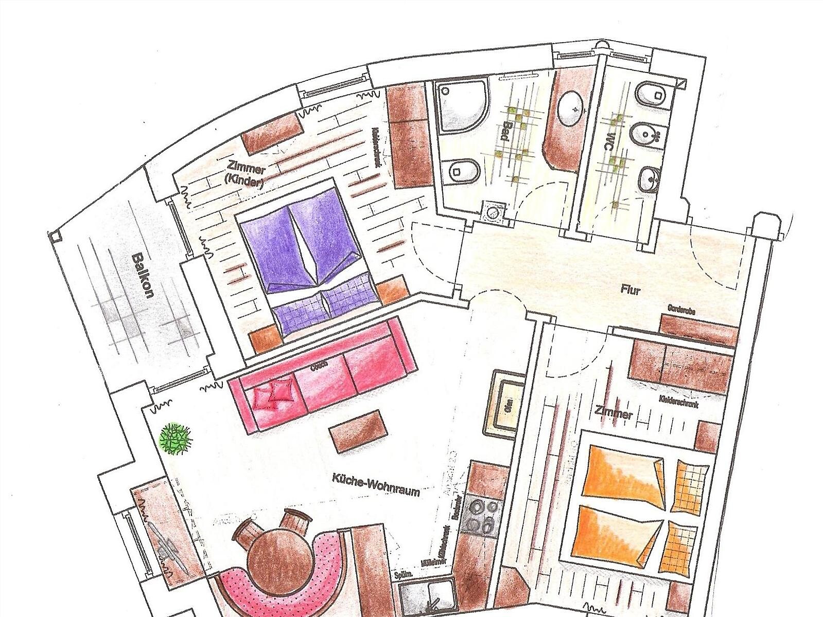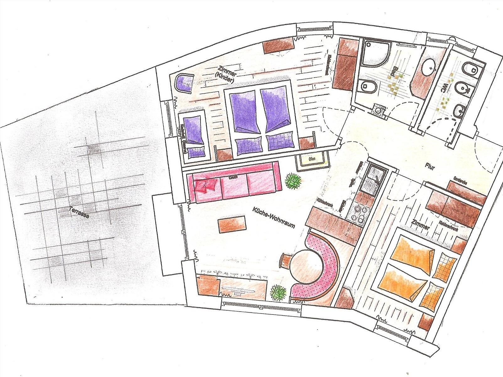 Die Wohnung 65 m² groß. Sie besteht aus einer großen Wohnküche mit kleinem Bauernofen, 2 Schlafzimmer, Dusche, 2 WC, Bidet und einer großen Südterrasse. Die Wohnung ist mit Sat.TV, Safe, Fön, Spülmaschine ausgestattet.