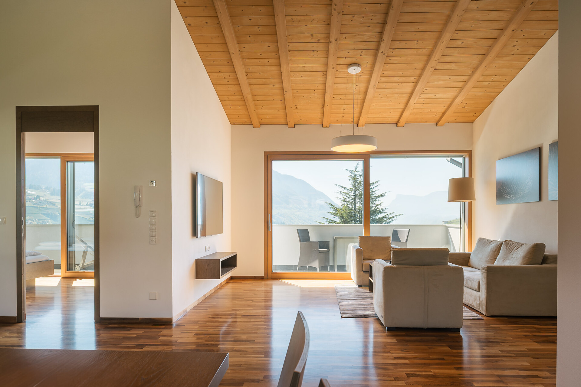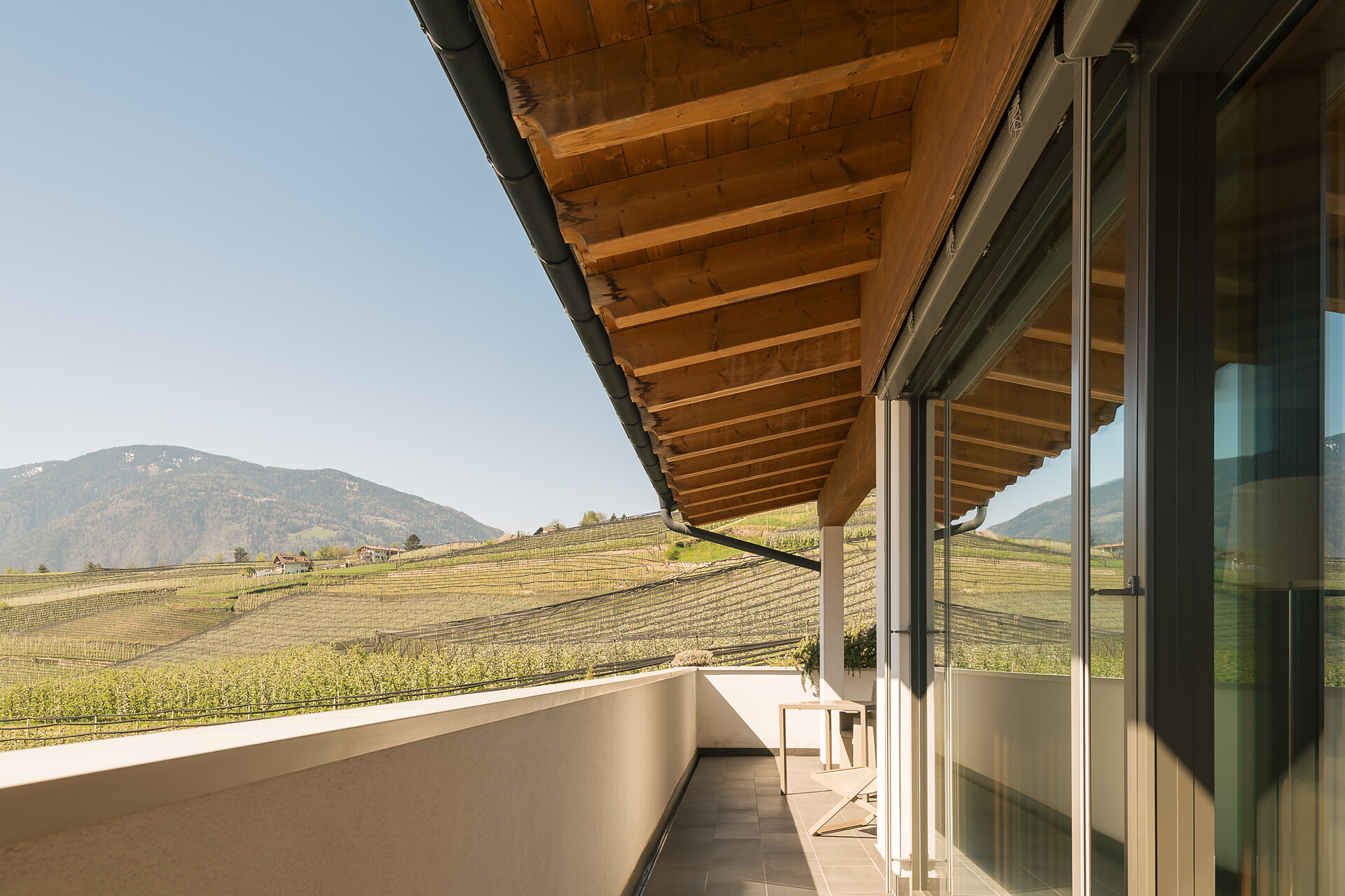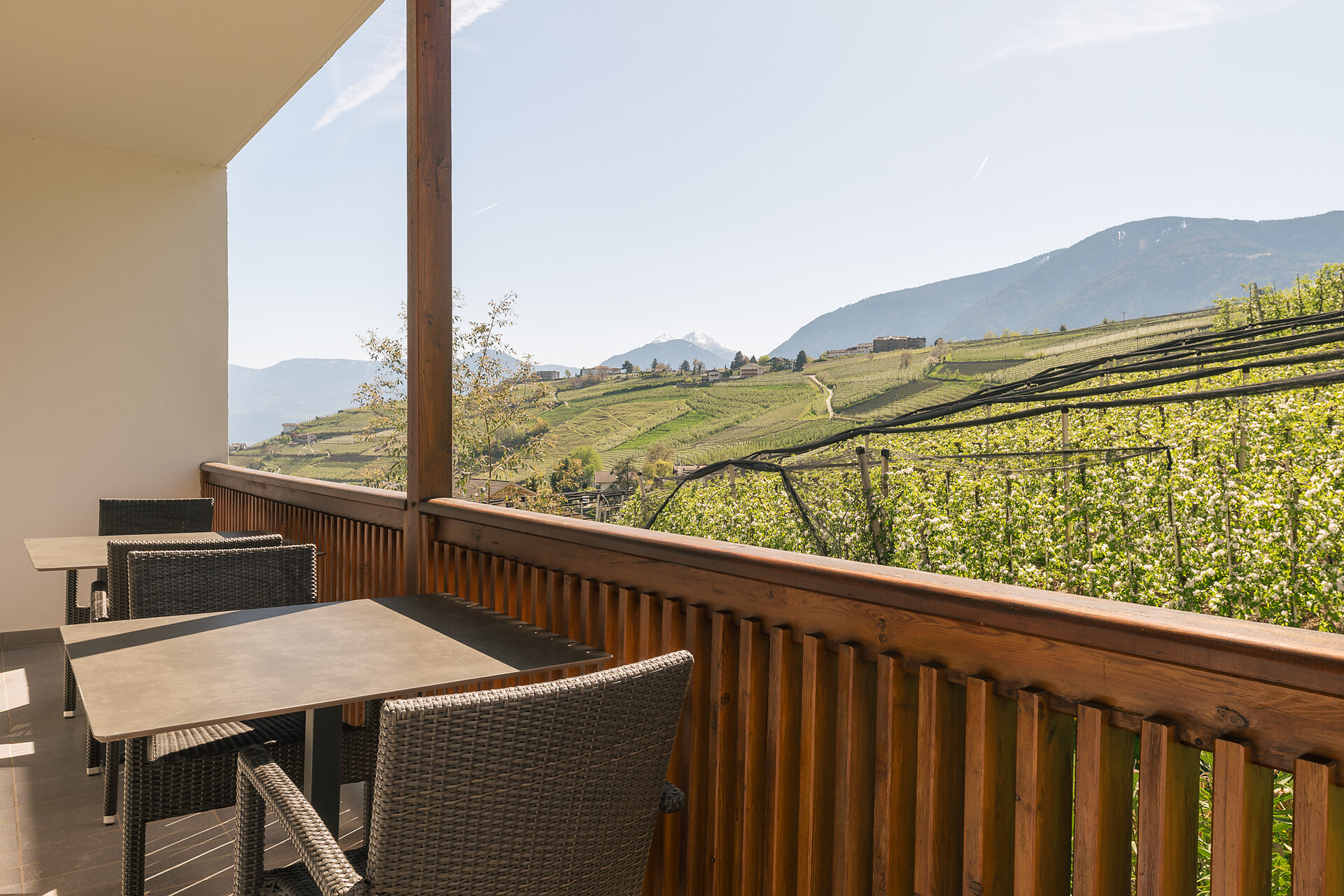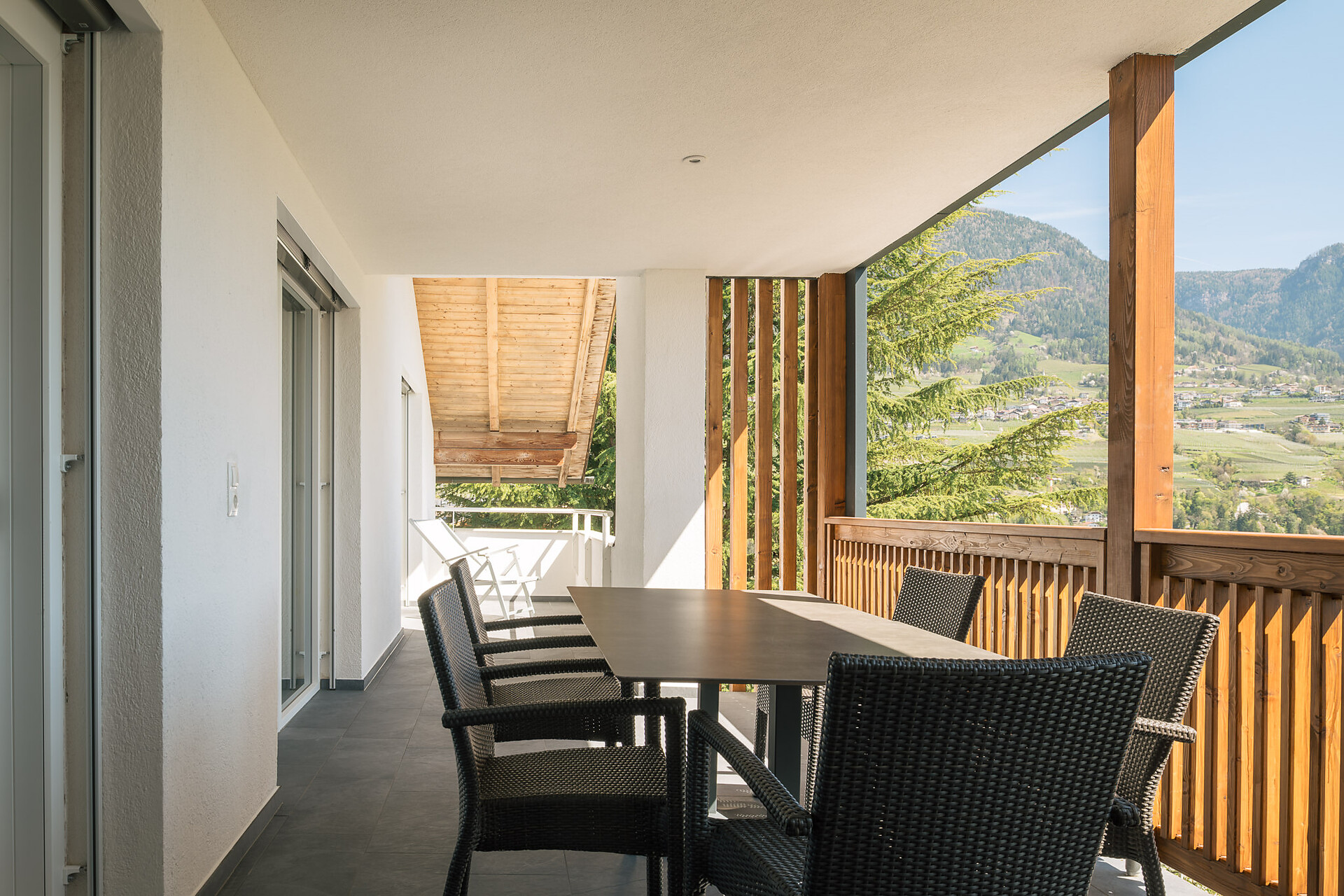 Appartement 1-4, geeignet für 2-4 Personen, ca. 74 m², das Appartement ist mit edlen Materialien und mit Holzboden ausgestattet, es verfügt über eine große überdachte Südterrasse mit Panoramablick auf Meran und das Etschtal, eine Belüftungsanlage reguliert die Be- und Entlüftung sowie Heizung und Kühlung. Alle Fenster und Balkontüren sind mit elektr. Raffstore ausgestattet.