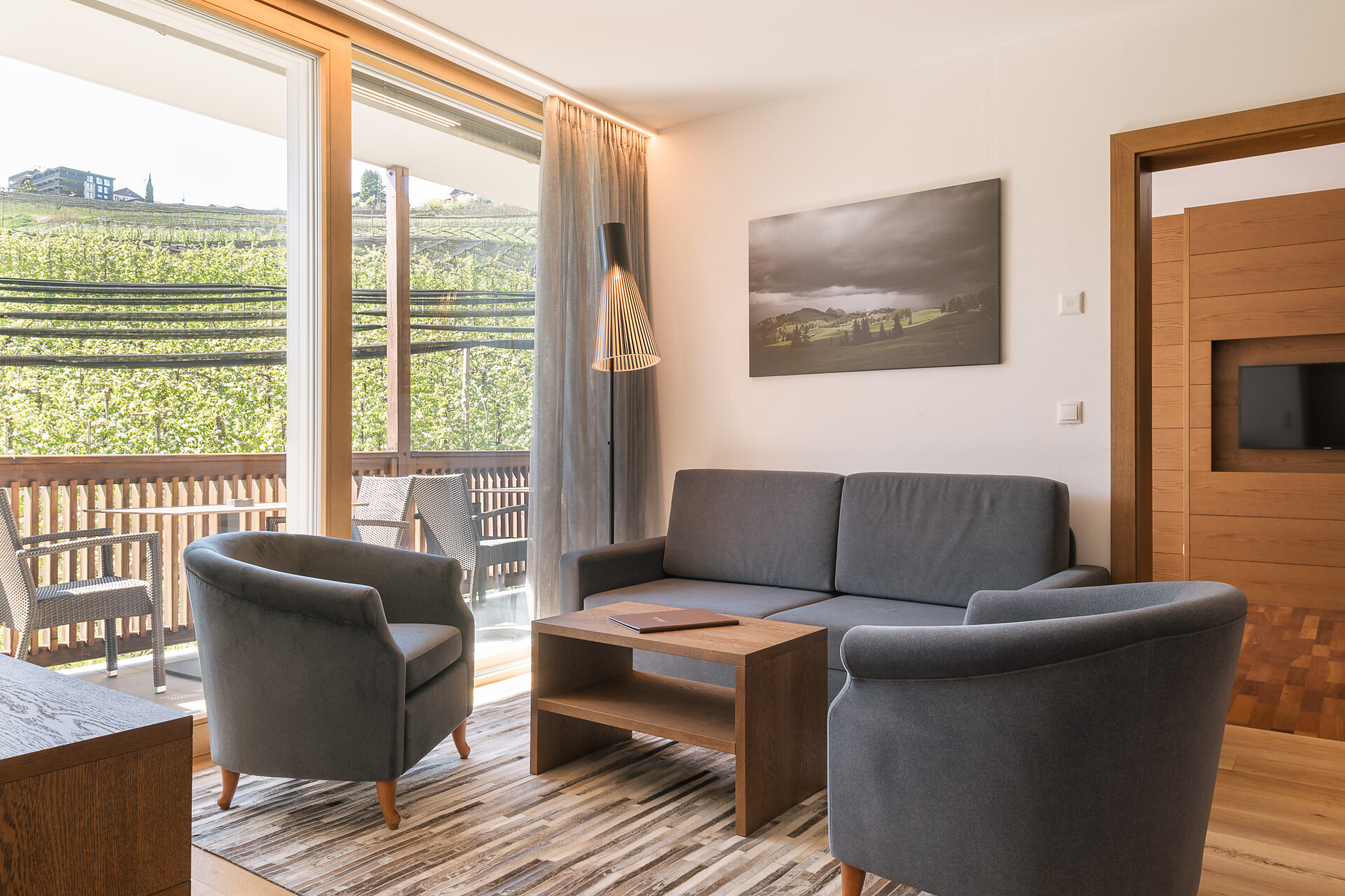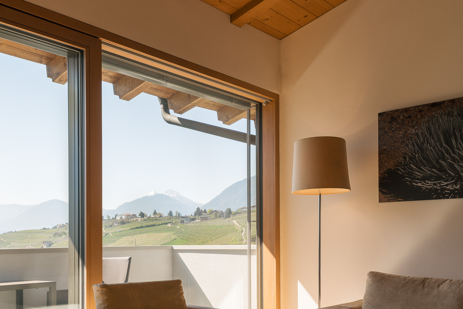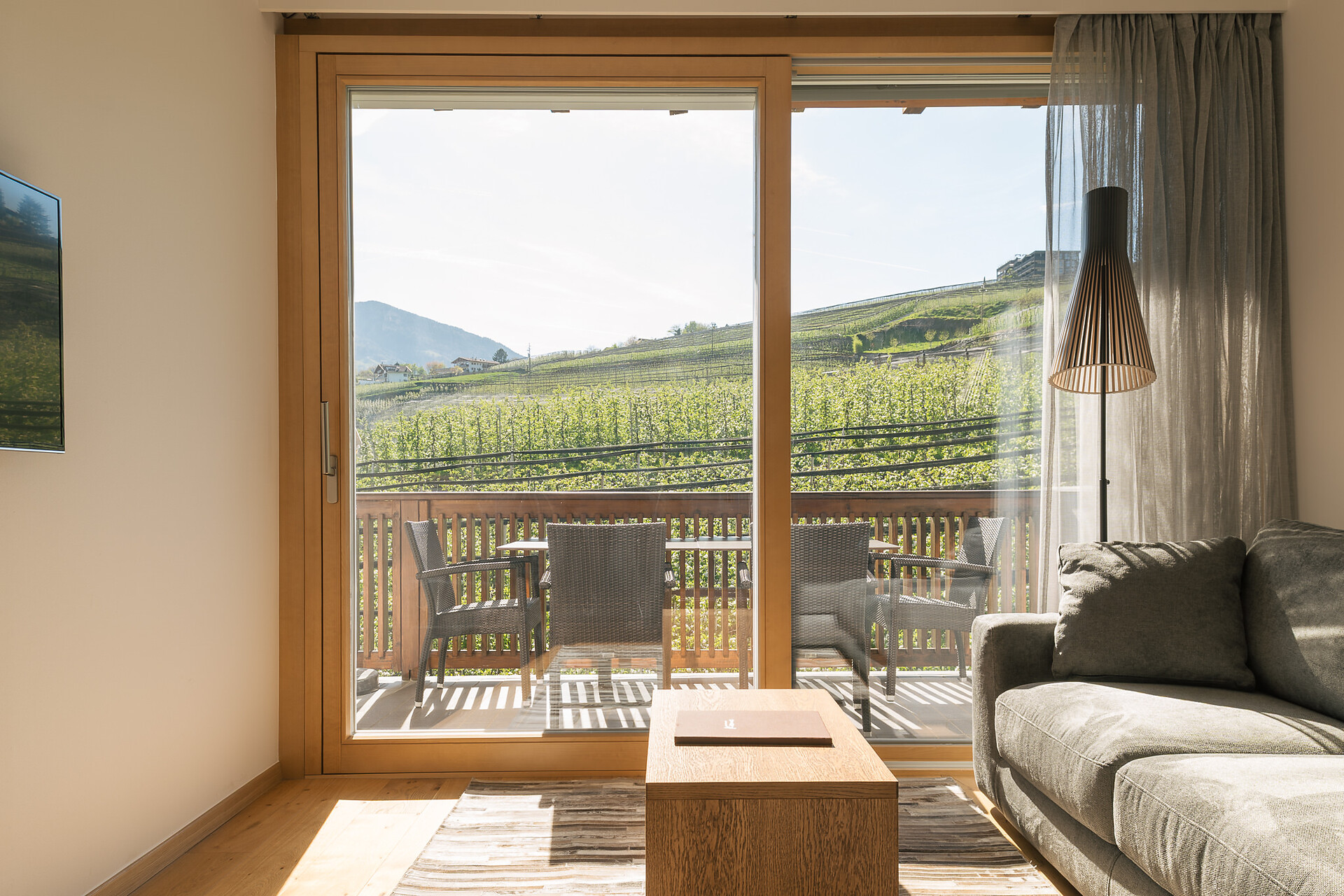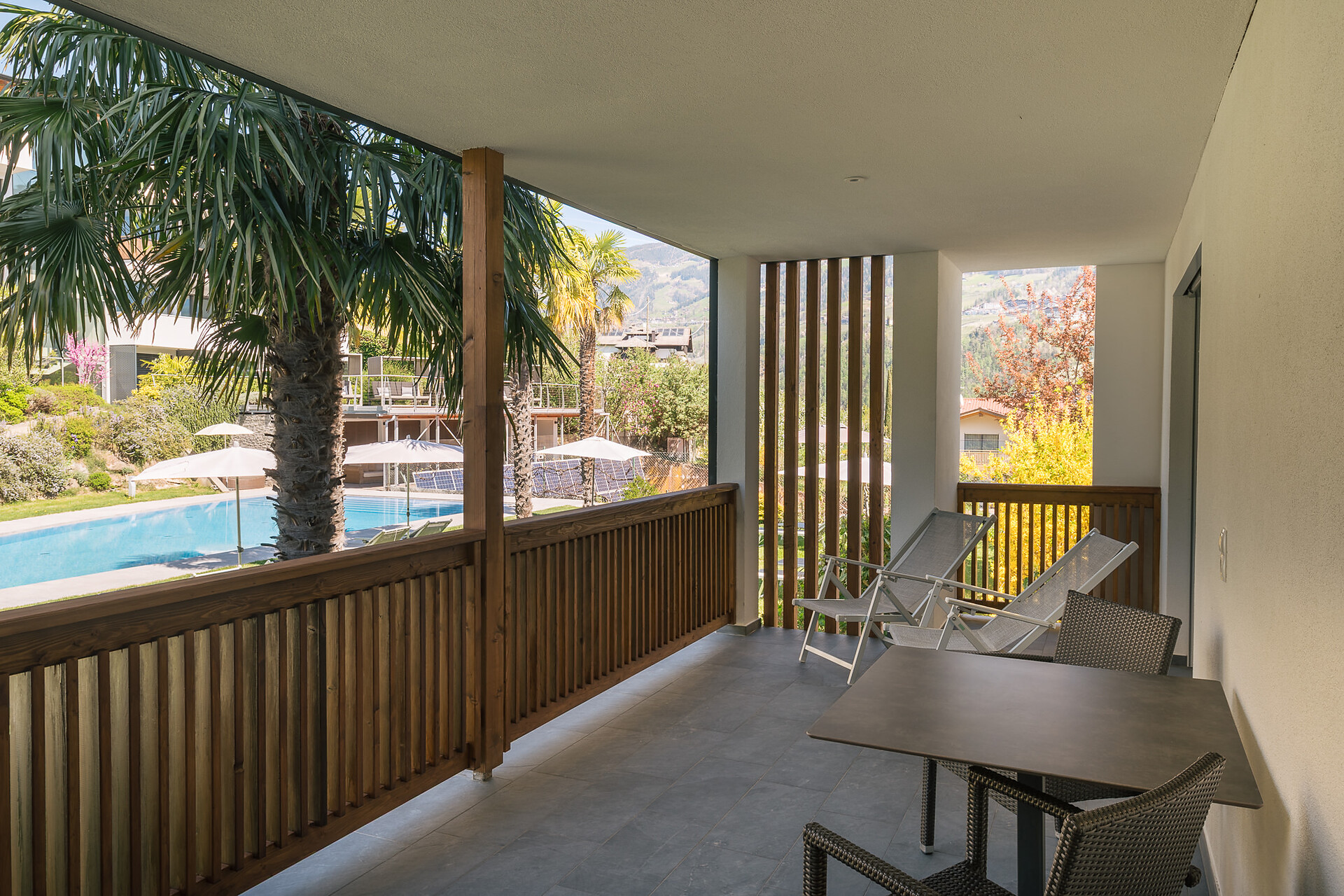 Appartement 1-4, geeignet für 2-4 Personen, ca. 74 m², das Appartement ist mit edlen Materialien und mit Holzboden ausgestattet, es verfügt über eine große überdachte Südterrasse mit Panoramablick auf Meran und das Etschtal, eine Belüftungsanlage reguliert die Be- und Entlüftung sowie Heizung und Kühlung. Alle Fenster und Balkontüren sind mit elektr. Raffstore ausgestattet.