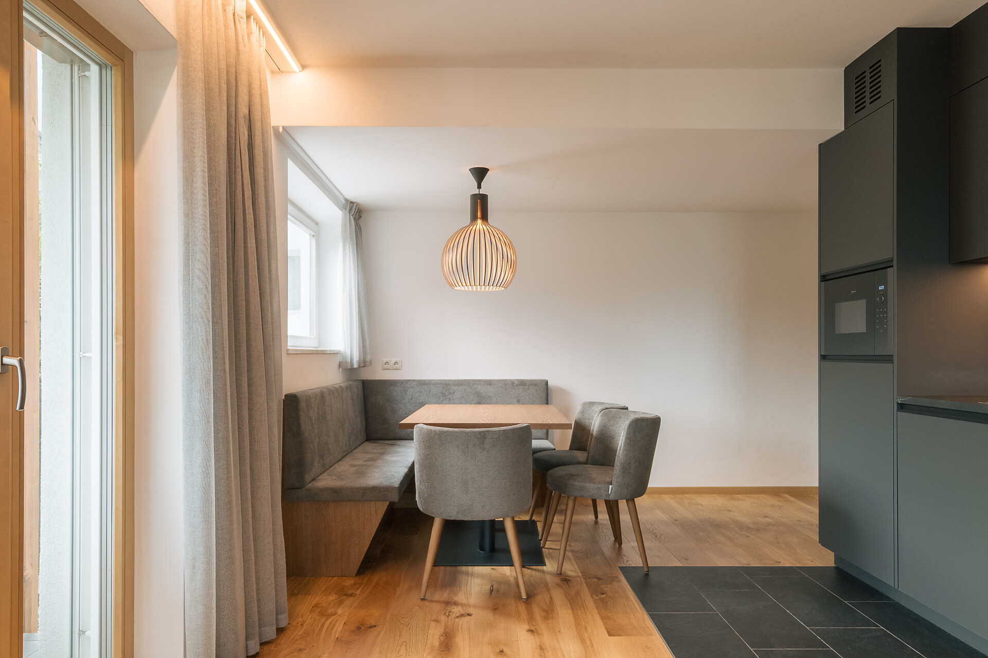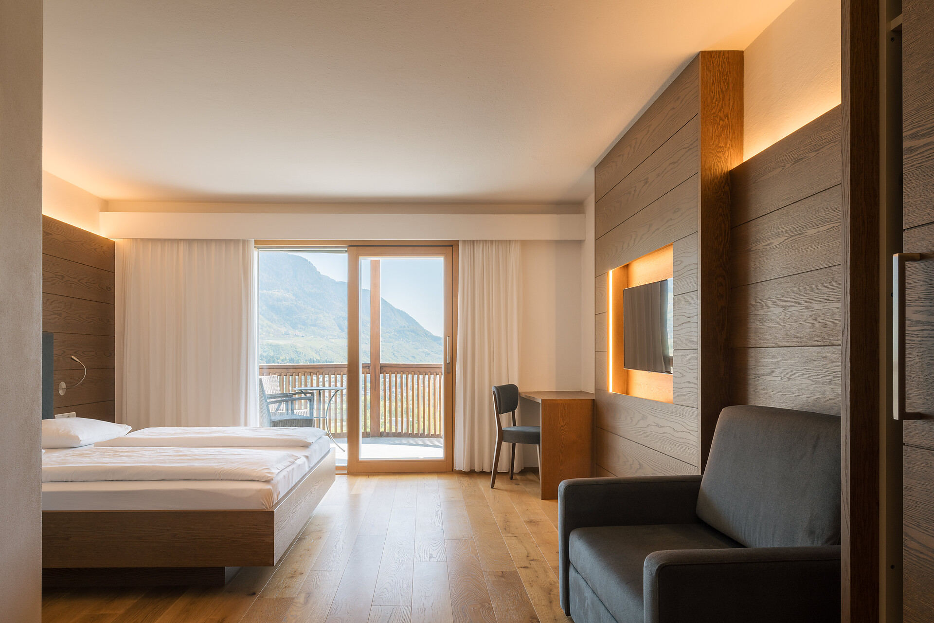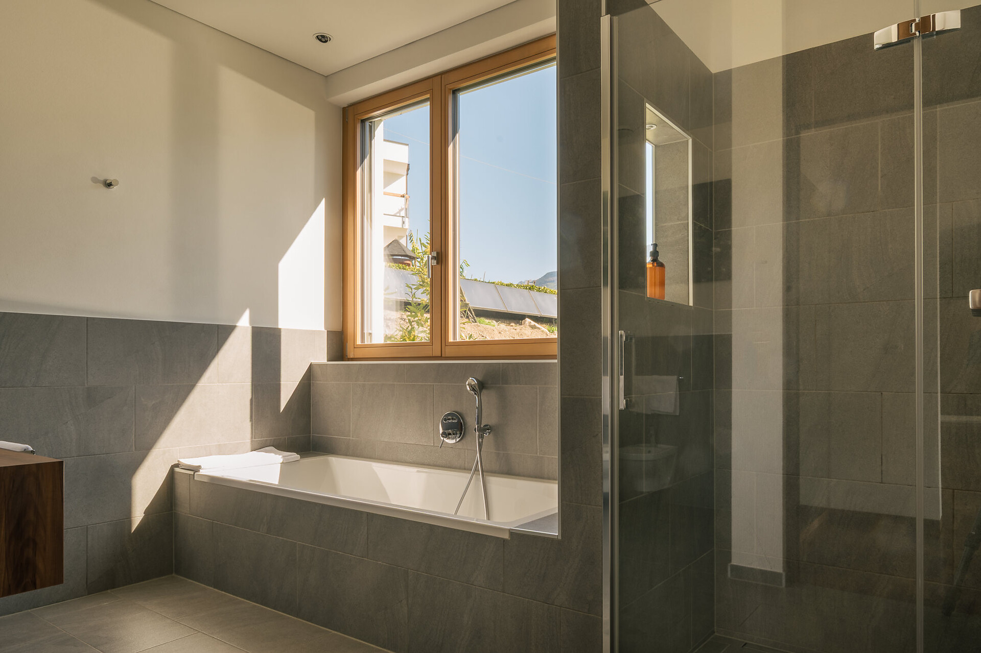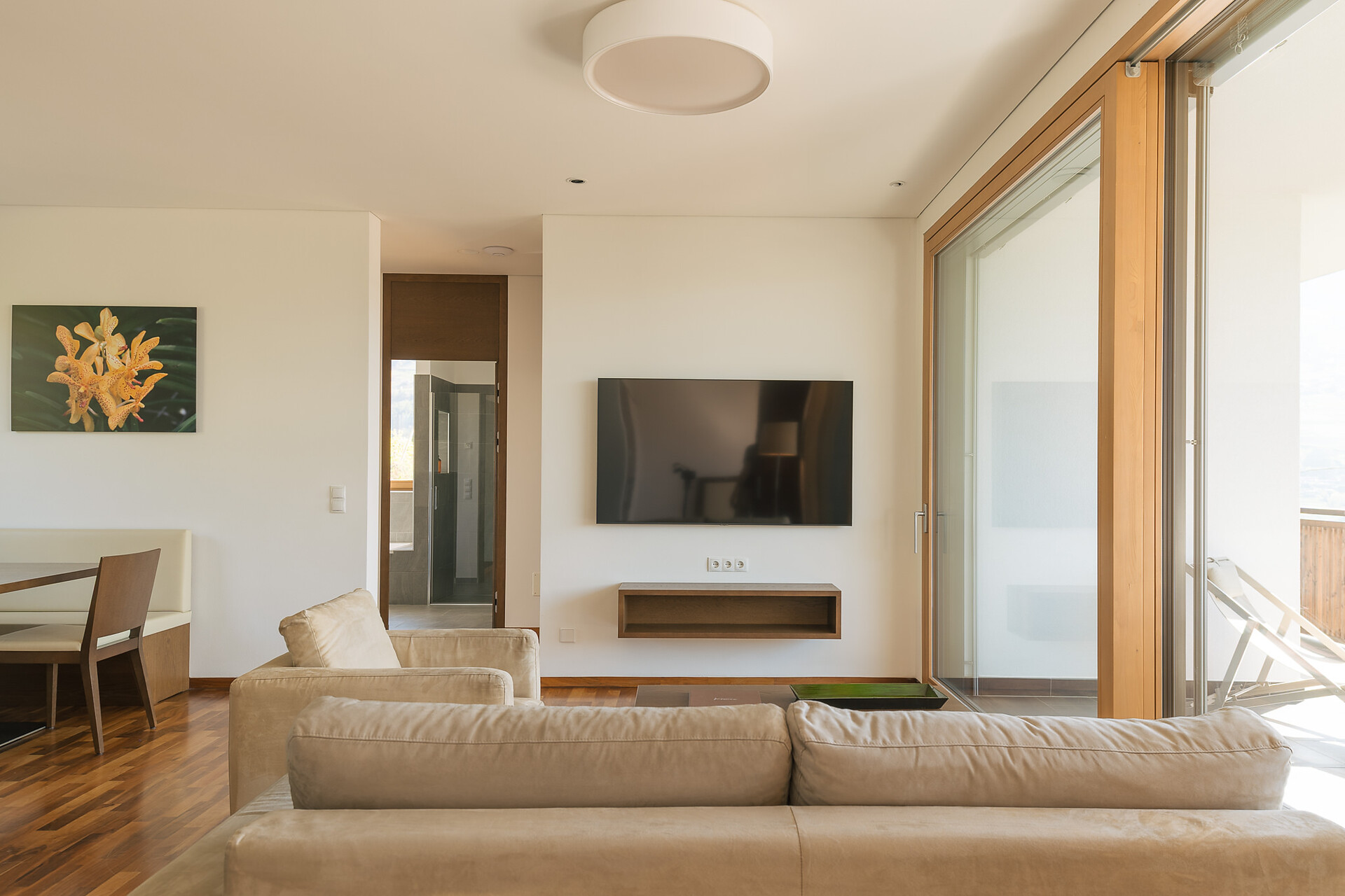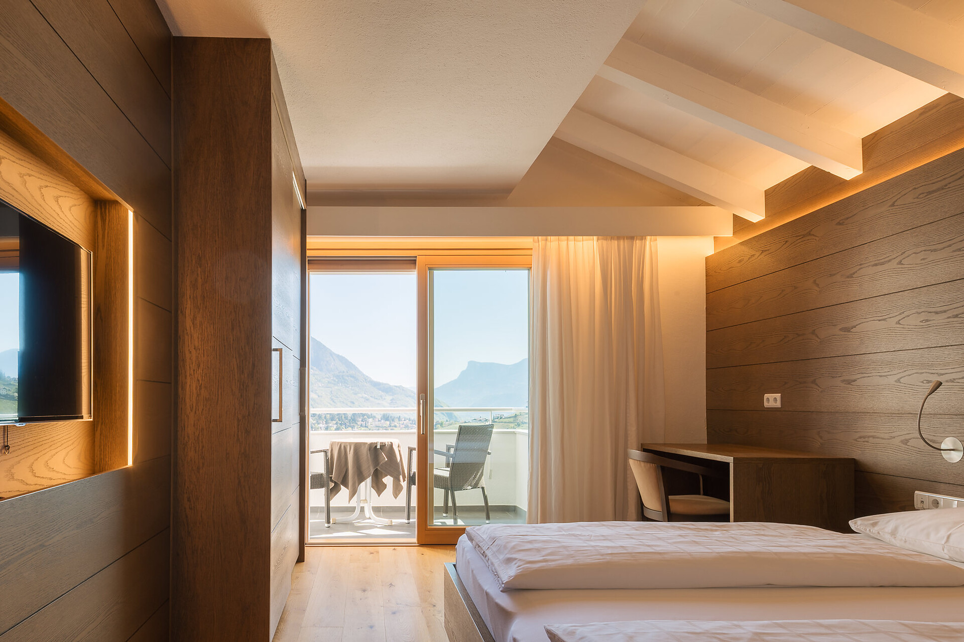 Appartement 1-4, geeignet für 2-4 Personen, ca. 74 m², das Appartement ist mit edlen Materialien und mit Holzboden ausgestattet, es verfügt über eine große überdachte Südterrasse mit Panoramablick auf Meran und das Etschtal, eine Belüftungsanlage reguliert die Be- und Entlüftung sowie Heizung und Kühlung. Alle Fenster und Balkontüren sind mit elektr. Raffstore ausgestattet.