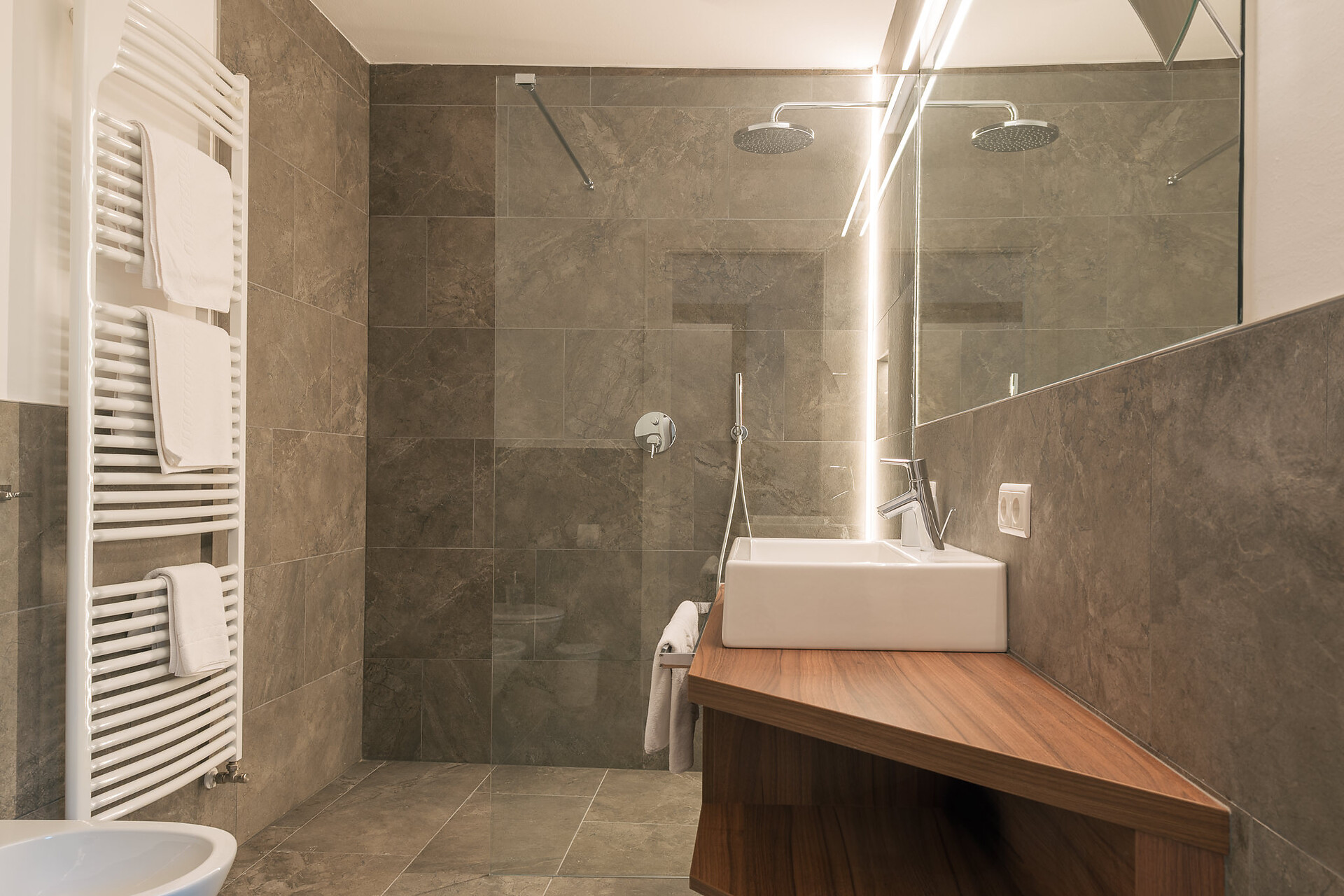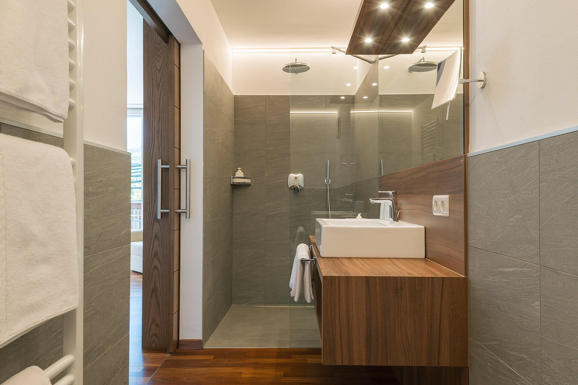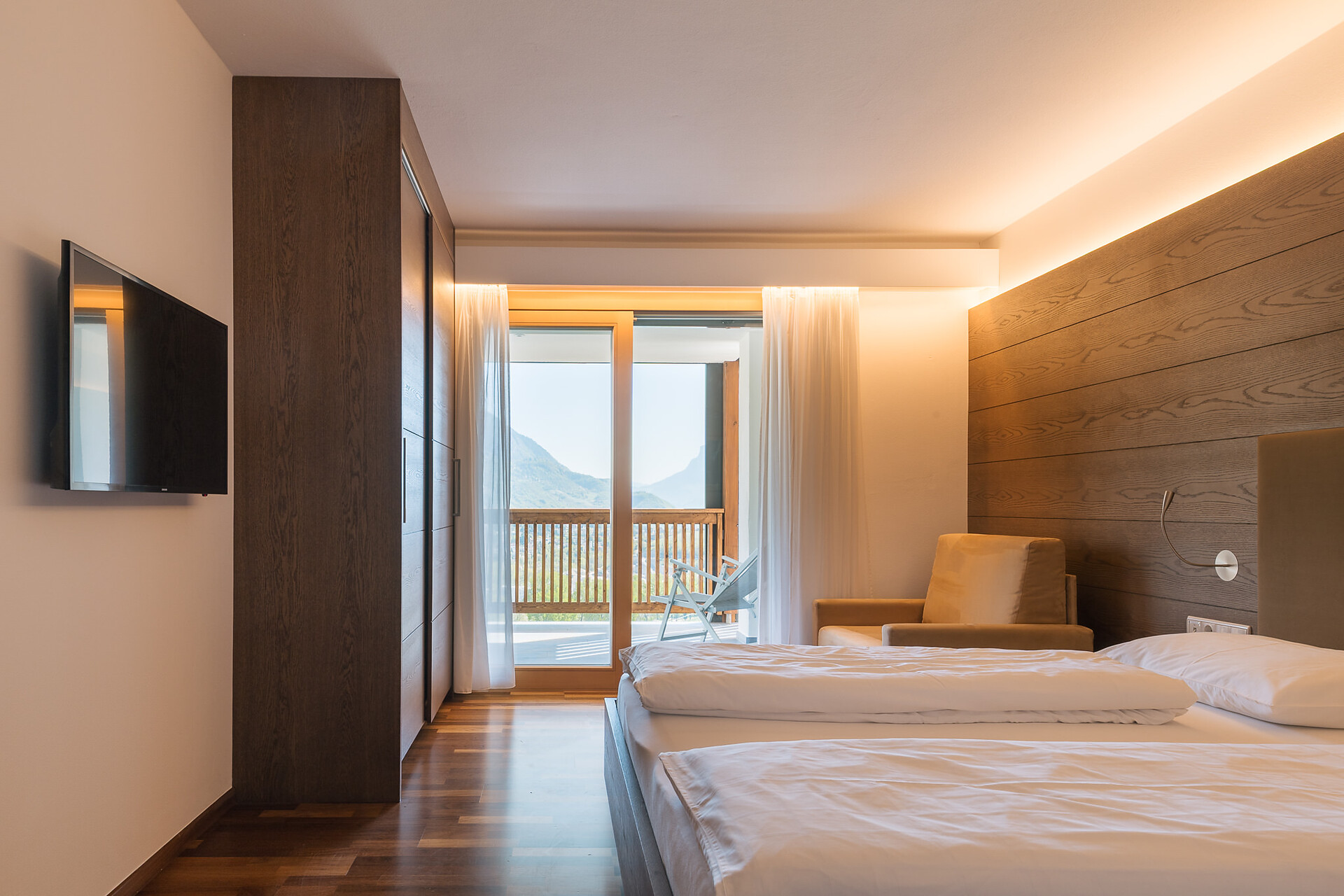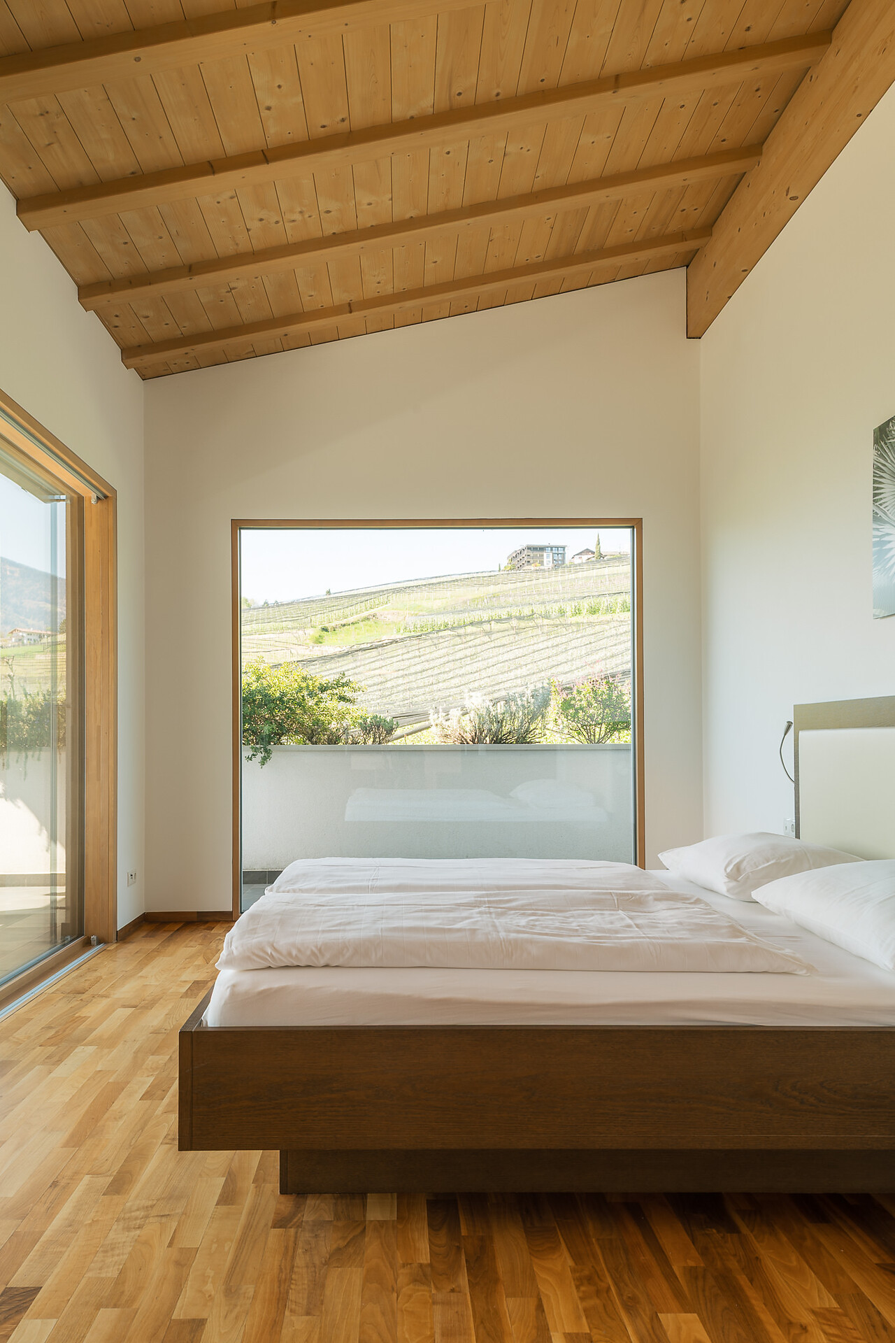 Appartement 1-4, geeignet für 2-4 Personen, ca. 74 m², das Appartement ist mit edlen Materialien und mit Holzboden ausgestattet, es verfügt über eine große überdachte Südterrasse mit Panoramablick auf Meran und das Etschtal, eine Belüftungsanlage reguliert die Be- und Entlüftung sowie Heizung und Kühlung. Alle Fenster und Balkontüren sind mit elektr. Raffstore ausgestattet.