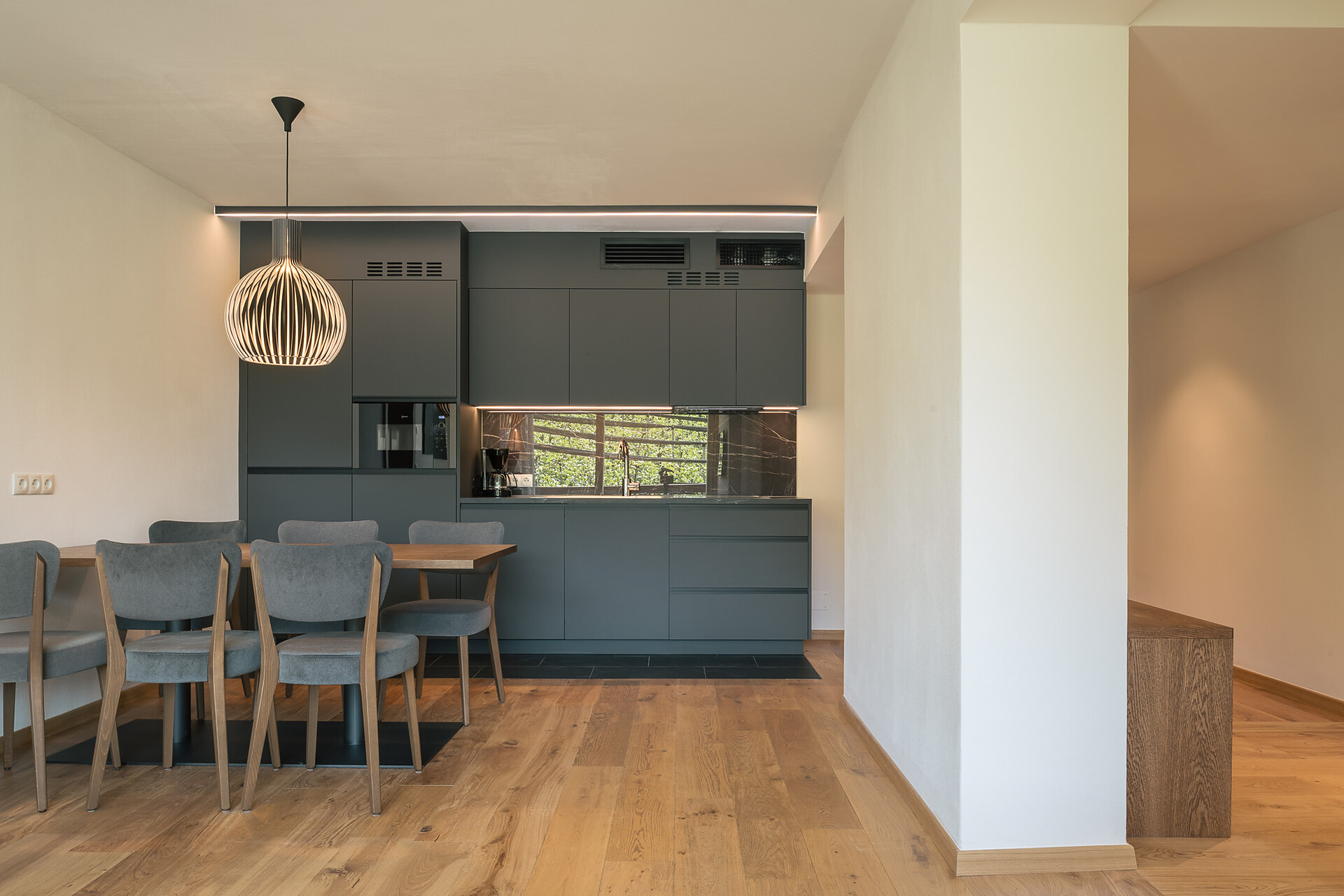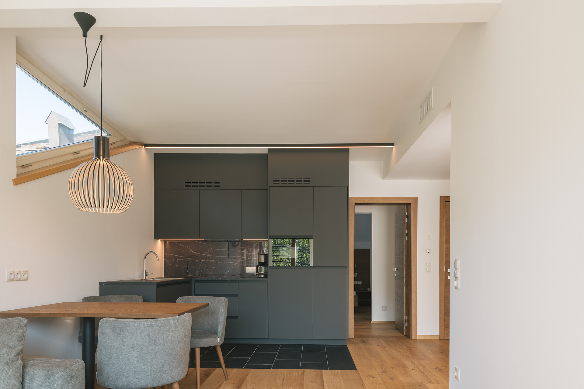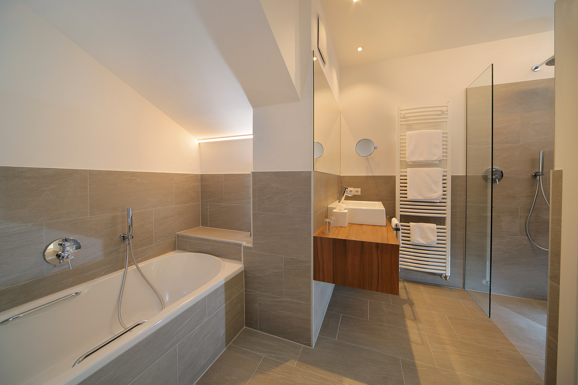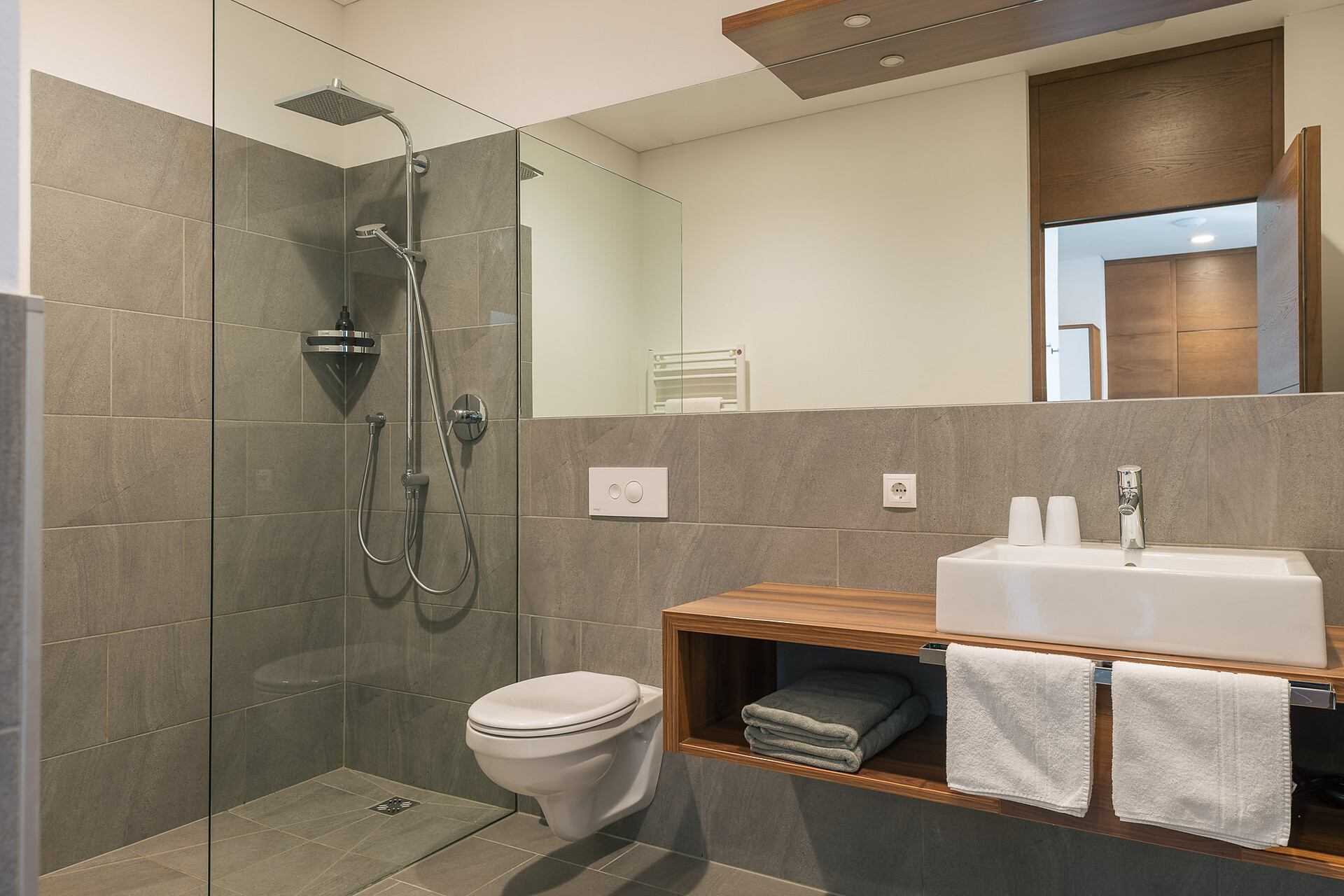 Appartement 1-4, geeignet für 2-4 Personen, ca. 74 m², das Appartement ist mit edlen Materialien und mit Holzboden ausgestattet, es verfügt über eine große überdachte Südterrasse mit Panoramablick auf Meran und das Etschtal, eine Belüftungsanlage reguliert die Be- und Entlüftung sowie Heizung und Kühlung. Alle Fenster und Balkontüren sind mit elektr. Raffstore ausgestattet.
