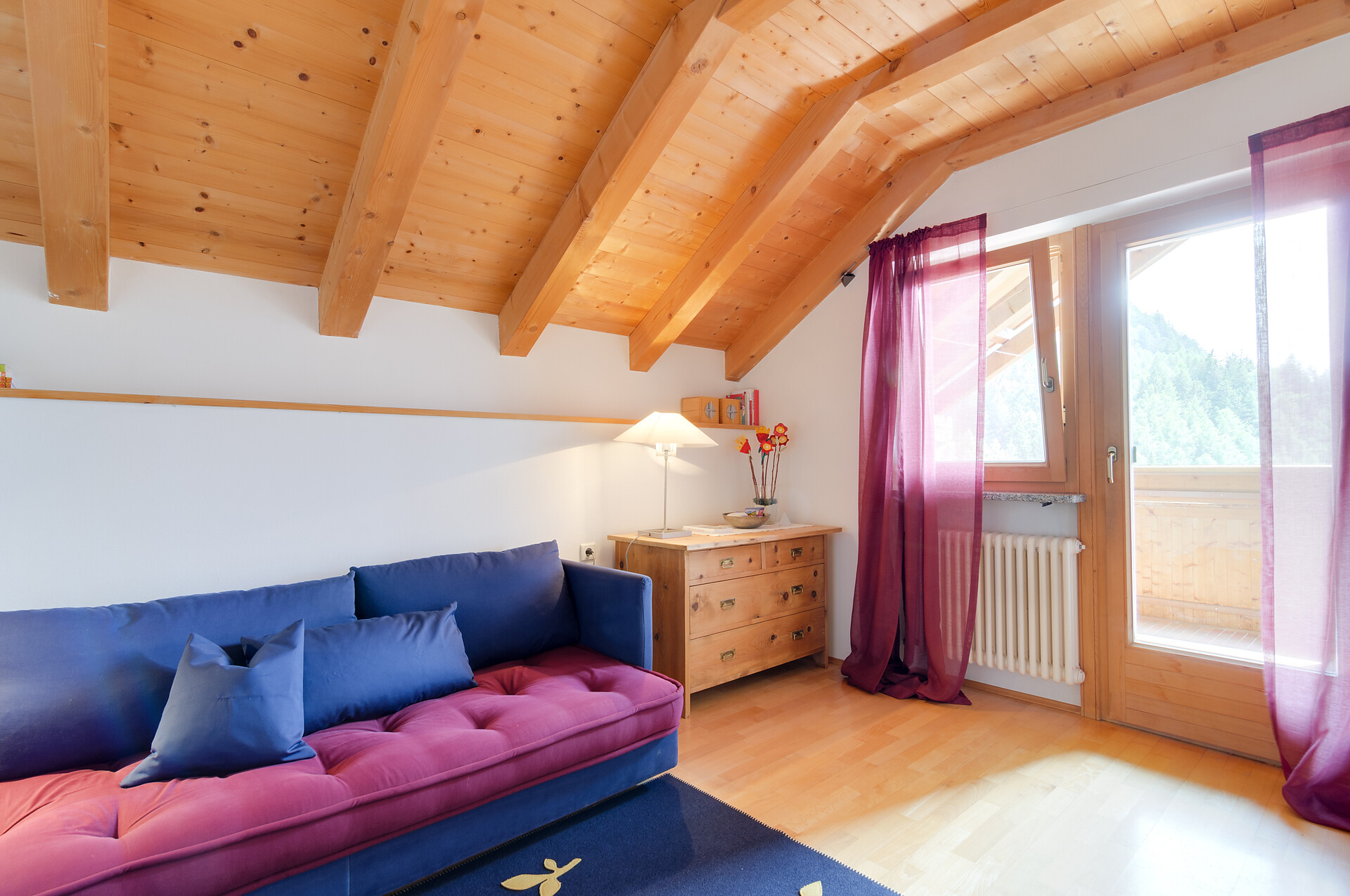 The lovingly furnished apartment is on the attic floor. The appartment has one bed room, a bathroom with shower/tub, a living room with kitchenette, eating area and two balconies.