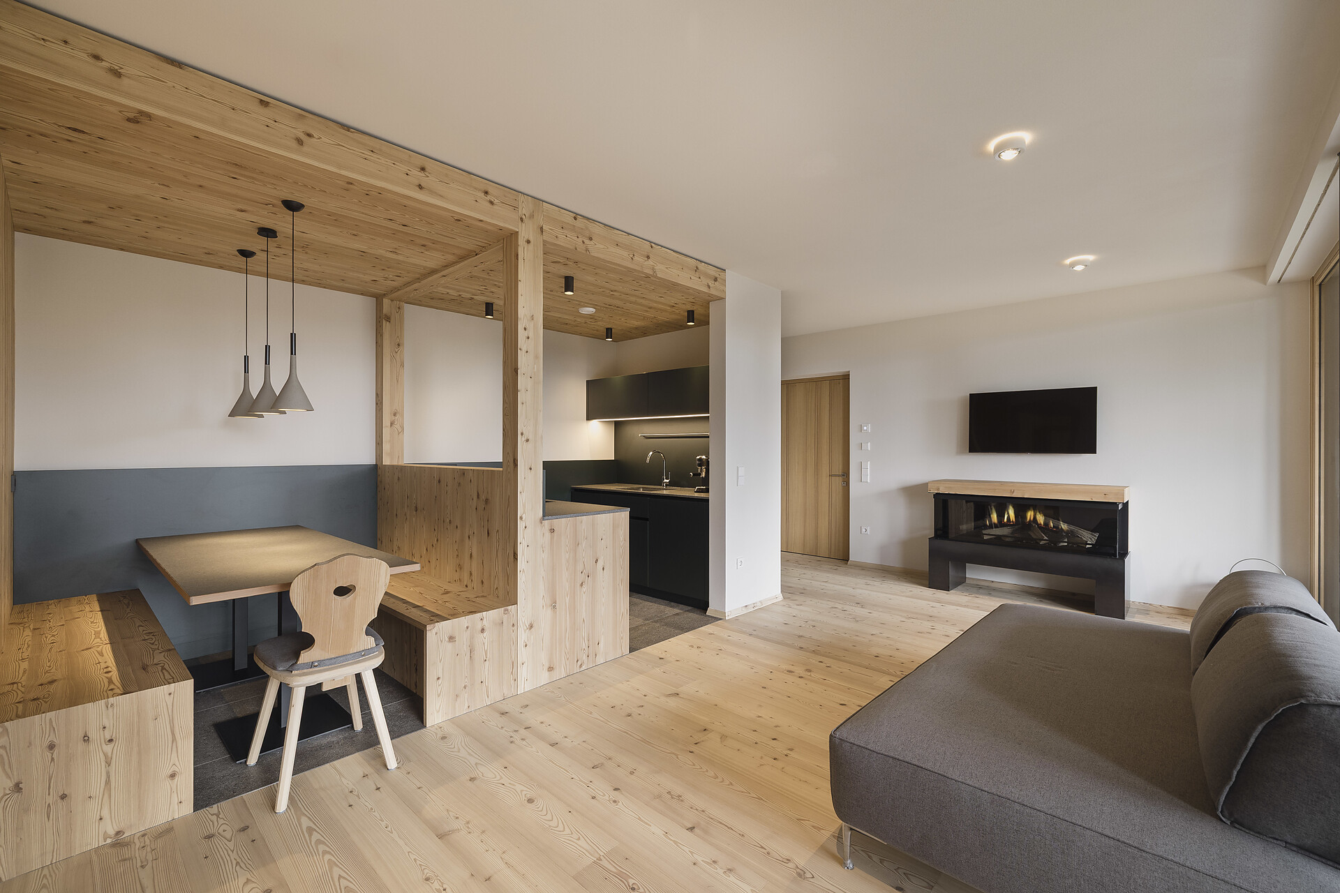 Inside you can expect an open living area with a warming fireplace and large windows with breathtaking views of the surrounding mountains and forests.