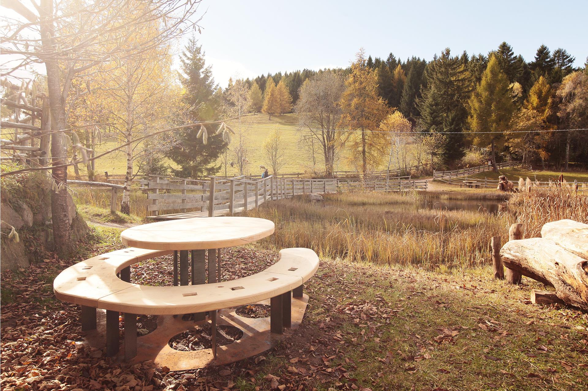 A particularly versatile rest area has been created at the Löschteich pond in Verano. You will find it if you walk past the Leadner Alm and continue on hiking trail 11. A bench with a table invites you to have a picnic, while balancing beams and a teepee provide opportunities for exercise and play – a welcome change, especially for families.