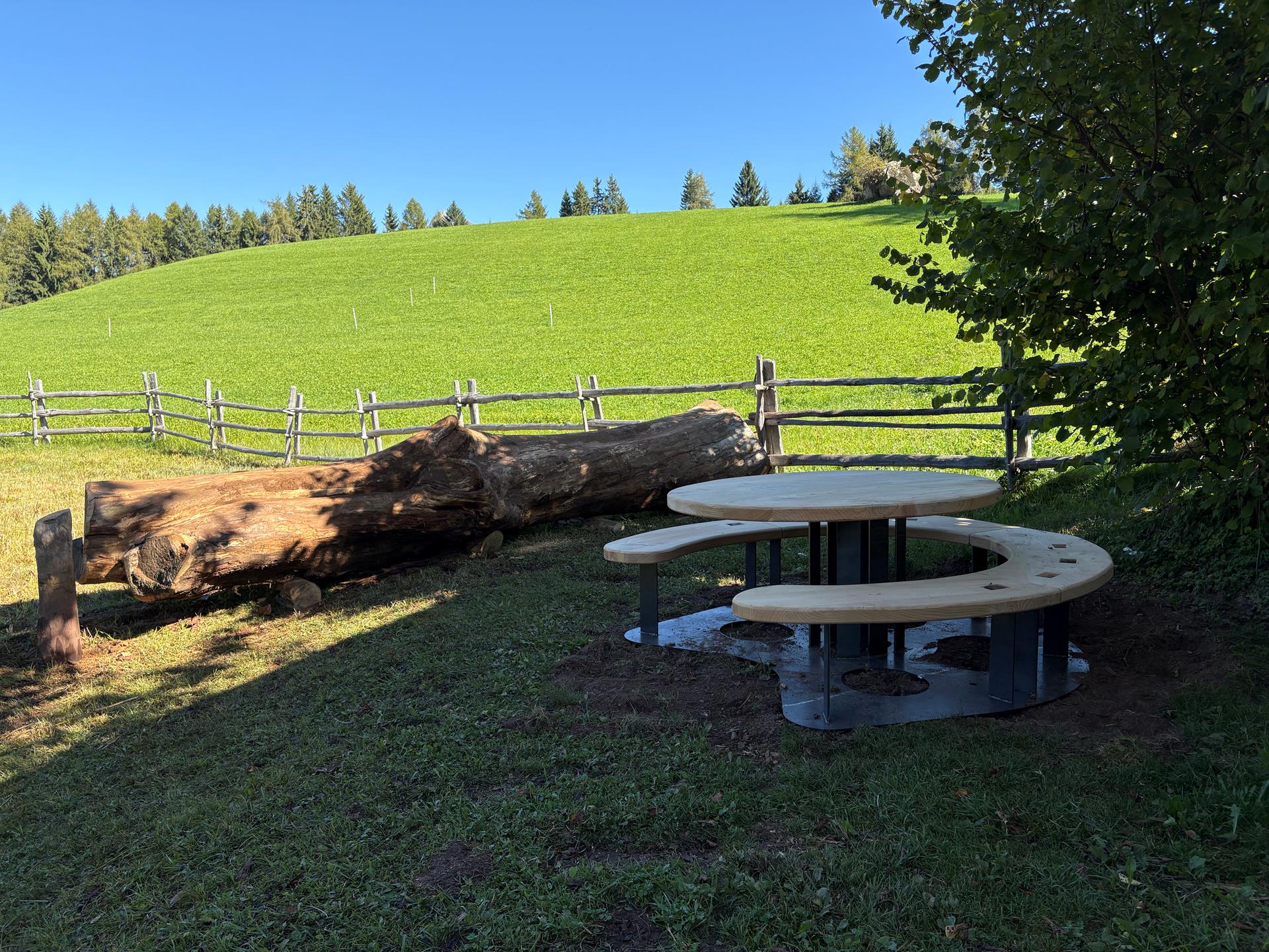 The new rest areas stand out thanks to their special design: seating with integrated tables in the shape of a horseshoe has been installed here. The horseshoe, a symbol of good luck and closely associated with Hafling and the Tschögglberg as the home of Haflinger horses, blends harmoniously into the surroundings. It not only represents local identity, but also makes the rest areas popular meeting places – places where tradition meets modern design.