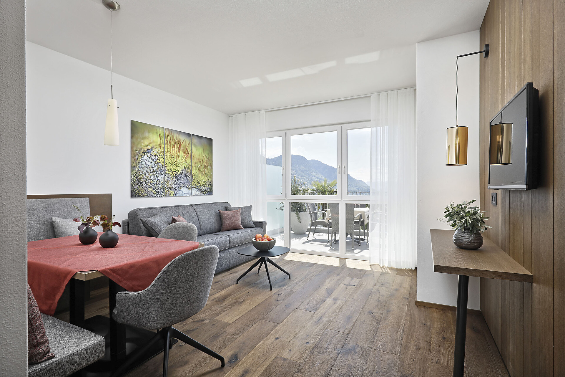 Equipment: Double bed , Sofa bed, Double sofa bed, Balcony, Terrace, Separate living area, Bed linen provided, Safe, Eat-in kitchen, Coffee machine, Electric cooker, Cutlery provided, Water boiler, Shower/Bath tub, Separate WC, Hair dryer, Towels, TV, Satellite/Cable, WLAN, Internet access, Cleaning upon request, Hotel annex, Panoramic view, South view