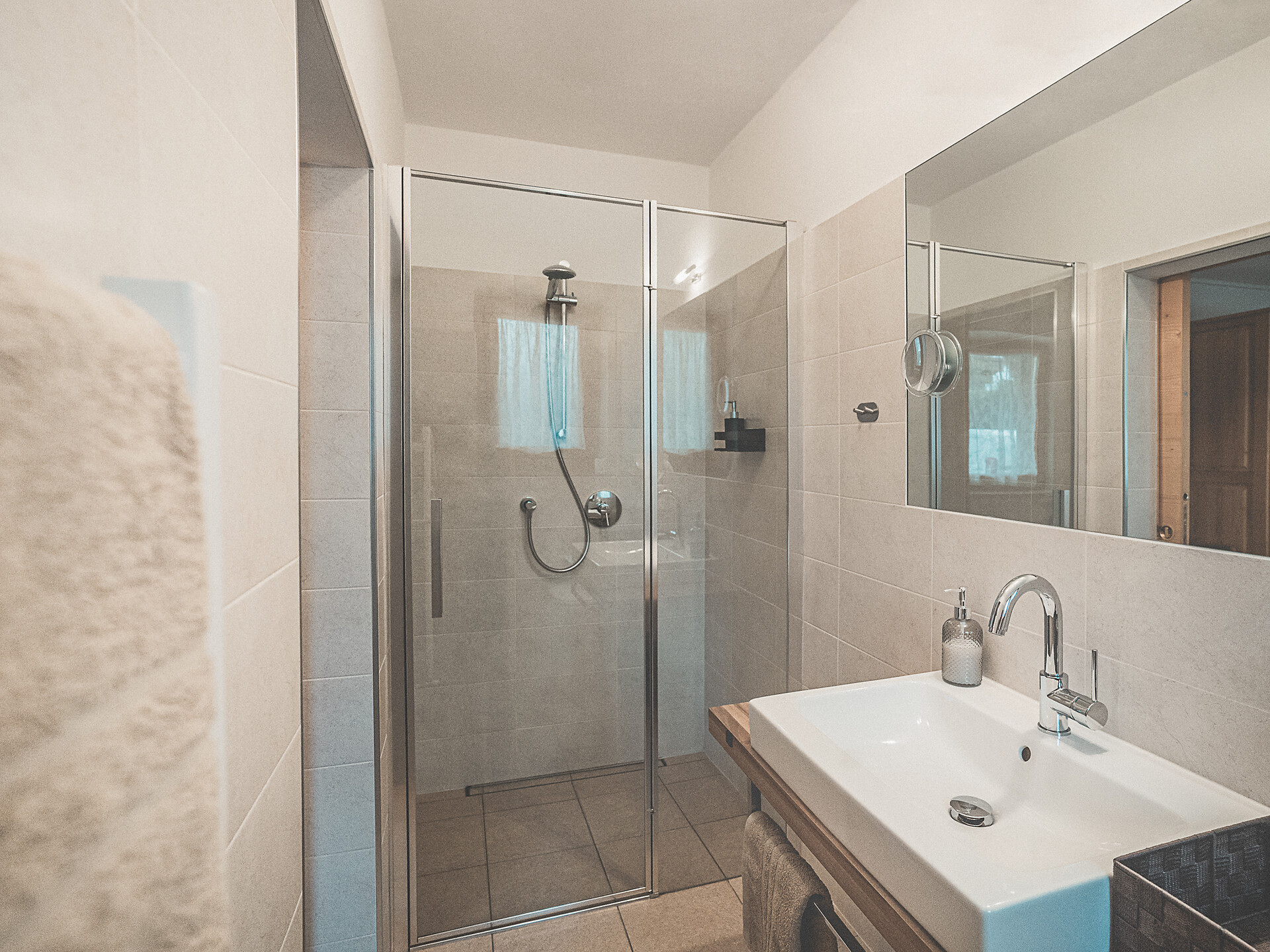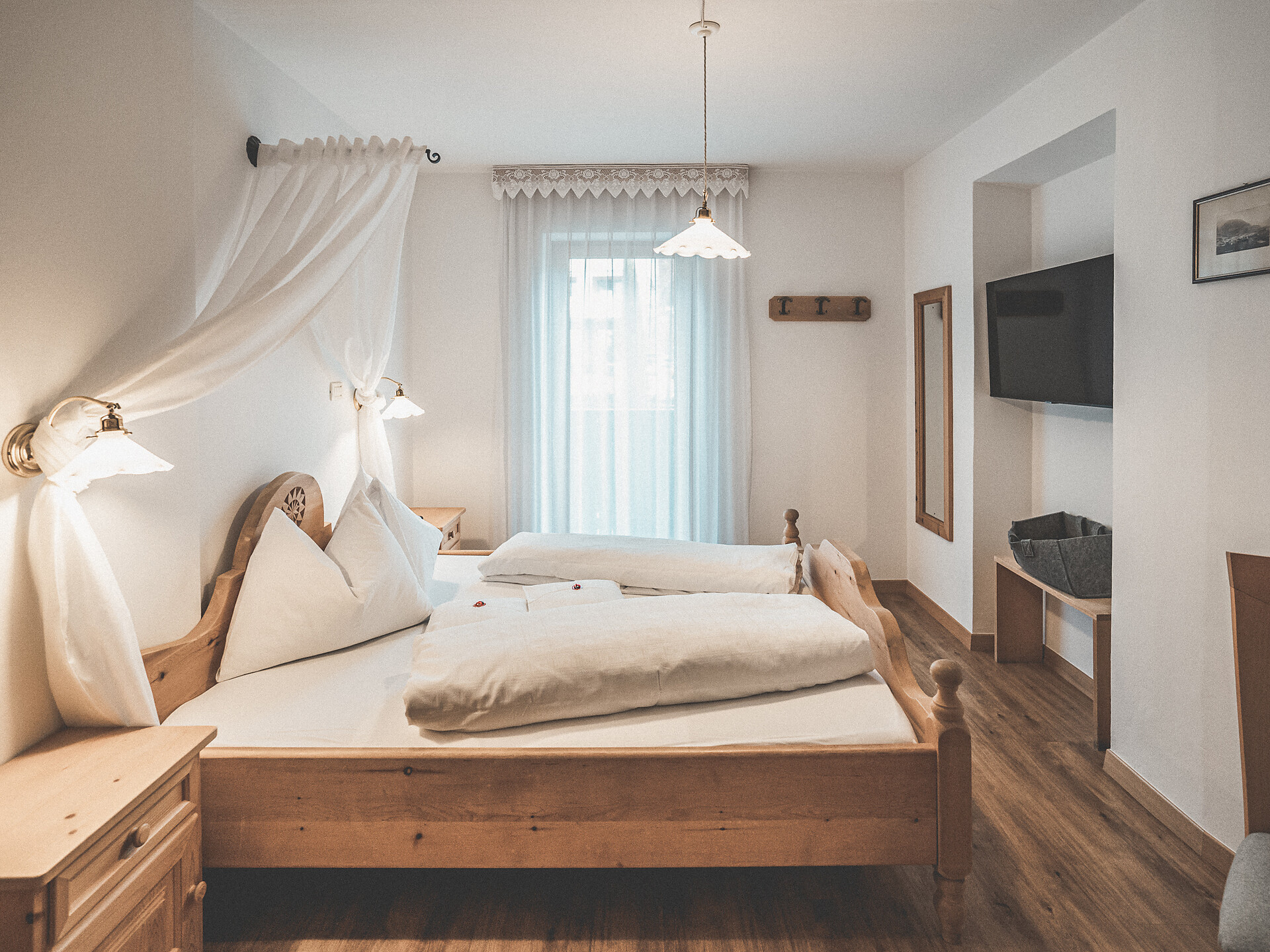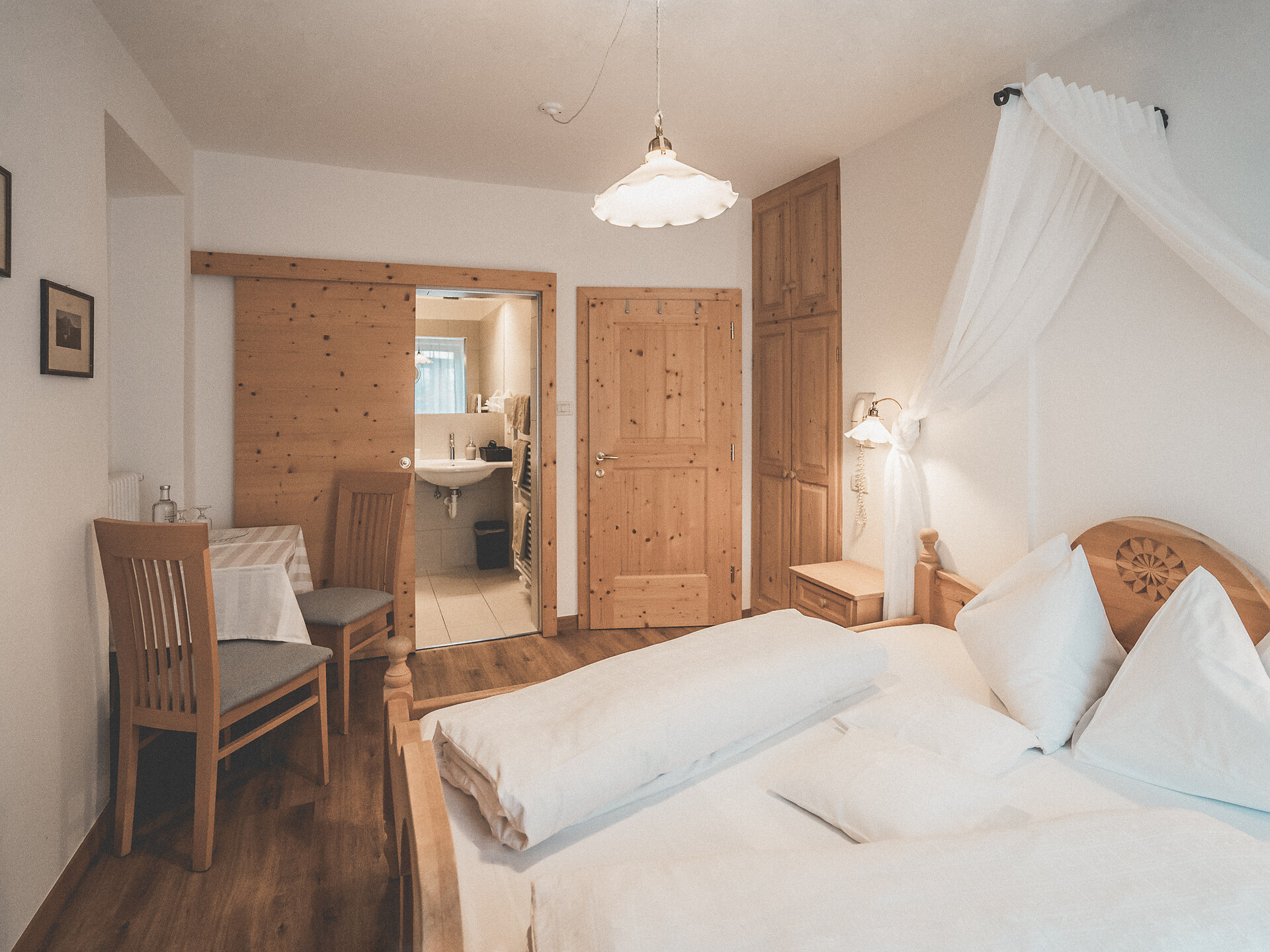 New, furnished with sleep-promoting Swiss pine, balcony, which overlooks directly onto our garden and mountains. LCD satellite TV , radio, phone and safe. Bathroom with shower and hairdryer.