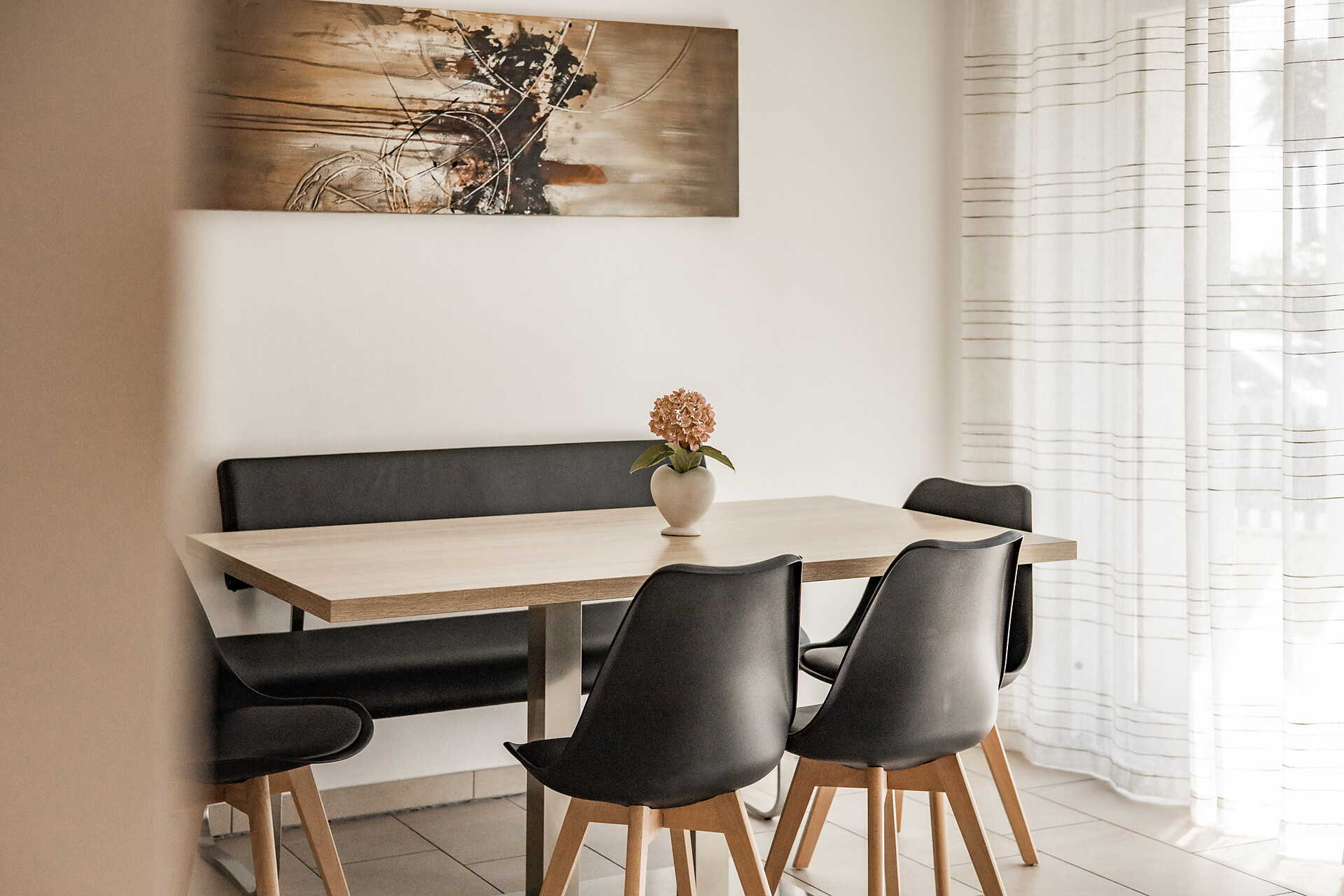 Das Apartment mit etwa 45 m² für 2- 4 Personen (plus Kinderbett) befindet sich im 1. Stock und besteht aus einem Schlafzimmer, großem Bad, geräumiger Wohnküche mit Schlafcouch und einem gemütlichen Balkon.