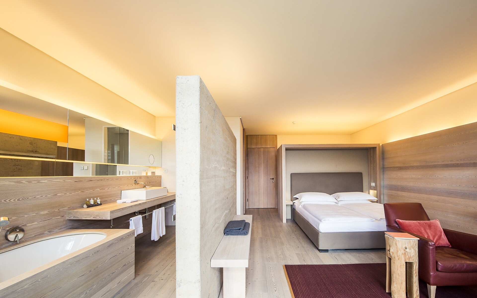 36 m² with a balcony and a stunning view over the South Tyrolean mountains. A natural clay wall separates the bathroom with panoramic view from the sleeping area. Separate toilet, hair dryer, cosmetic products from South Tyrol, bathrobes and bath slippers, phone, a hifi stereo with iPod port, free WiFi Internet access, mini bar, safe. All deluxe rooms are non-smoking rooms and can be booked with a connecting door on request.