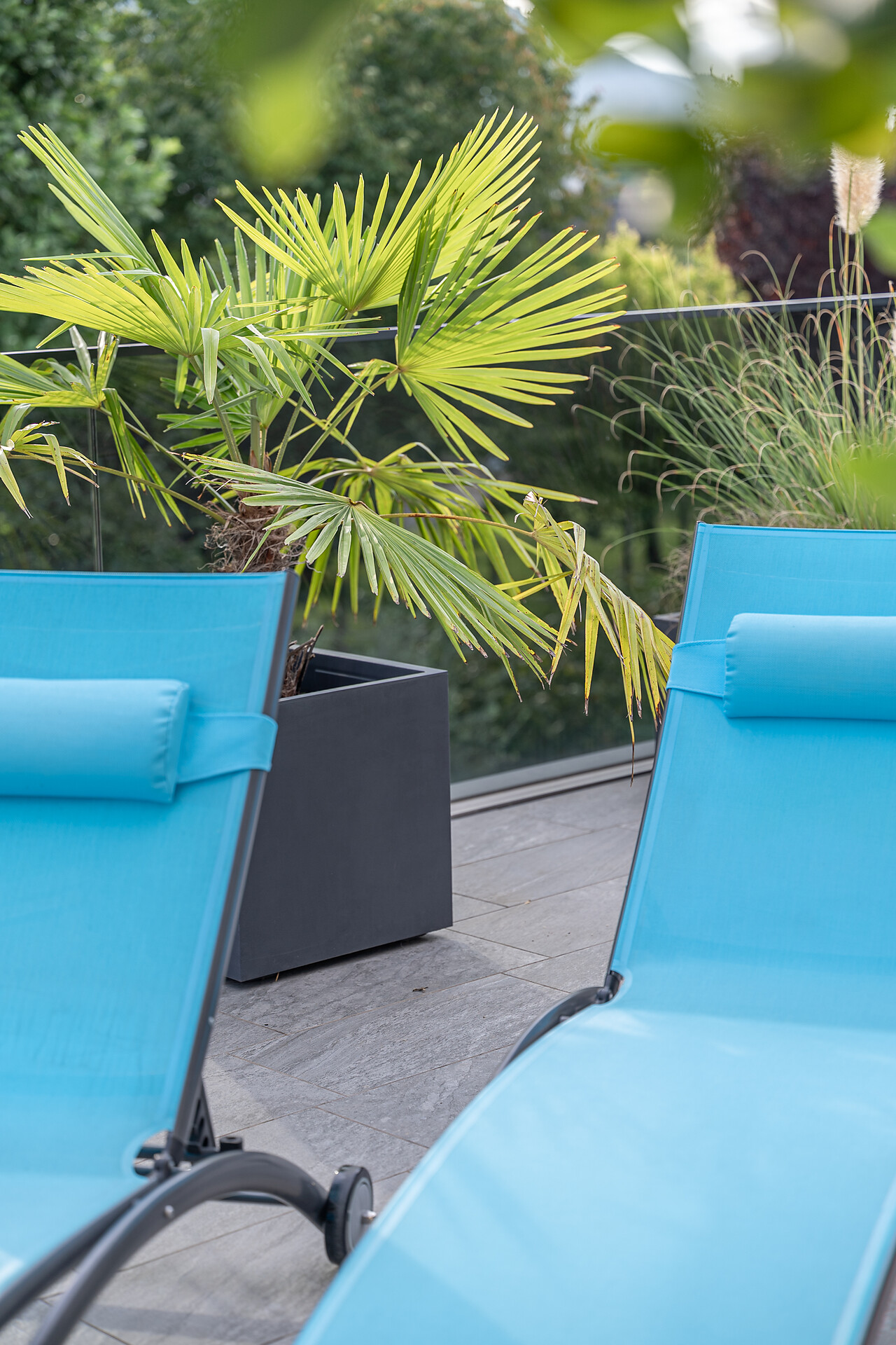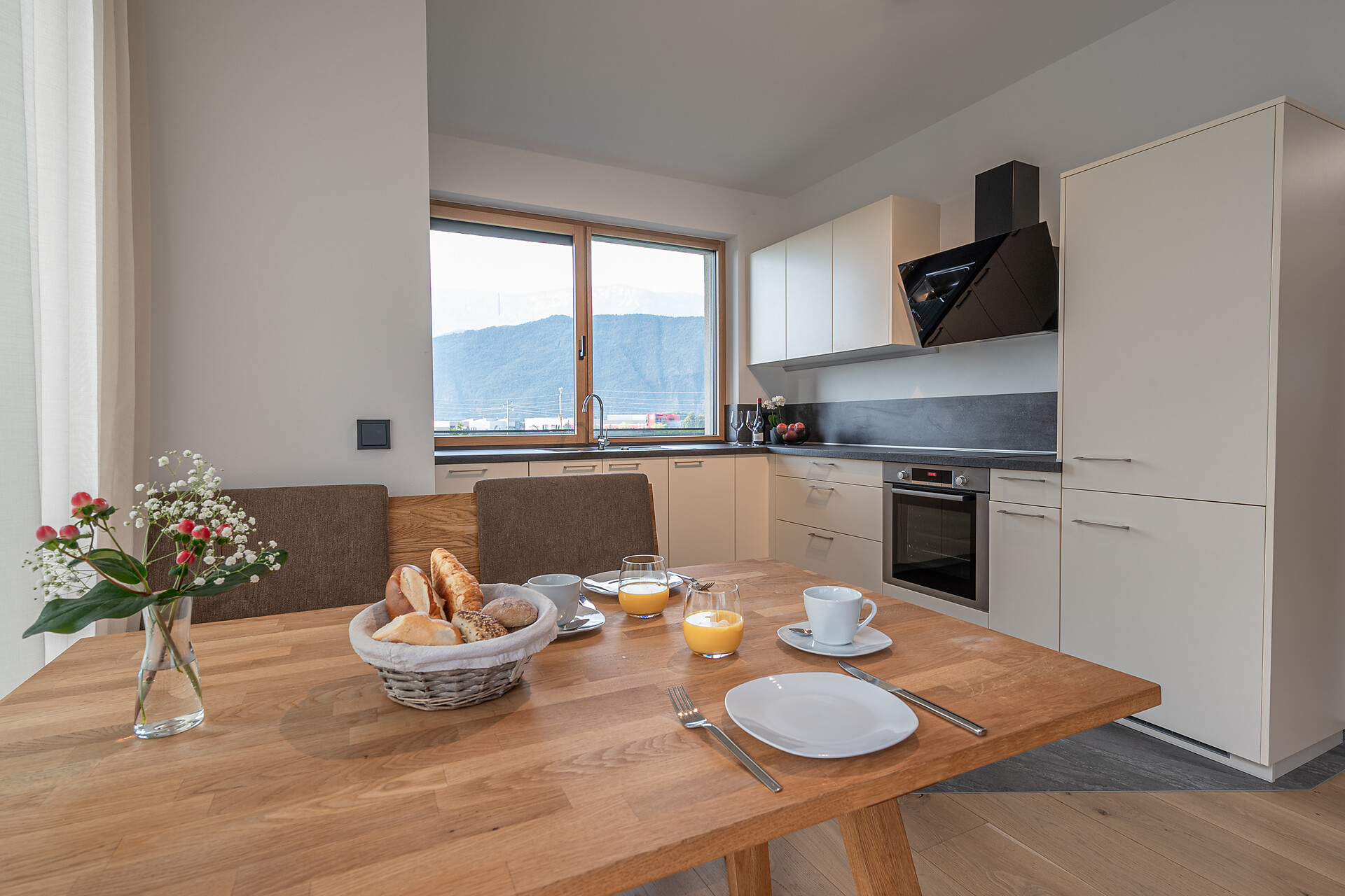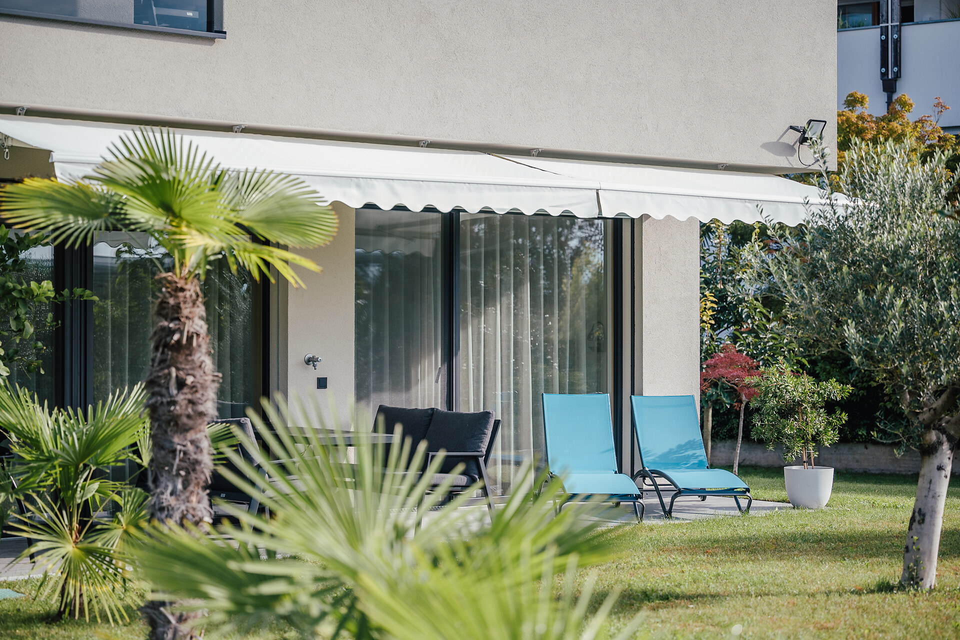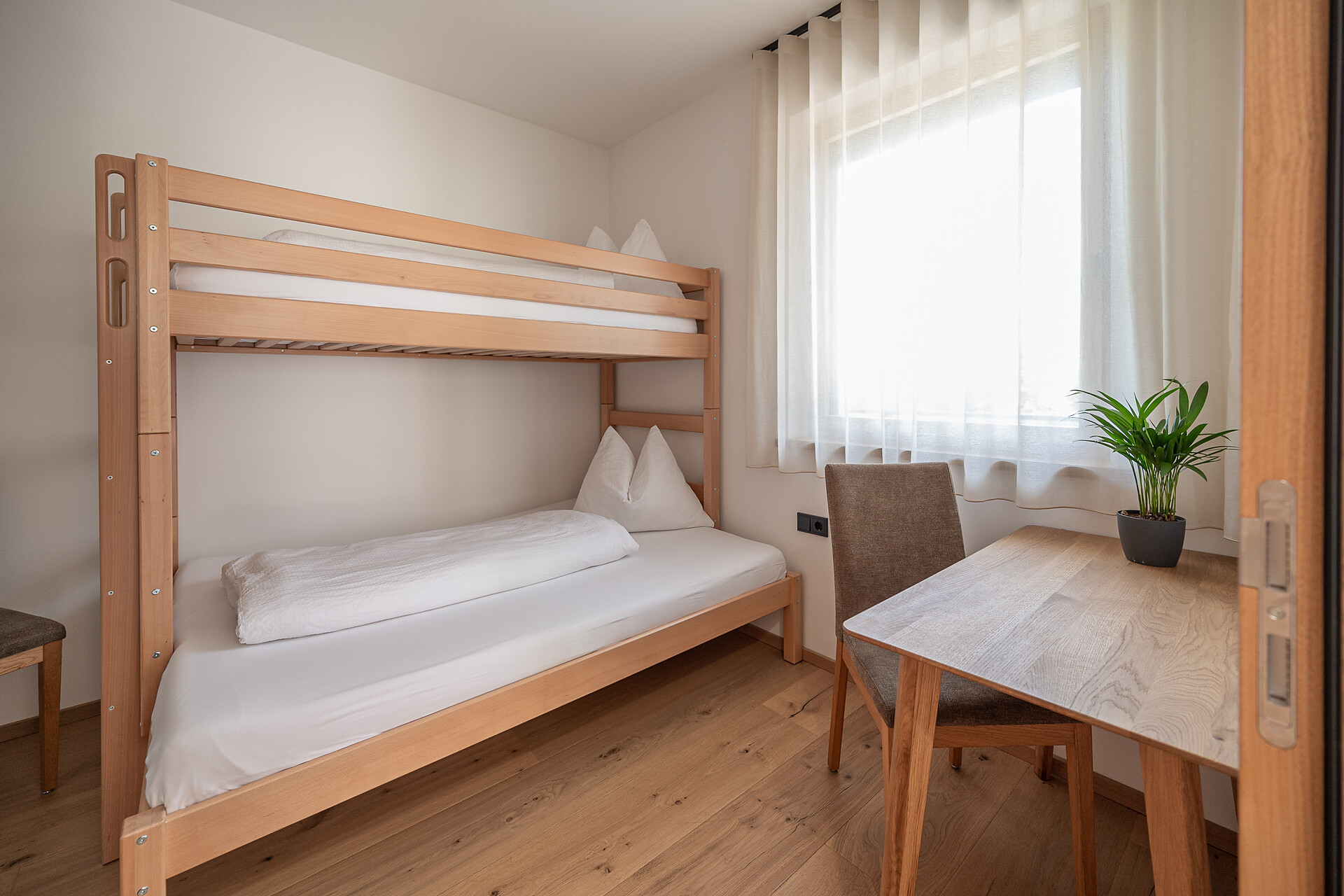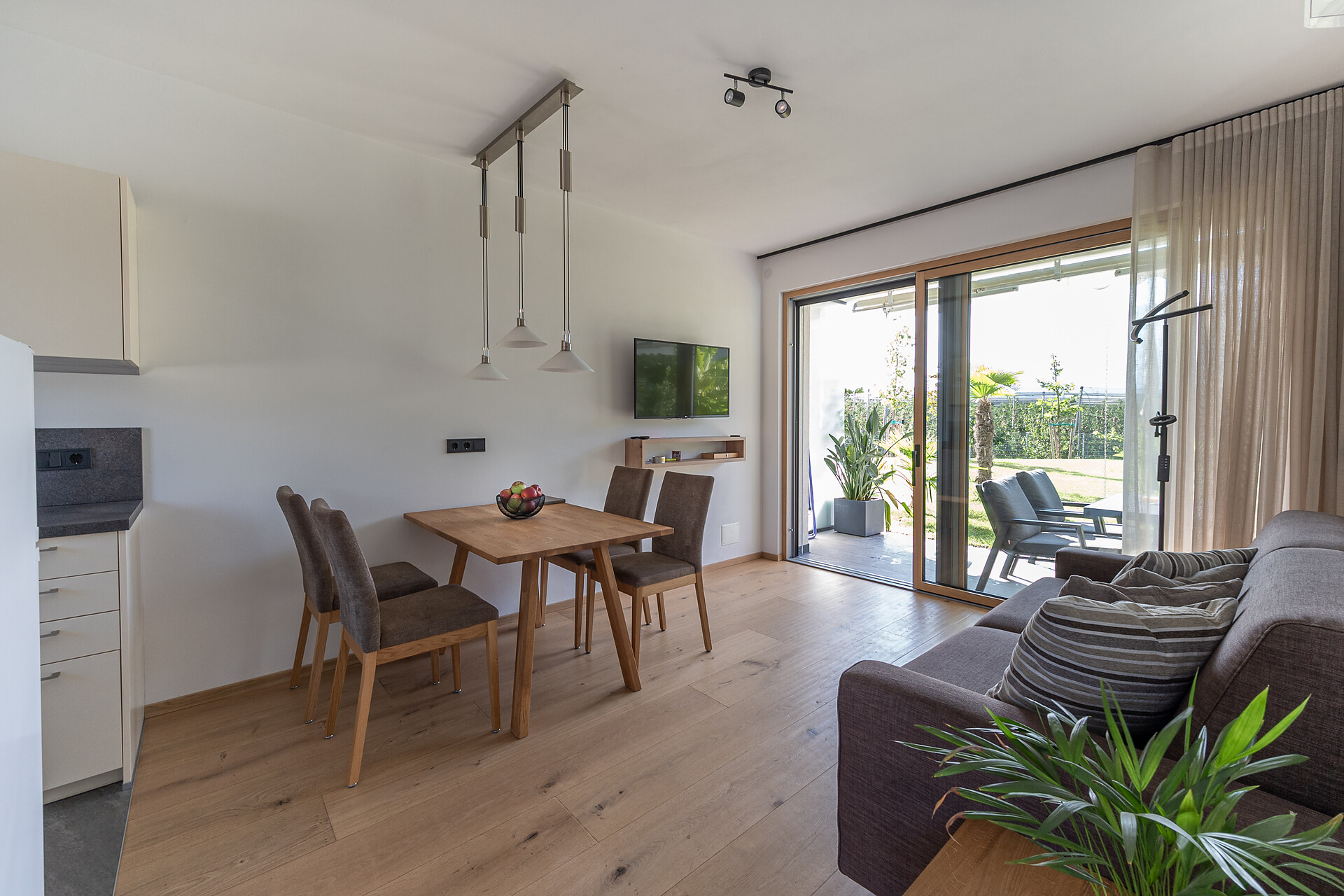The spacious, light-filled, south-facing 65 m² ‘Südblick’ apartment is located on the first floor and can accommodate 2-6 people. It features a double bedroom with a premium mattress, a room with a family bunk bed (90x200 cm upper bed and 140x200 cm lower bed), and a modern bathroom with a shower, WC, bidet, hairdryer, and stylish bathroom furnishings. In the bright, open-plan living area, there is a cozy sofa (which can also be used as a sofa bed for 2 people with a high-quality mattress), a comfortable dining table with a bench, and a flat-screen satellite TV. The kitchen is fully equipped with a dishwasher, oven, kettle, Italian moka pot, crockery, cookware, and various cooking utensils. On the 55 m² partially covered terrace, modern garden furniture, loungers, and a garden lounge are available. Air conditioning and underfloor heating ensure a pleasant indoor climate. You are welcome to park your car in the garage, where lockable storage space for bicycles is also provided.