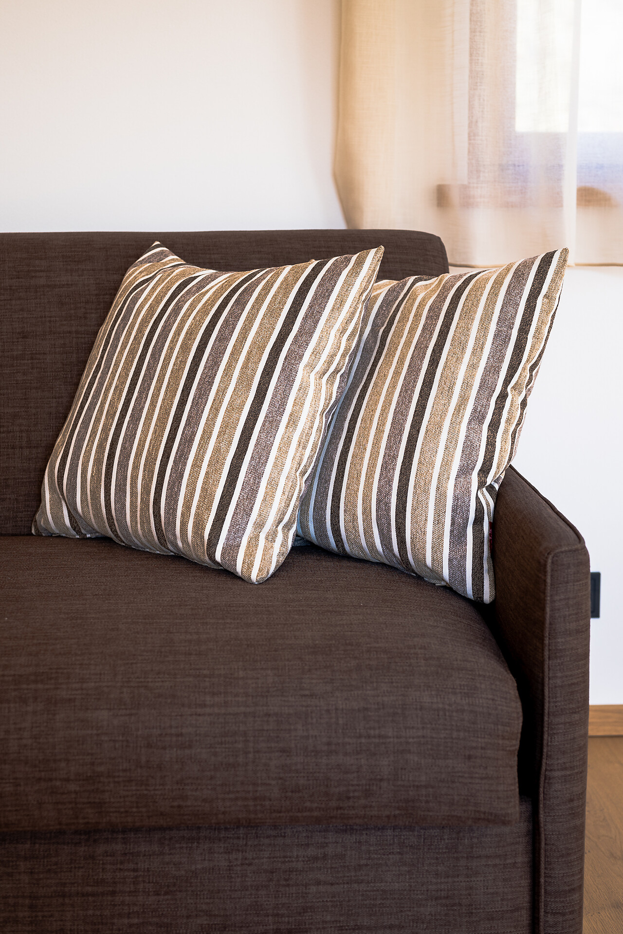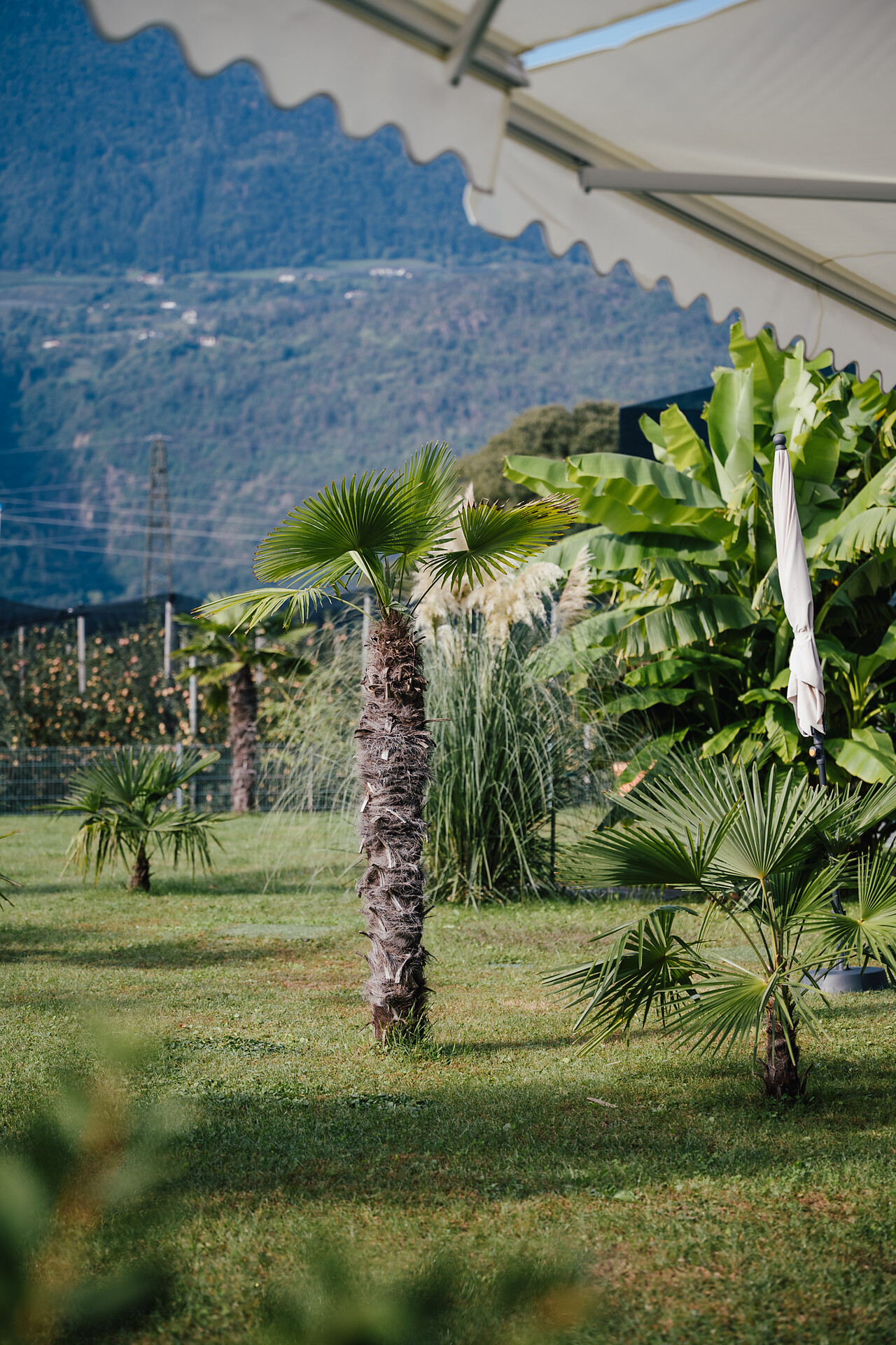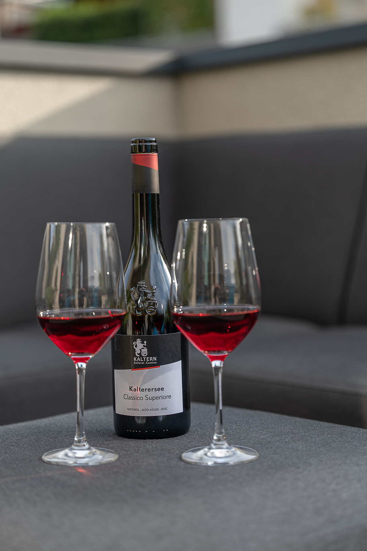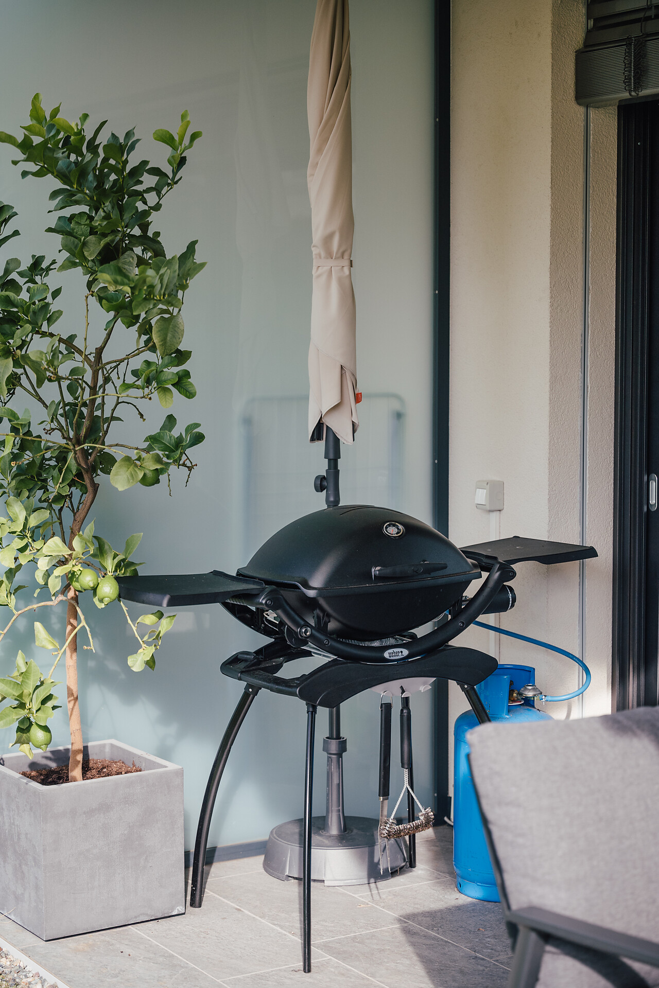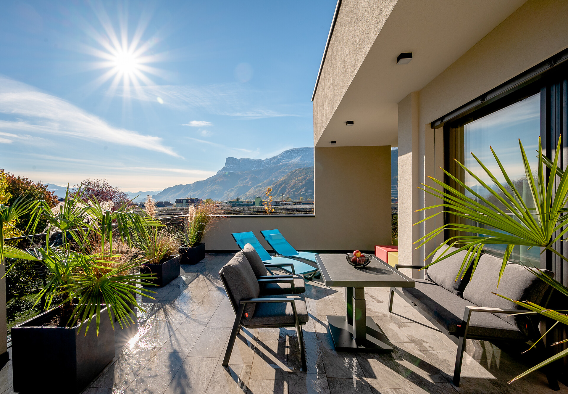 The spacious, light-filled, south-facing 65 m² ‘Südblick’ apartment is located on the first floor and can accommodate 2-6 people. It features a double bedroom with a premium mattress, a room with a family bunk bed (90x200 cm upper bed and 140x200 cm lower bed), and a modern bathroom with a shower, WC, bidet, hairdryer, and stylish bathroom furnishings. In the bright, open-plan living area, there is a cozy sofa (which can also be used as a sofa bed for 2 people with a high-quality mattress), a comfortable dining table with a bench, and a flat-screen satellite TV. The kitchen is fully equipped with a dishwasher, oven, kettle, Italian moka pot, crockery, cookware, and various cooking utensils. On the 55 m² partially covered terrace, modern garden furniture, loungers, and a garden lounge are available. Air conditioning and underfloor heating ensure a pleasant indoor climate. You are welcome to park your car in the garage, where lockable storage space for bicycles is also provided.