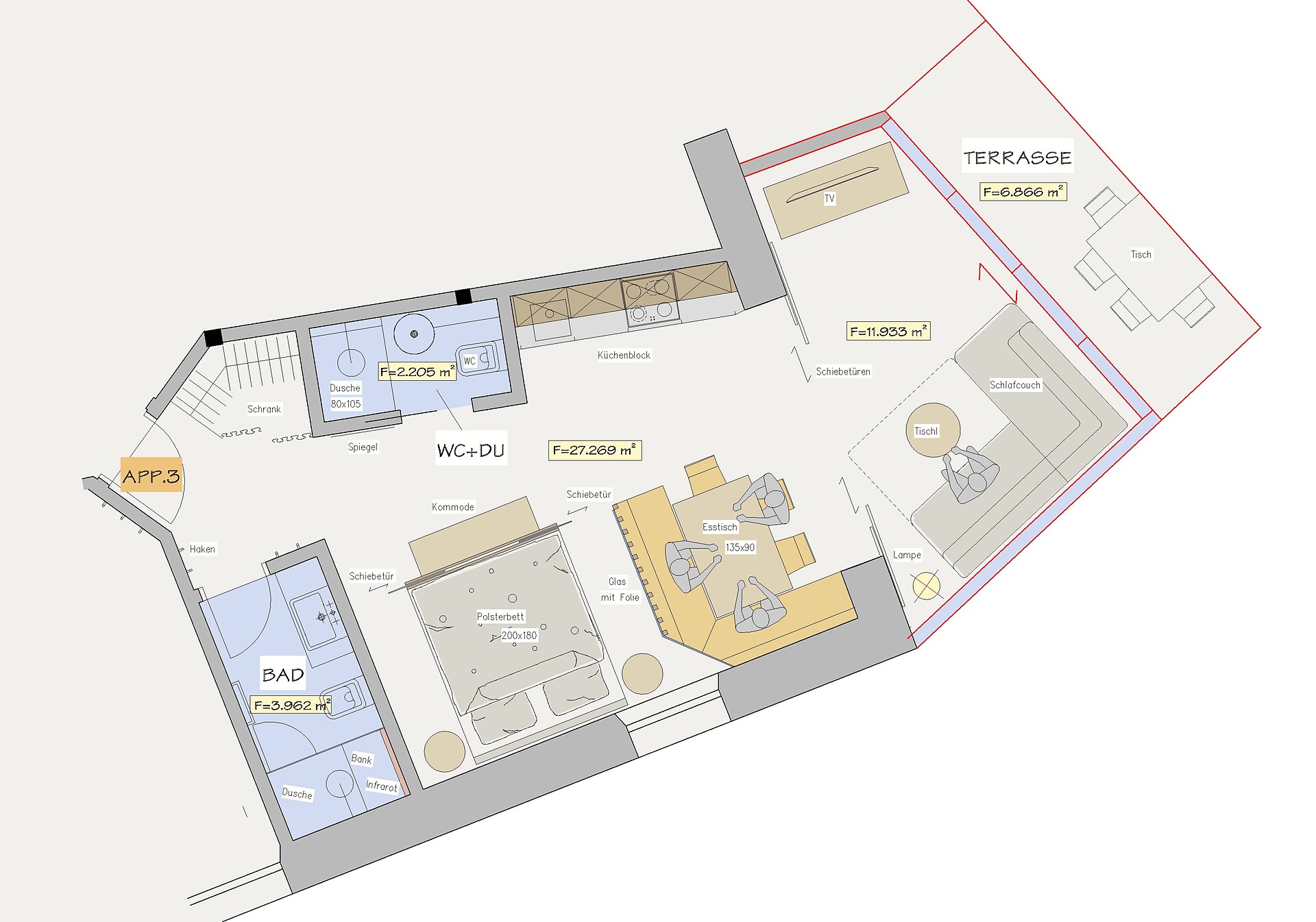 The apartment is completed by two bathrooms, each equipped with a shower, washbasin and toilet. In the main bathroom, you will also find a shower with soothing infrared warmth – perfect for relaxing after an eventful day.
