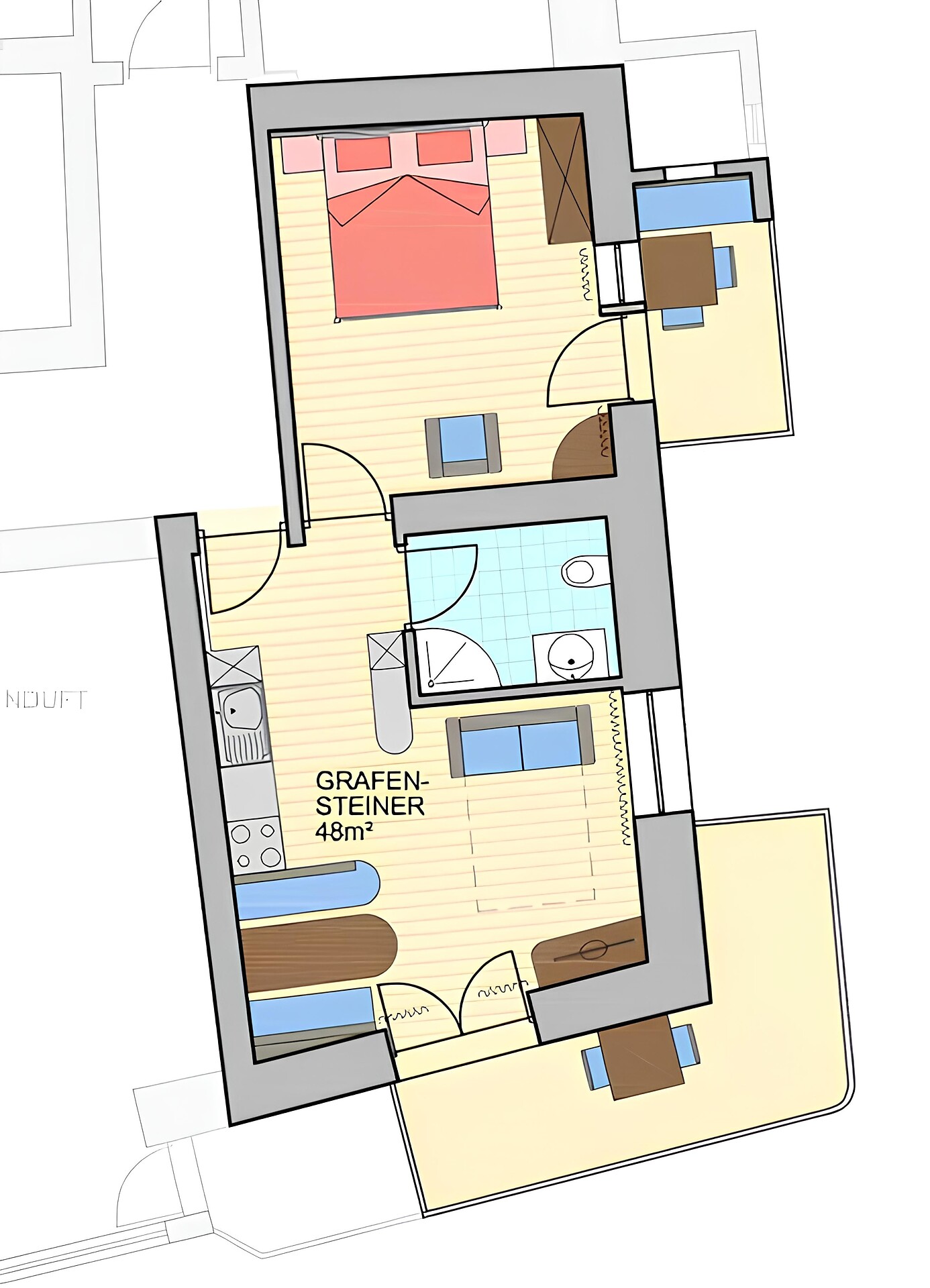 Double room, Double bed , Balcony, Air conditioning, Living area, Kitchenette, Tea/Coffee machine, Shower / Bath tub, Hair dryer, TV, Satellite/Cable, WLAN, Main building, South view
