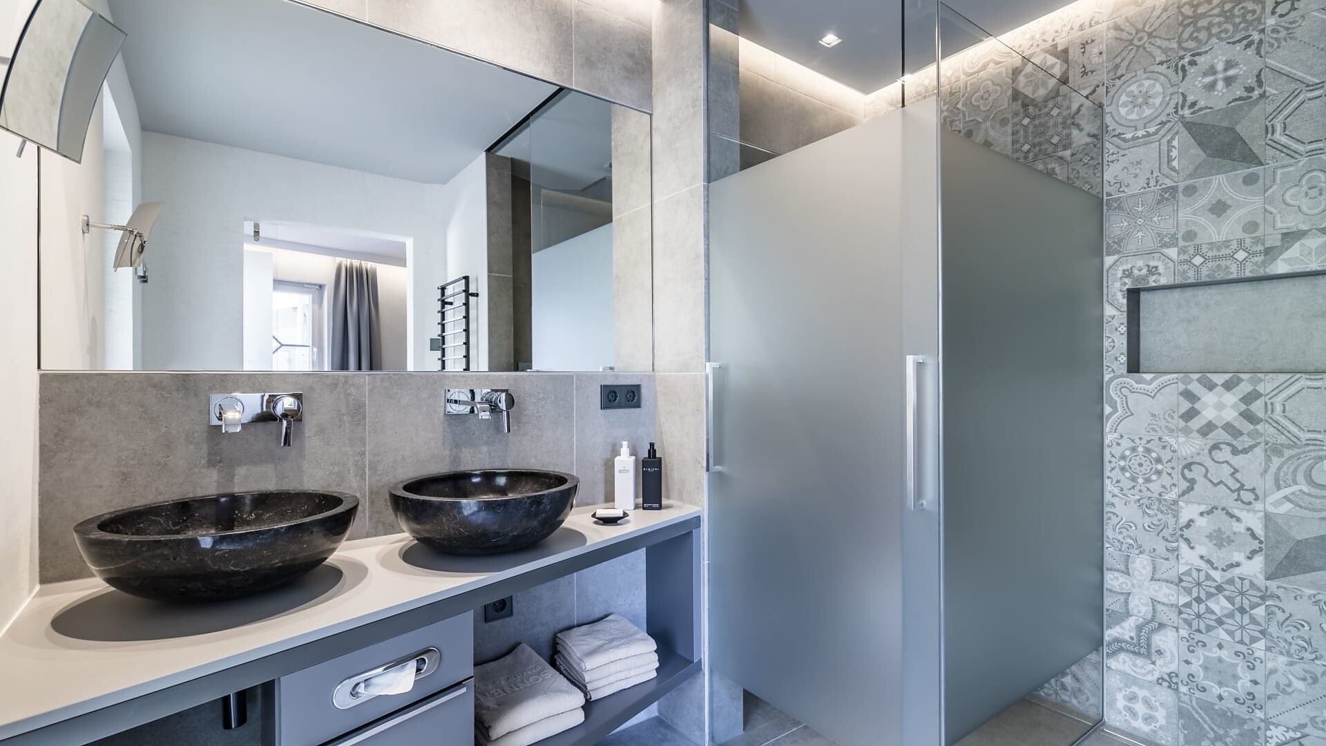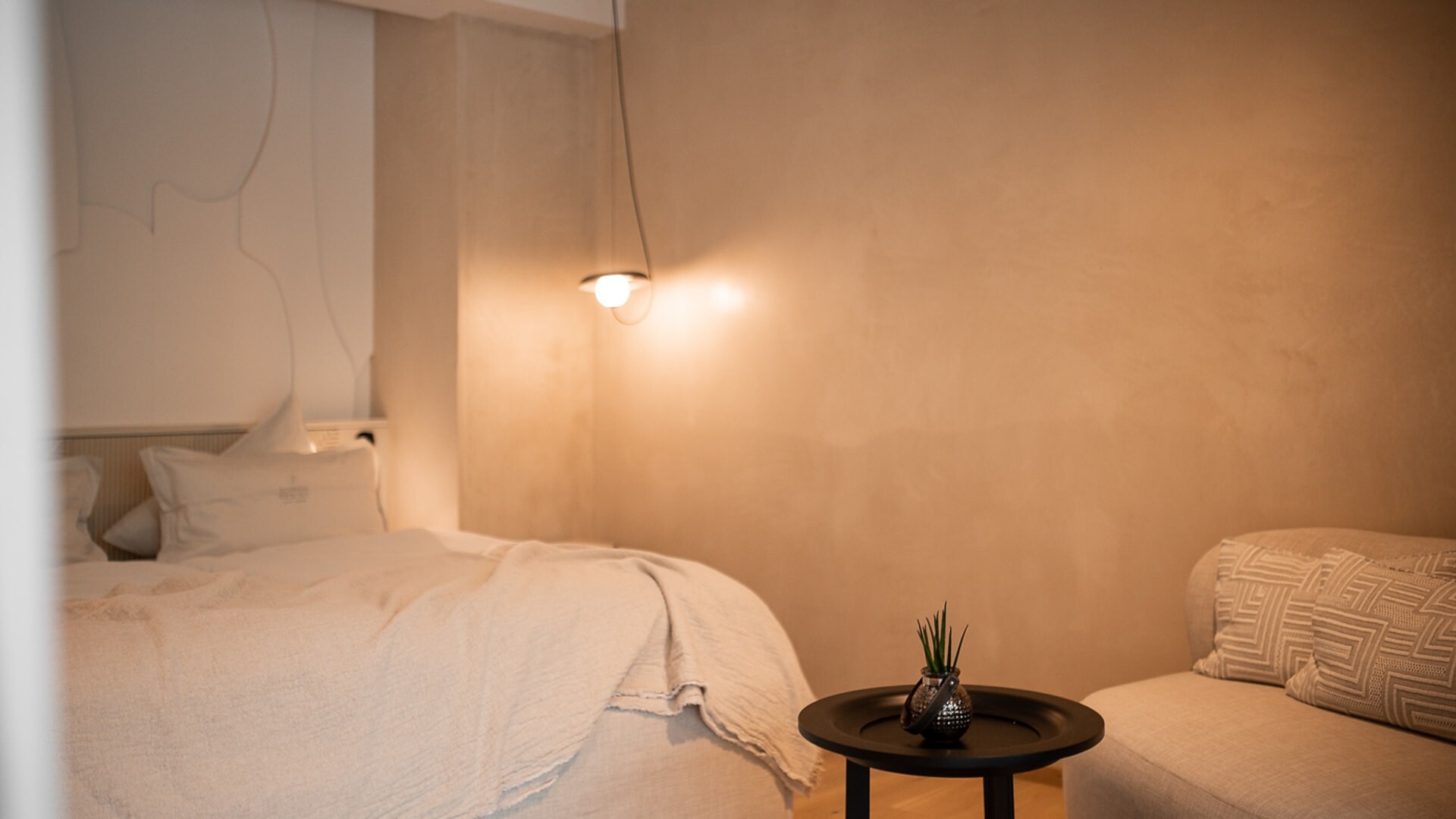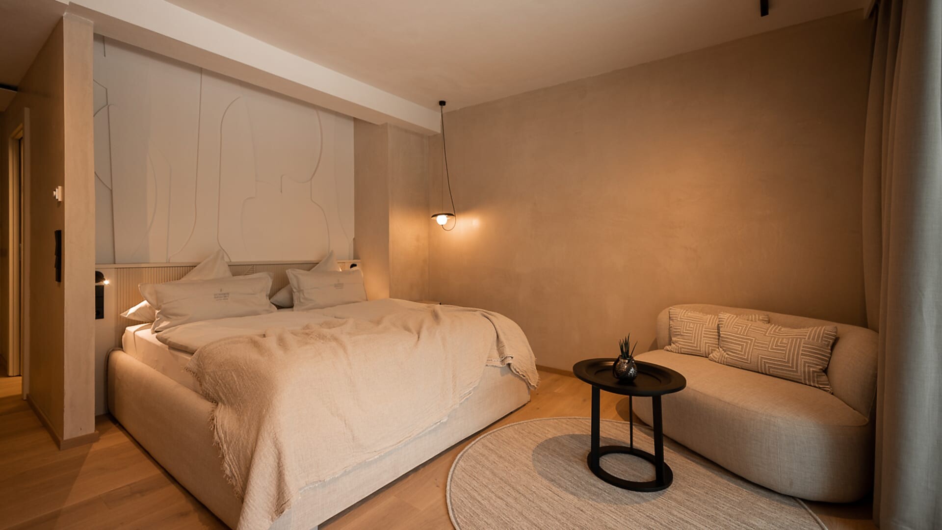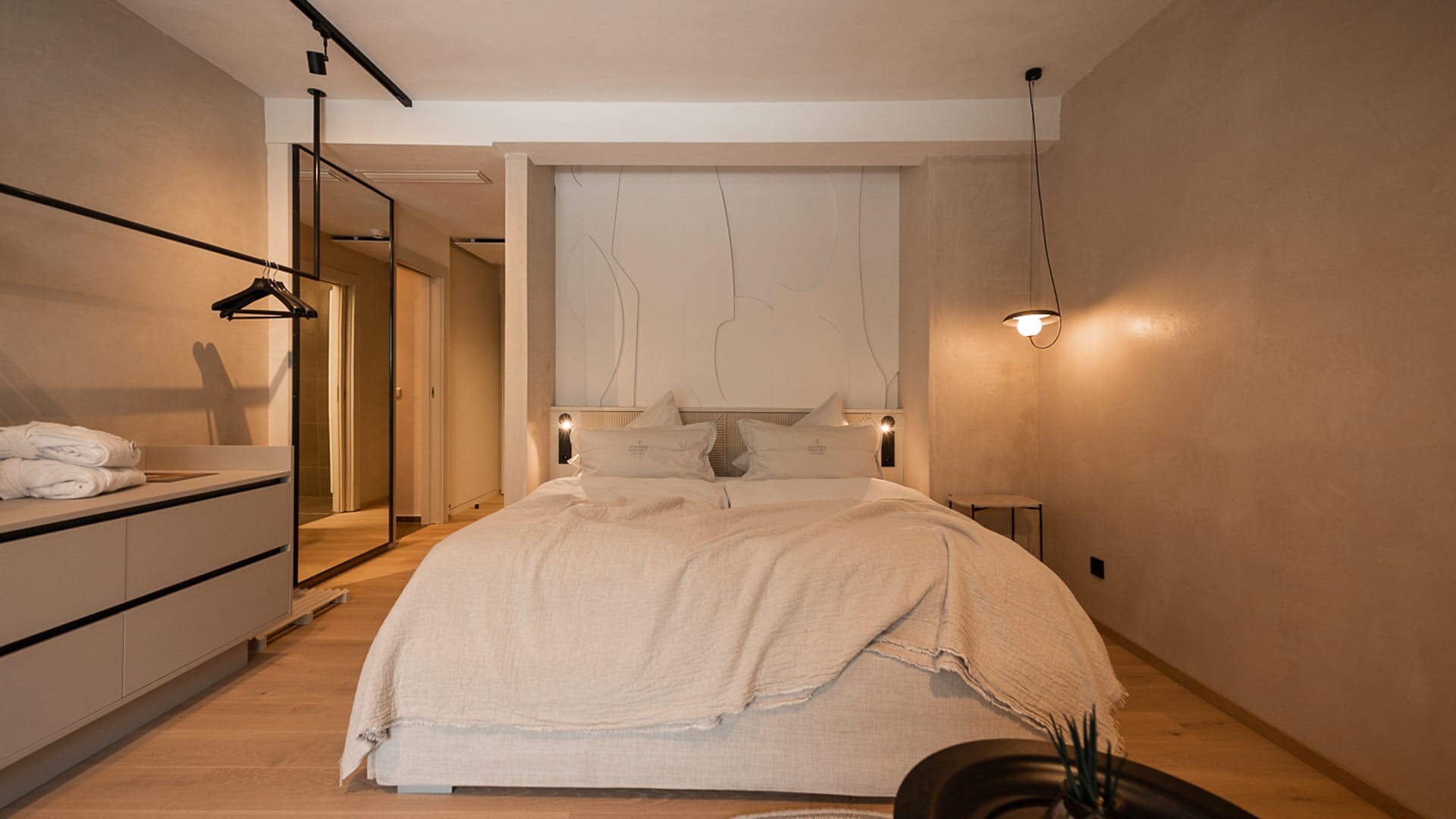double bedroom separated from the living area with chill lounge by a sliding door, parquet flooring, elegant bathroom with walk-in shower/WC, balcony, air conditioning, flat-screen TV, telephone, free Wi-Fi, safe and minibar, including underground parking