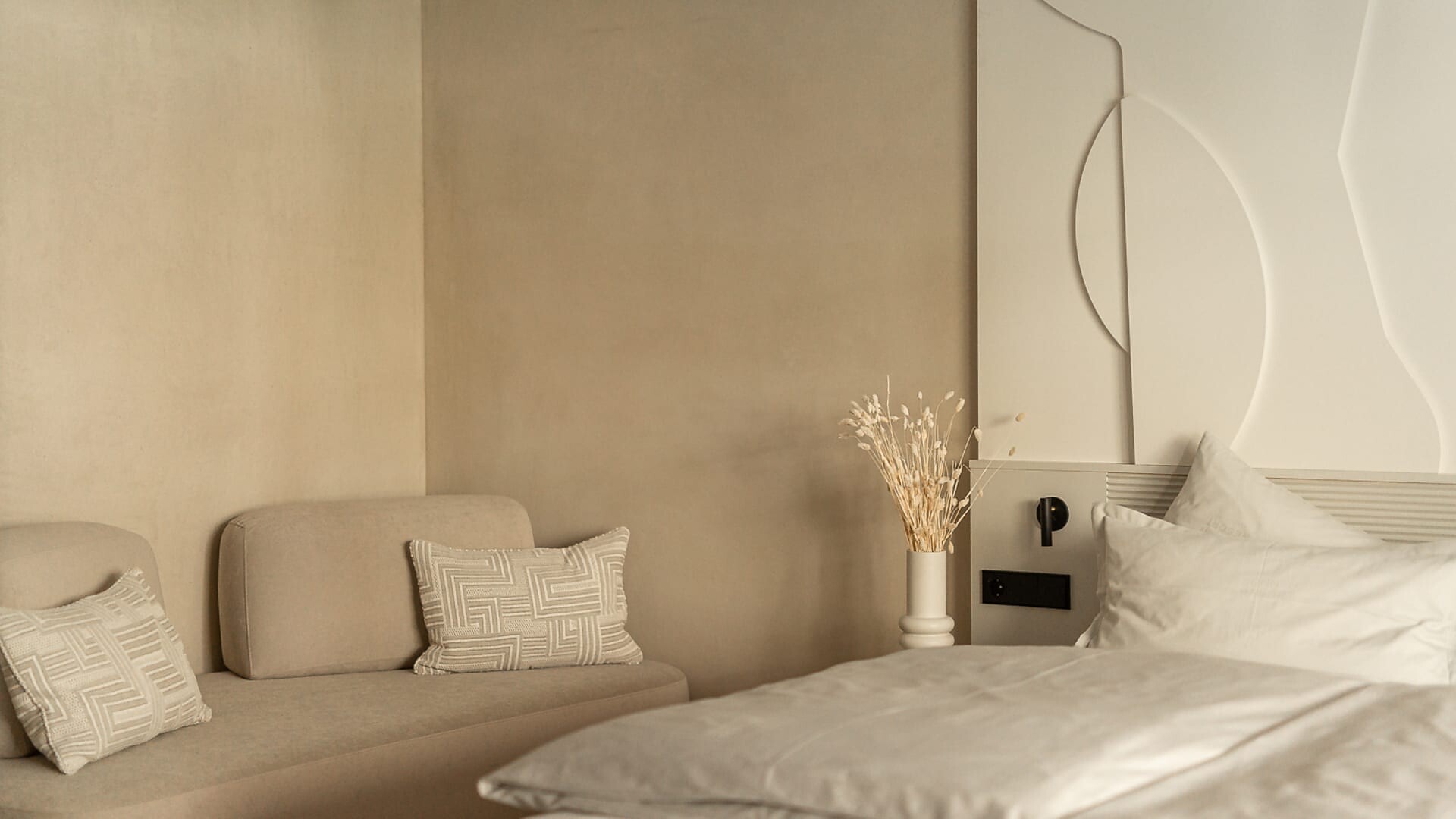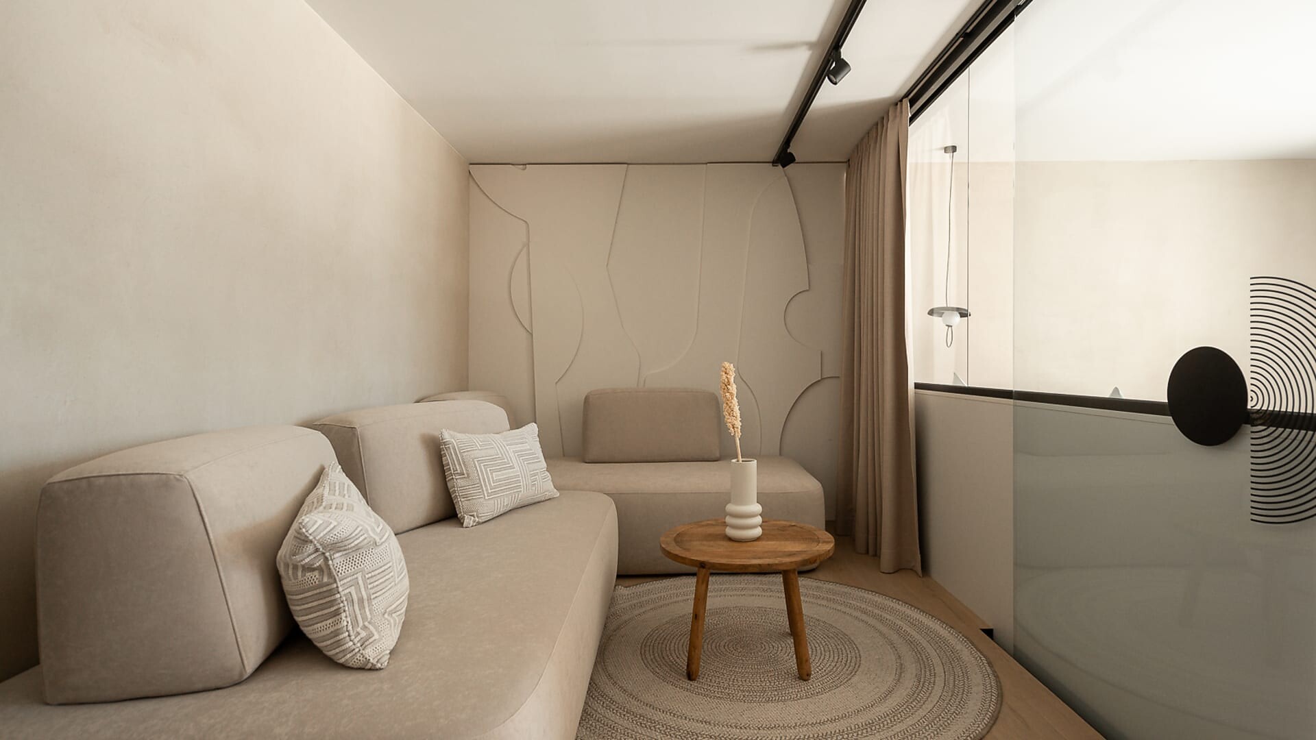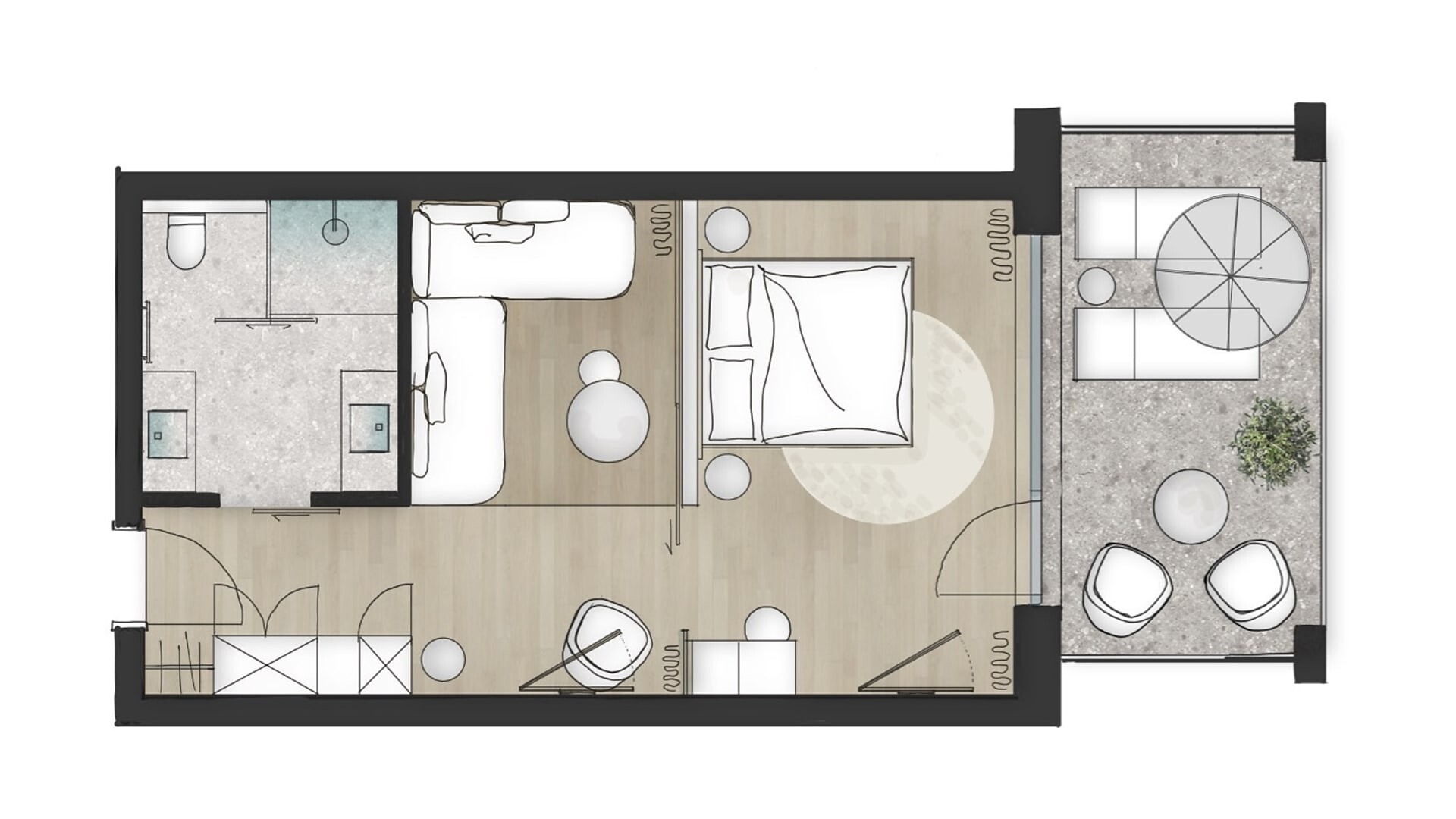 double bedroom separated from the living area with chill lounge by a sliding door, parquet flooring, elegant bathroom with walk-in shower/WC, balcony, air conditioning, flat-screen TV, telephone, free Wi-Fi, safe and minibar, including underground parking