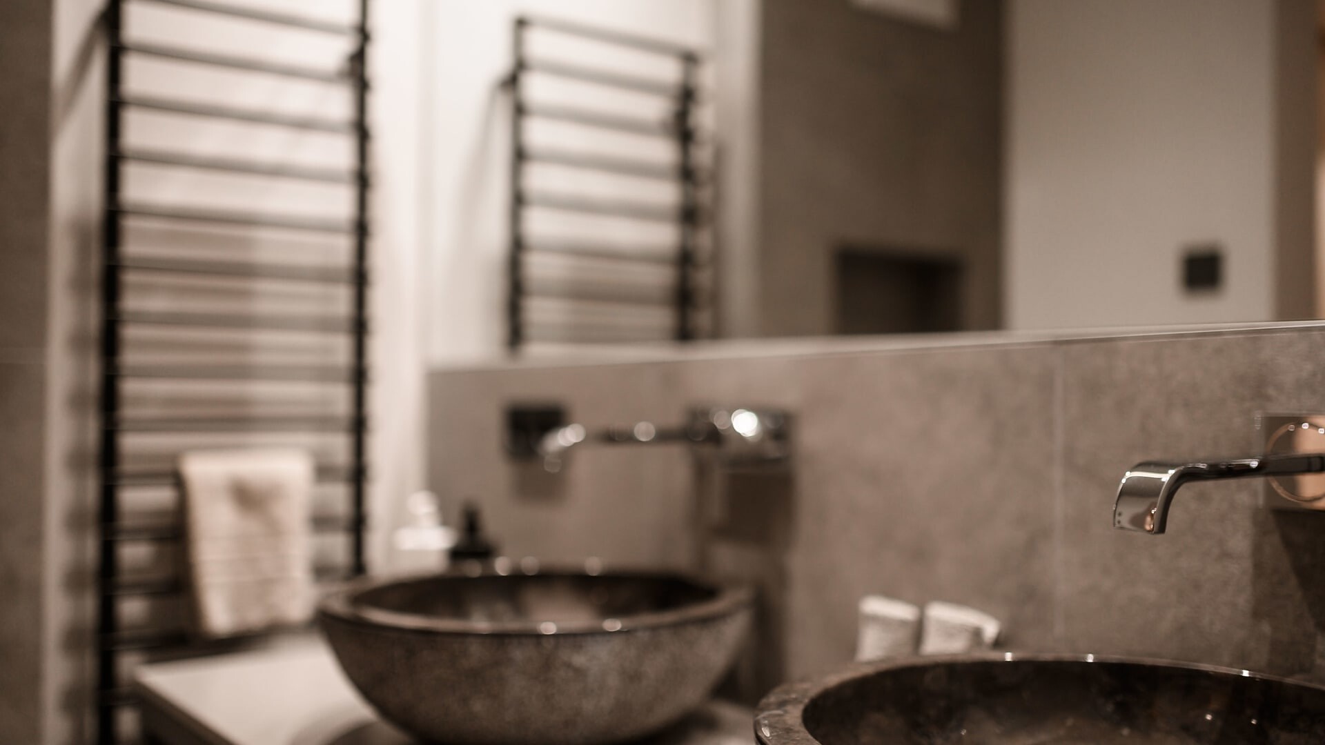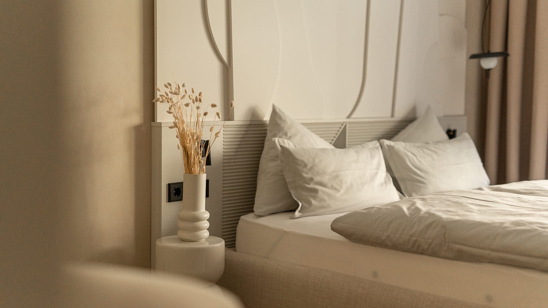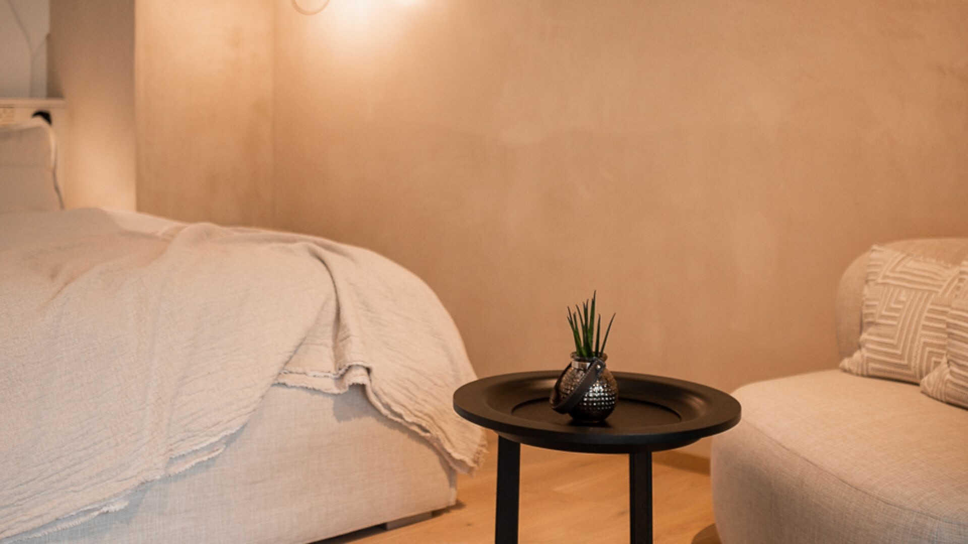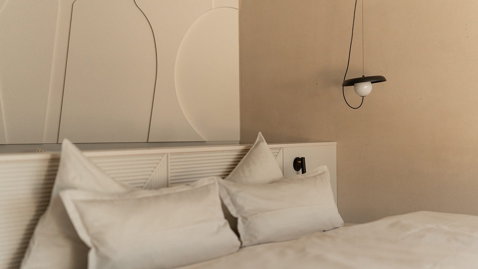 double bedroom separated from the living area with chill lounge by a sliding door, parquet flooring, elegant bathroom with walk-in shower/WC, balcony, air conditioning, flat-screen TV, telephone, free Wi-Fi, safe and minibar, including underground parking