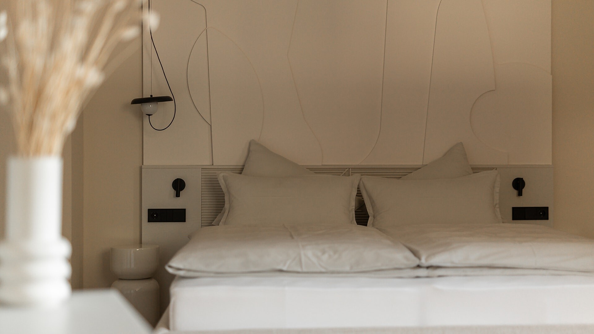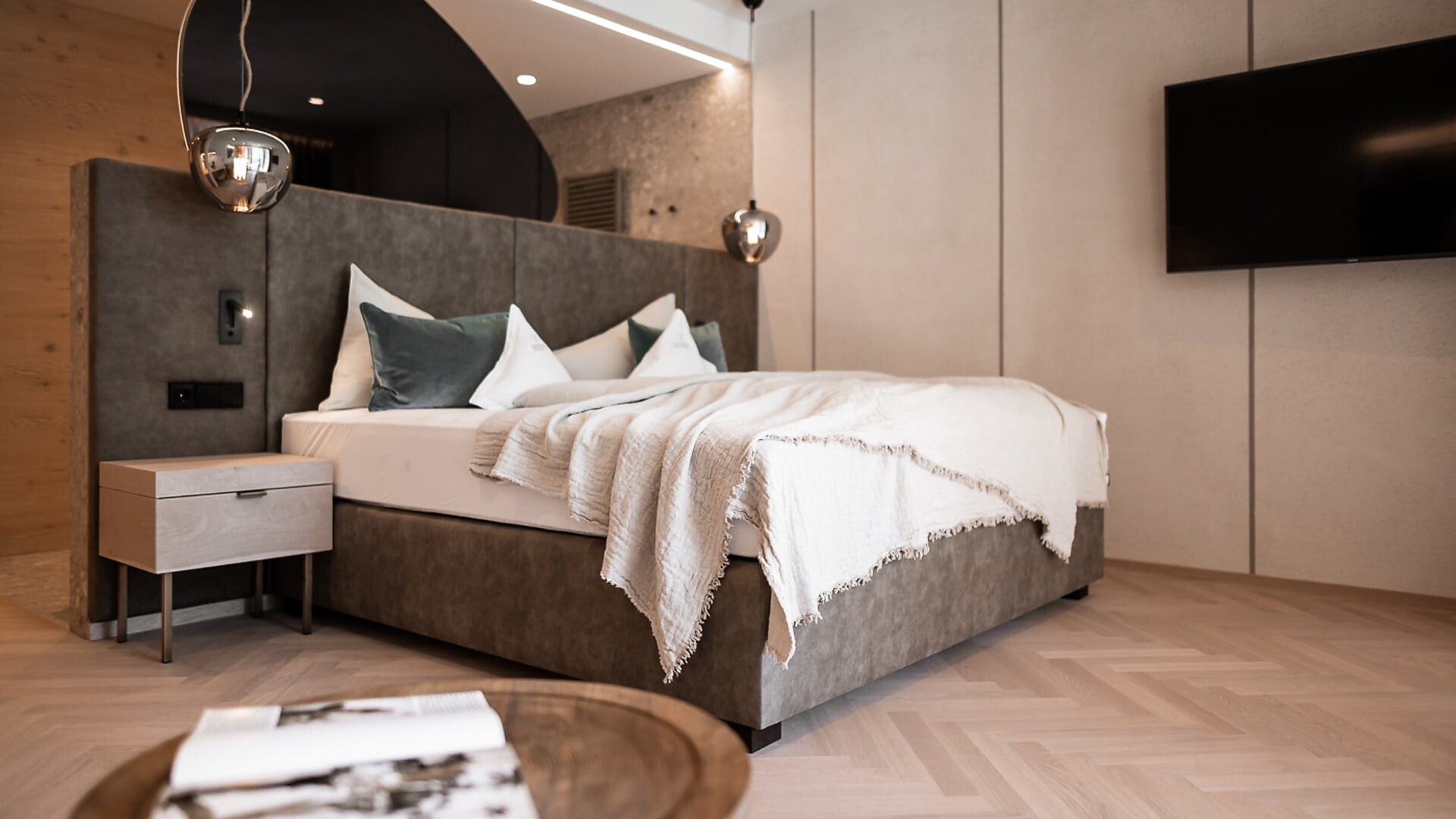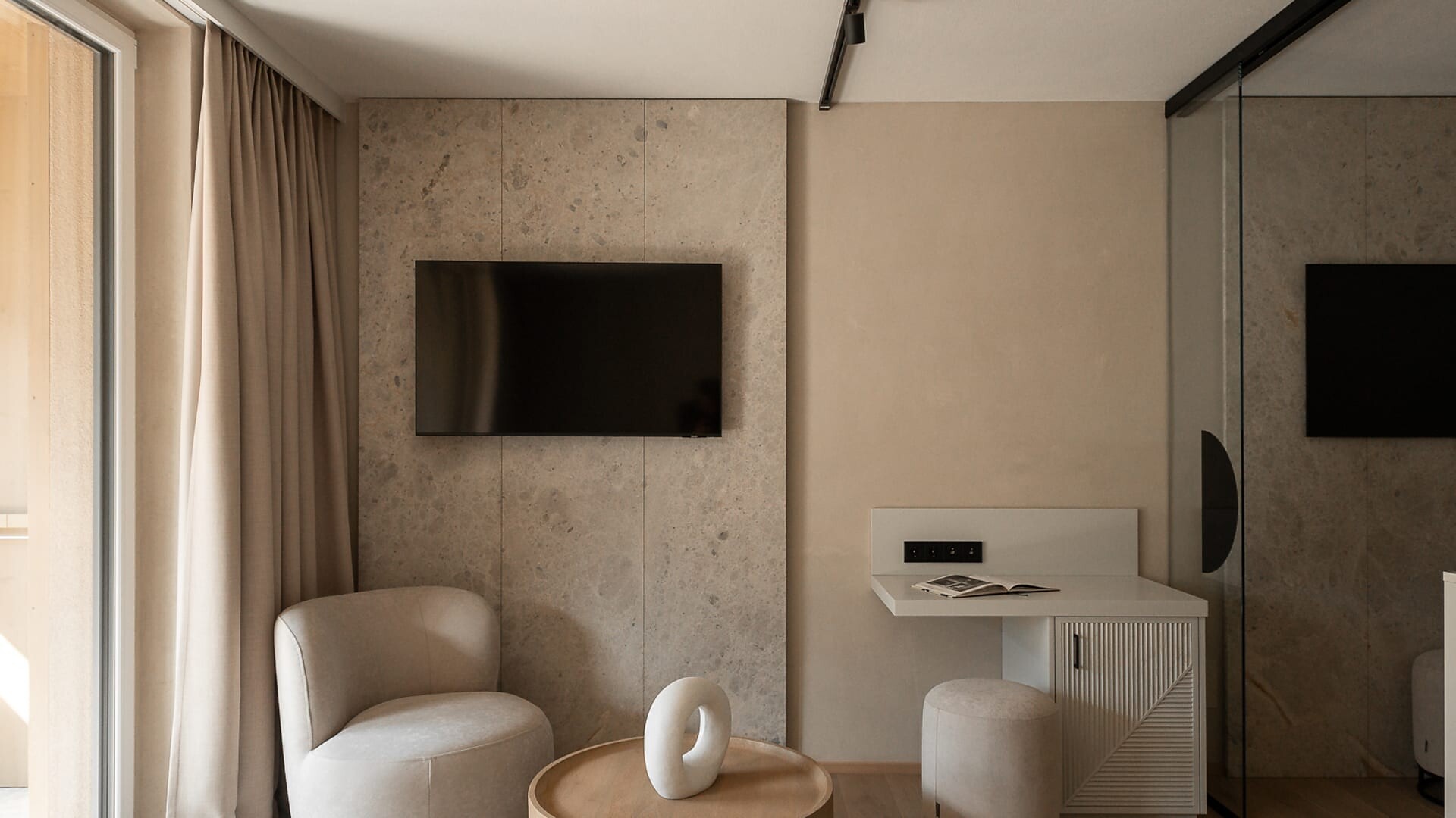 double bedroom with modern living area, parquet flooring, spacious bathroom with walk-in shower/WC, balcony/loggia with modern designer outdoor furniture and 2 chaise lounges for relaxing, air conditioning, flat screen TV, telephone, free Wi-Fi, safe and minibar, including underground parking