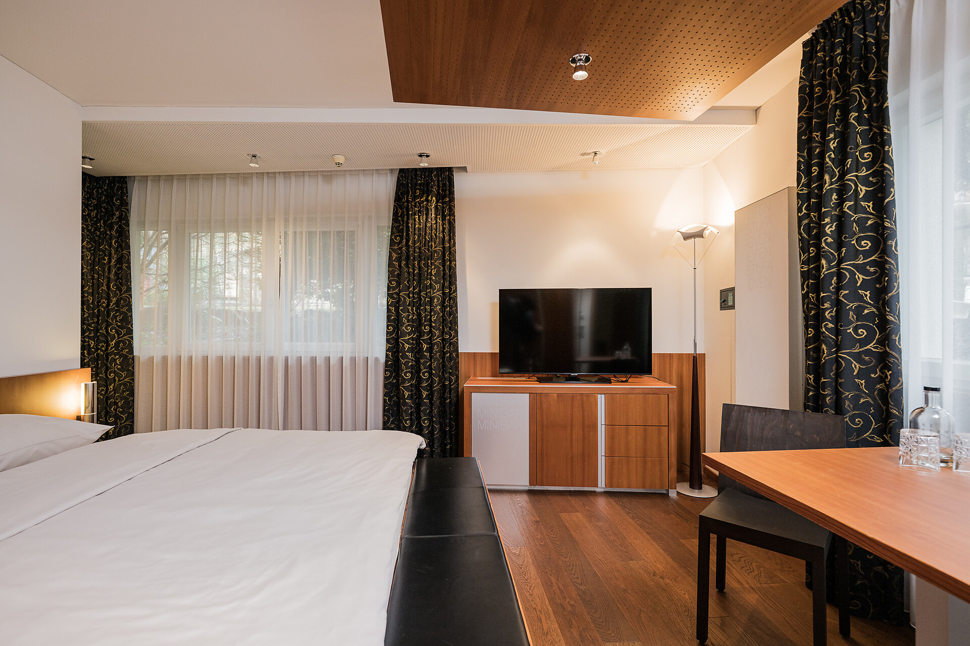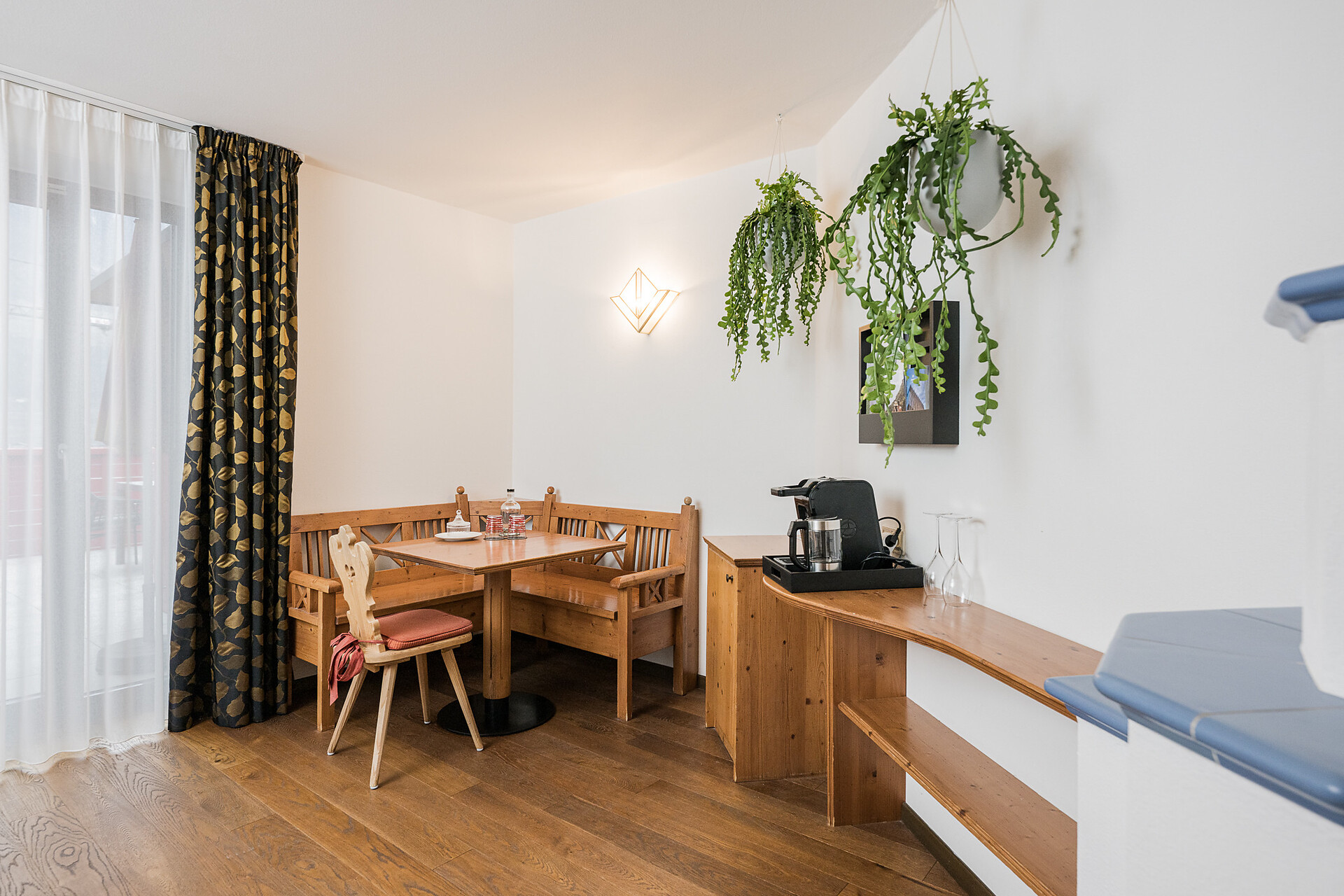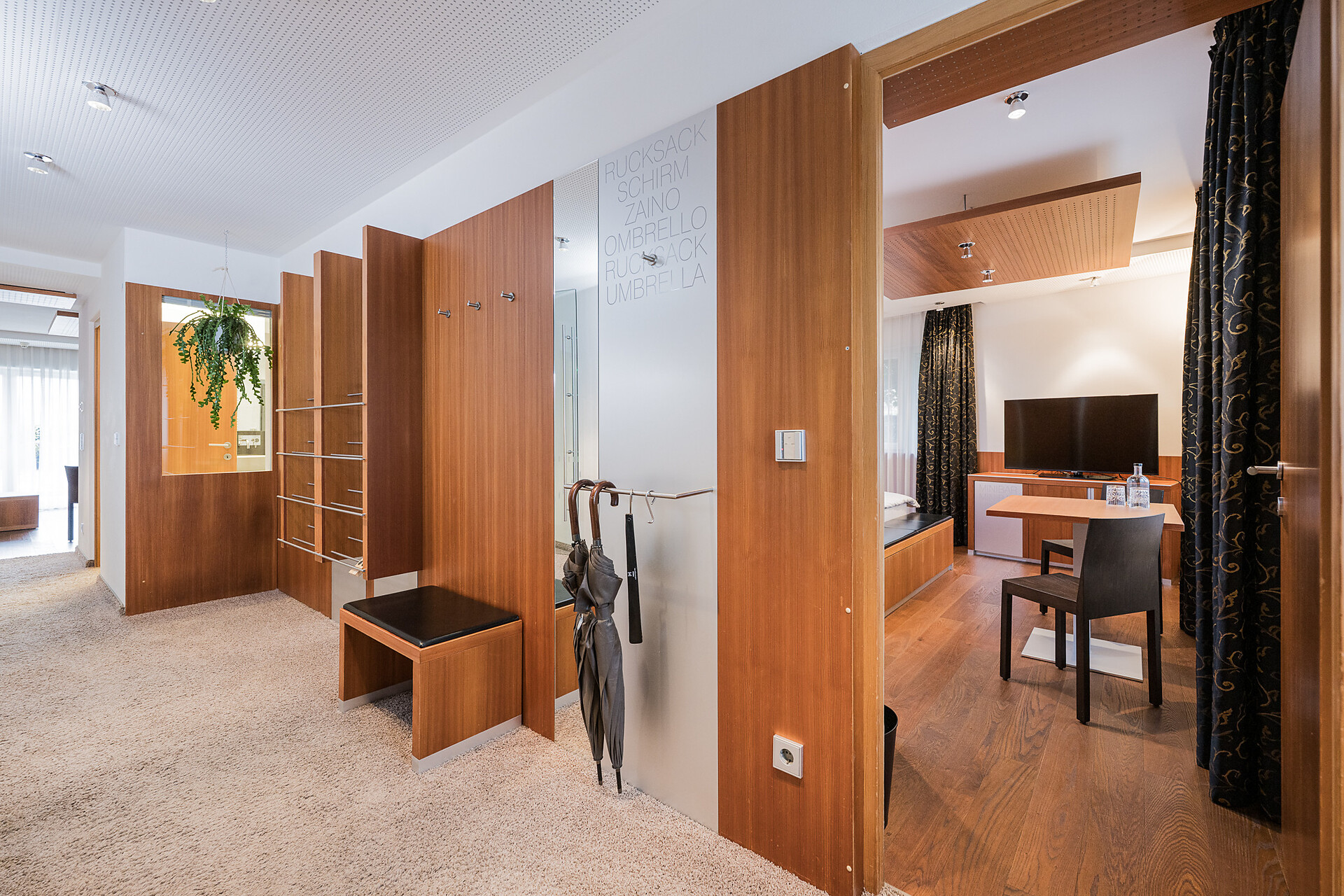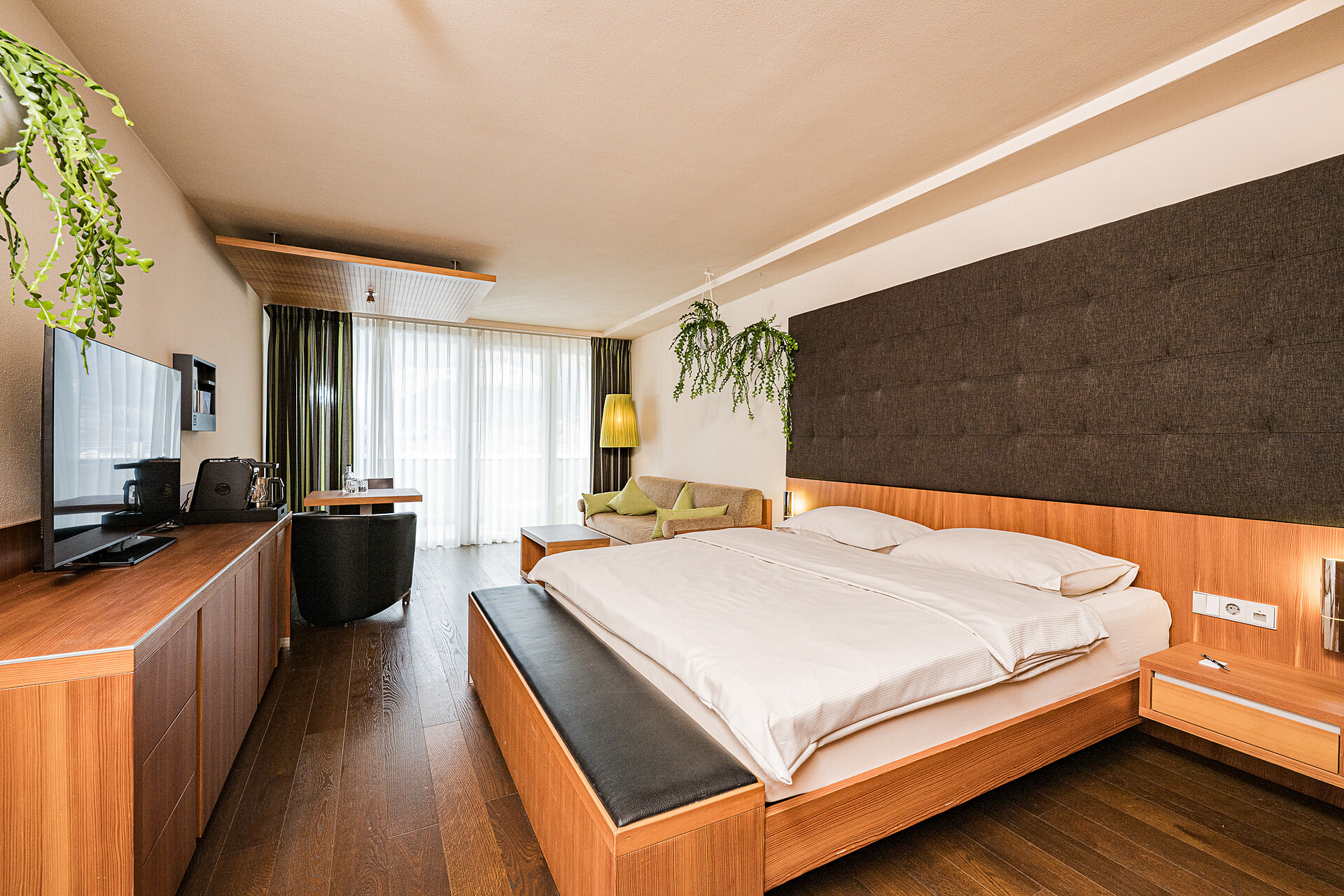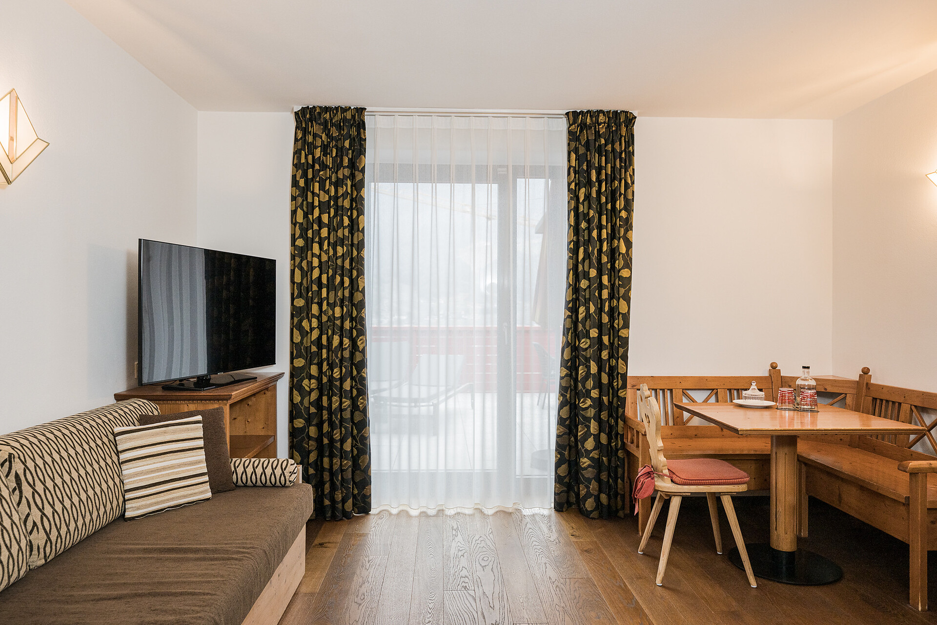 "Stammhaus" suite: a big and beautiful suite on the 5° floor with balcony to the south side, 48m² large, with separate sleeping and living room, shower, bidet, bath tub, furnace, hair dryer, bidet, TV, InterNet connection, safe, garage. NEW: big panorama-terrace with 32m²,