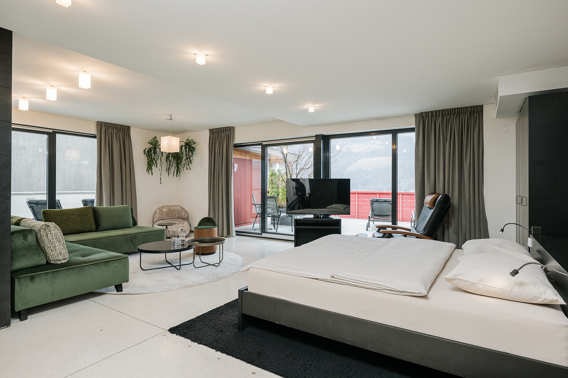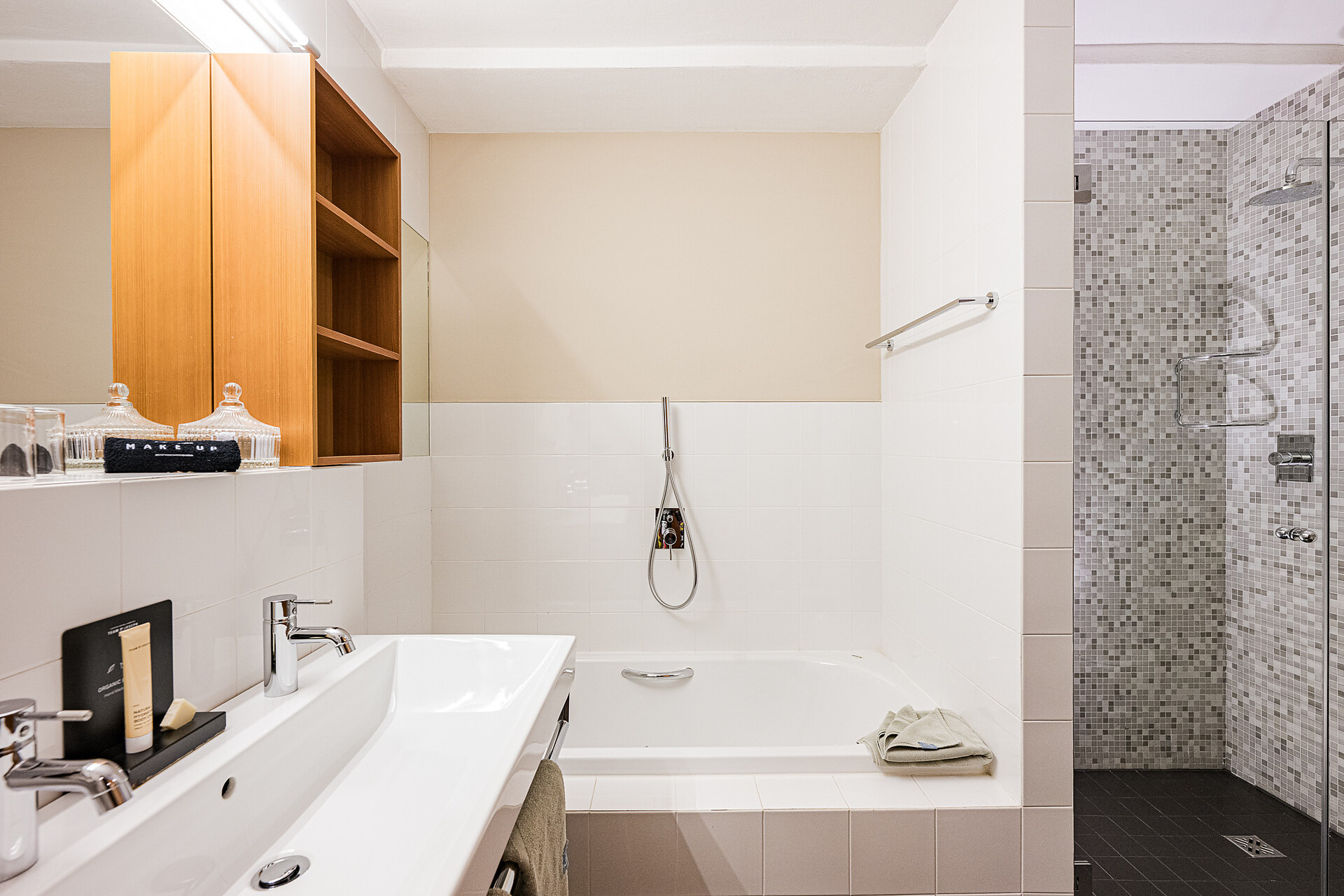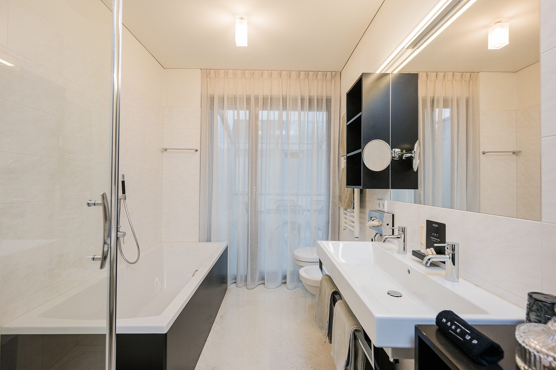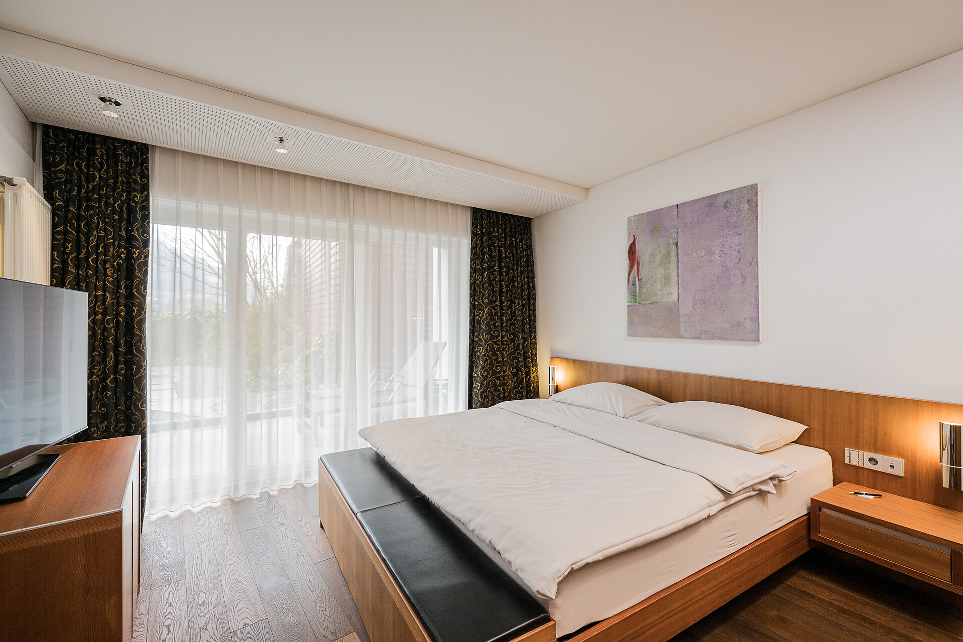 "Stammhaus" suite: a big and beautiful suite on the 5° floor with balcony to the south side, 48m² large, with separate sleeping and living room, shower, bidet, bath tub, furnace, hair dryer, bidet, TV, InterNet connection, safe, garage. NEW: big panorama-terrace with 32m²,
