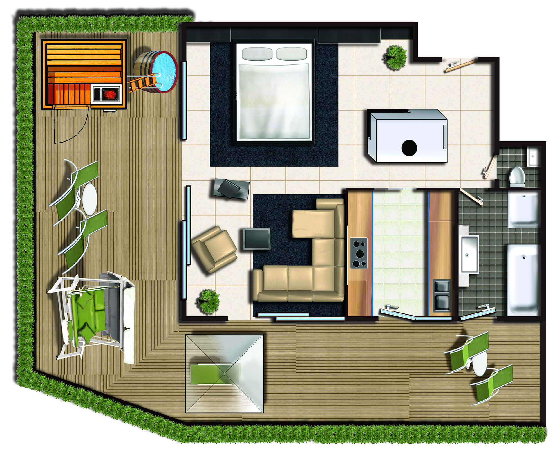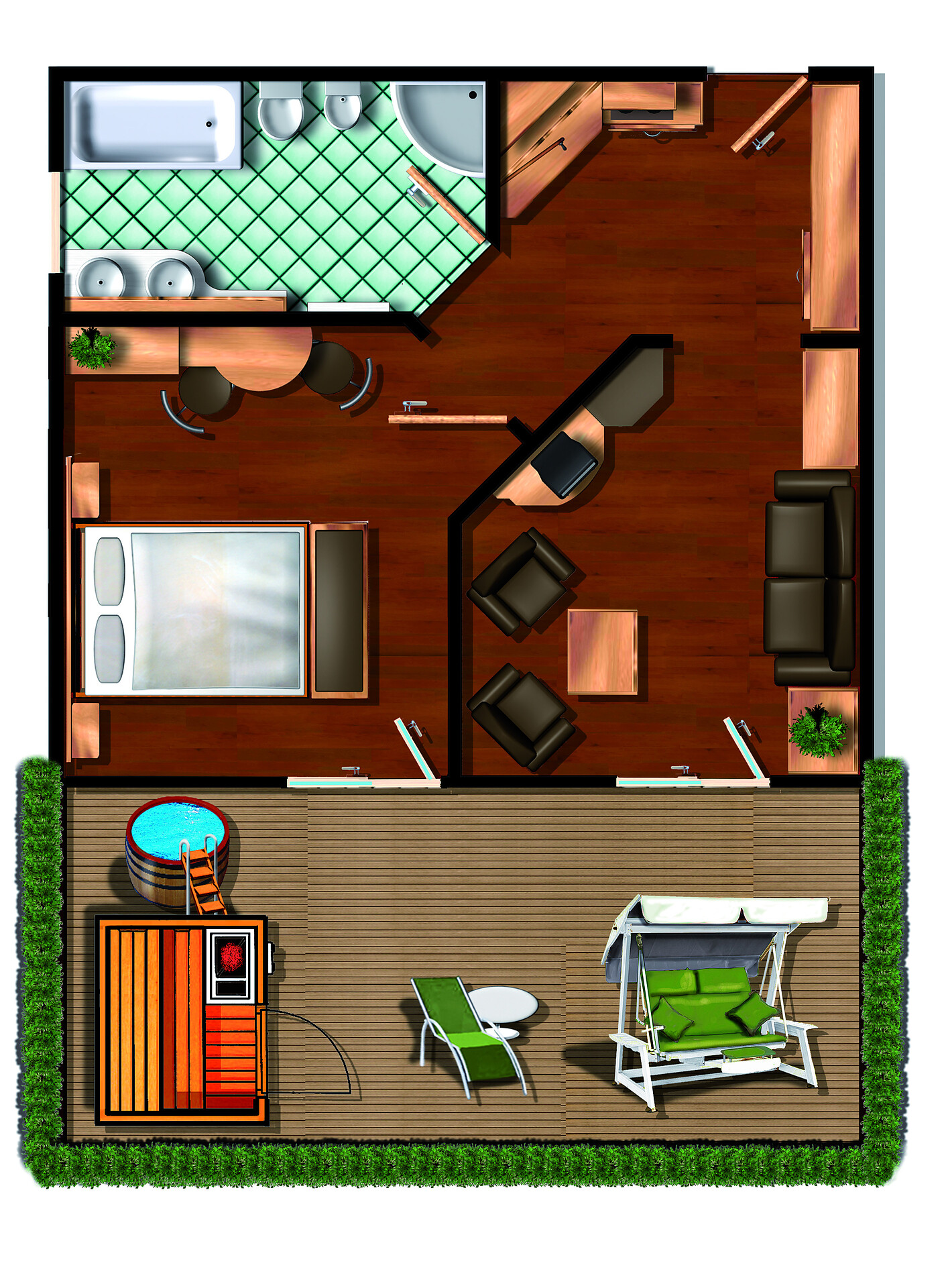 sauna, dip tank, possibility to book a full body massage(to pay) of the terrace