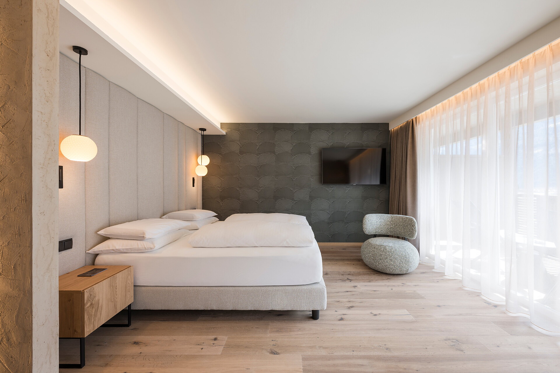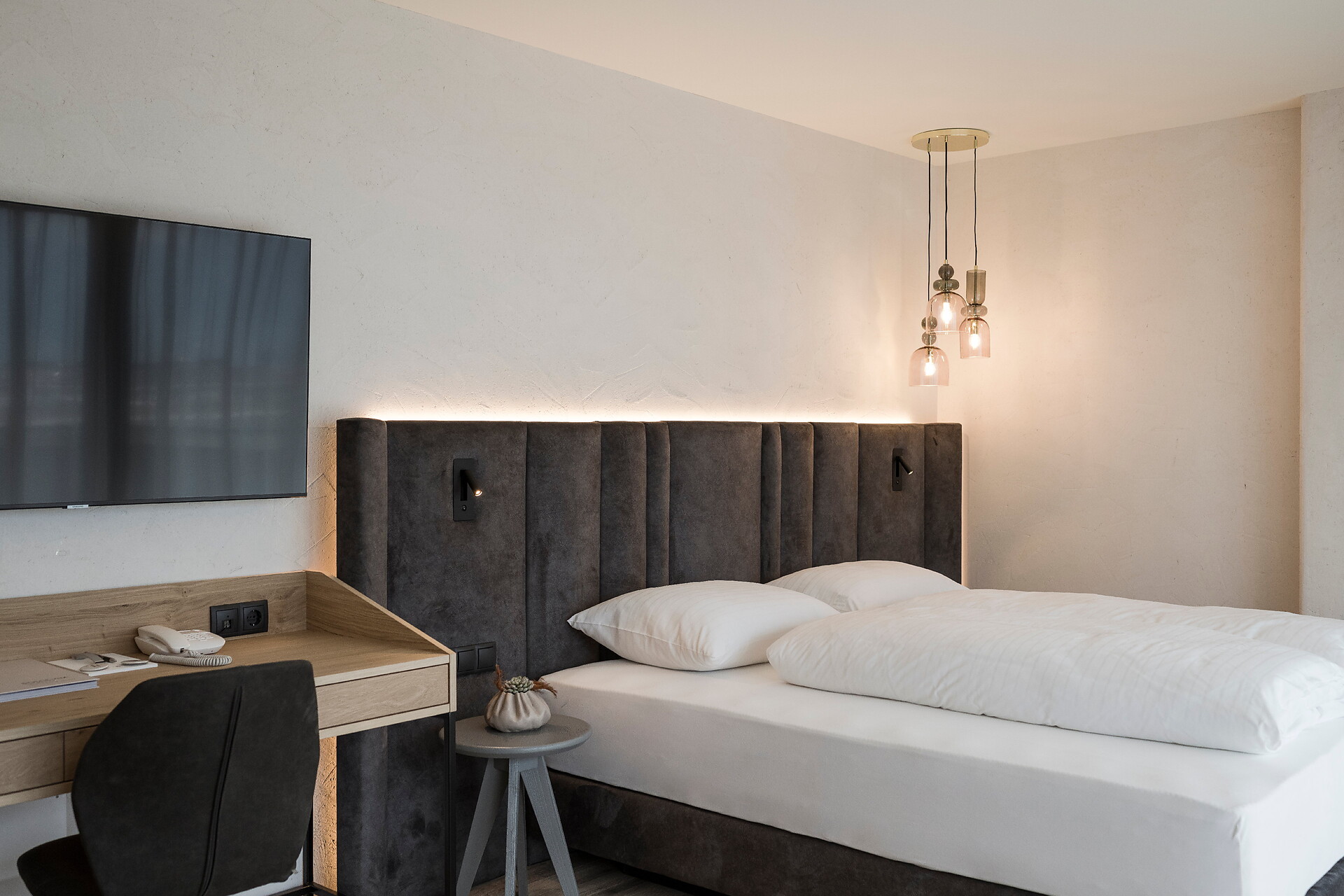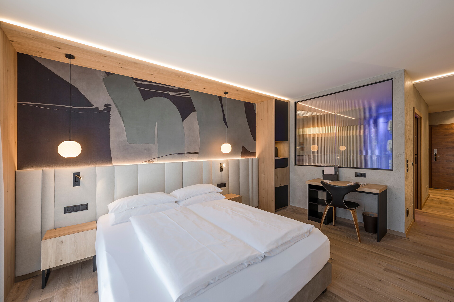 32 m² - Wake up to playful rays of sunlight. Our Sunshine double room features a comfortable seating corner and armchair, wooden floor, natural wood furniture, modern bathroom with walk-in shower, separate toilet, minibar, safe, flat screen TV, telephone, free WiFi, south-facing balcony with relax lounger, a garage parking space and air conditioning.