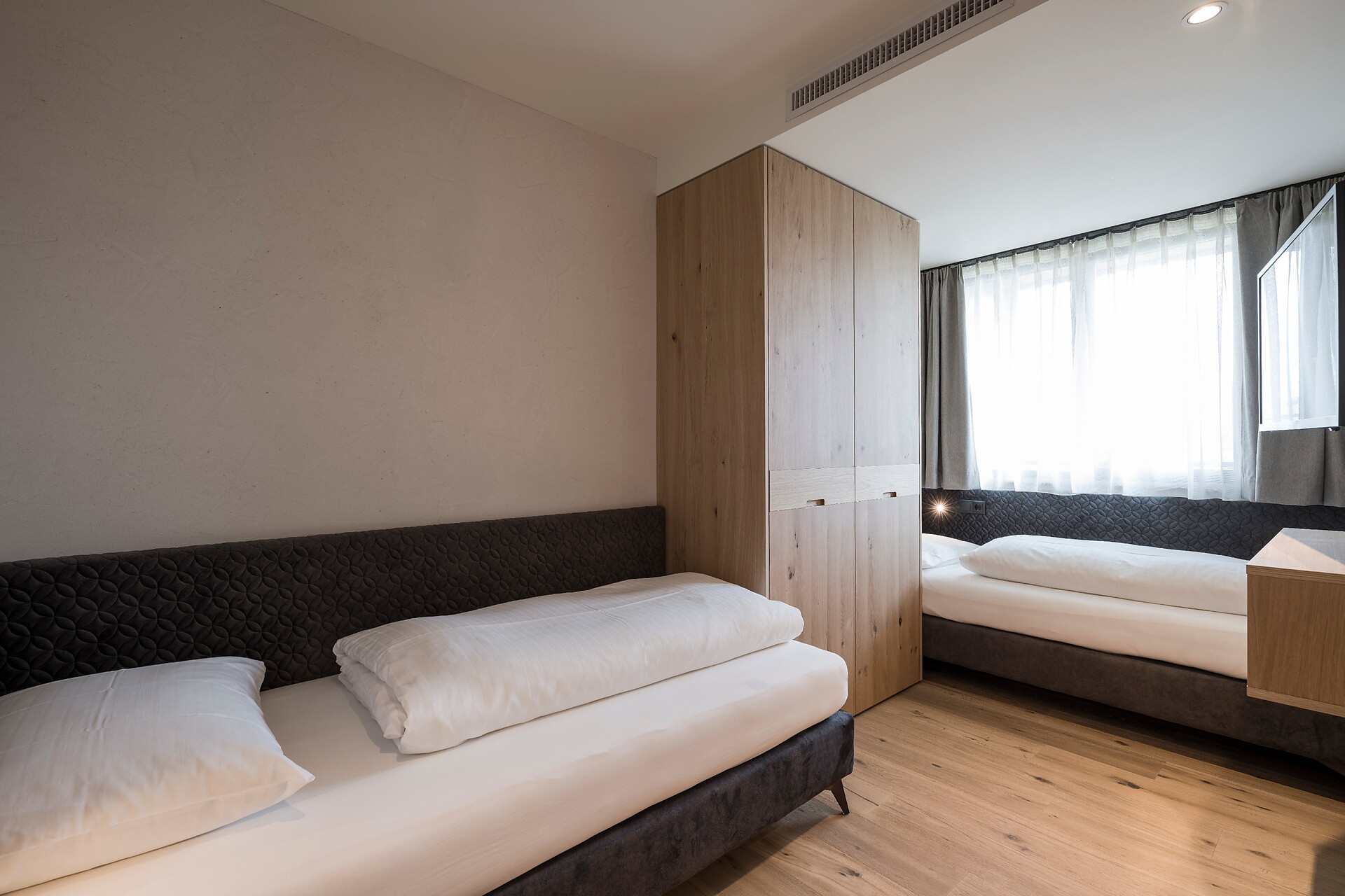 50 m² - More space for more wellbeing. With an exclusive appointed living room with comfortable seating corner, wooden floor, natural wood furniture, separate children's room with two single beds, modern bathroom with large walk-in shower, double basin, separate toilet, minibar, safe, 3 flat screen TV, telephone, free WiFi, north-facing balcony, a garage parking space and air conditioning.