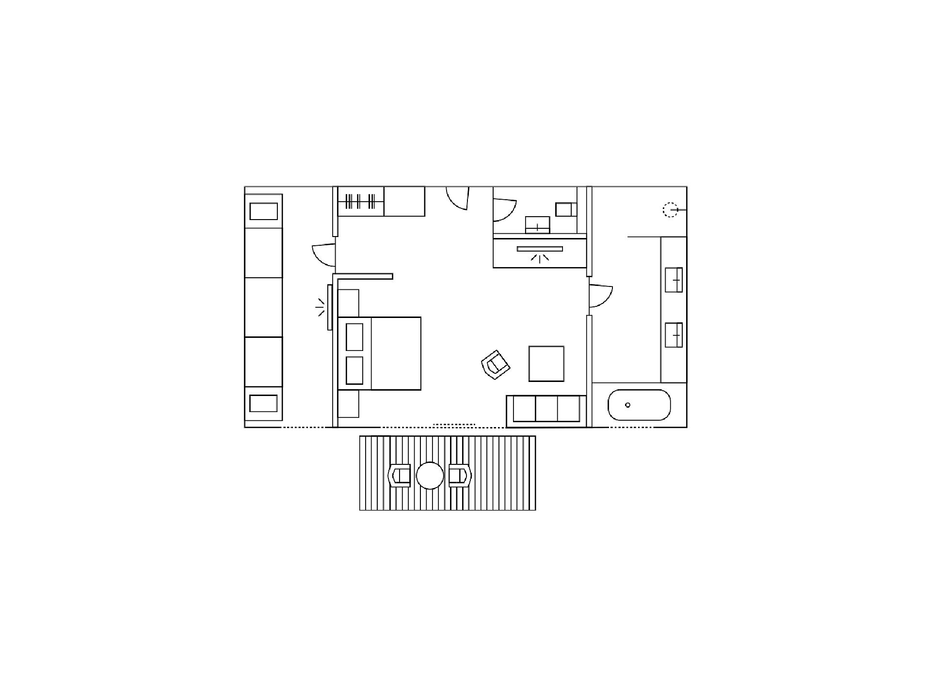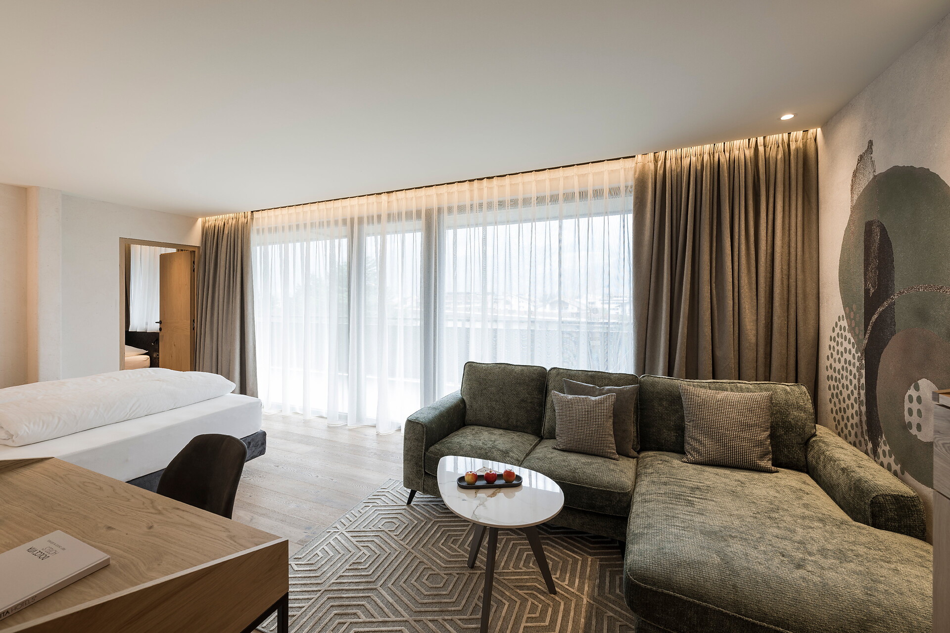 50 m² - Bright and friendly suite with an exclusive appointed living room with comfortable seating corner, wooden floor, natural wood furniture, separate children's room with two single beds, modern bathroom with large walk-in shower, double bathtub, double basin, separate toilet, minibar, safe, 2 flat screen TV, telephone, free WiFi, north-facing balcony, a garage parking space and air conditioning.